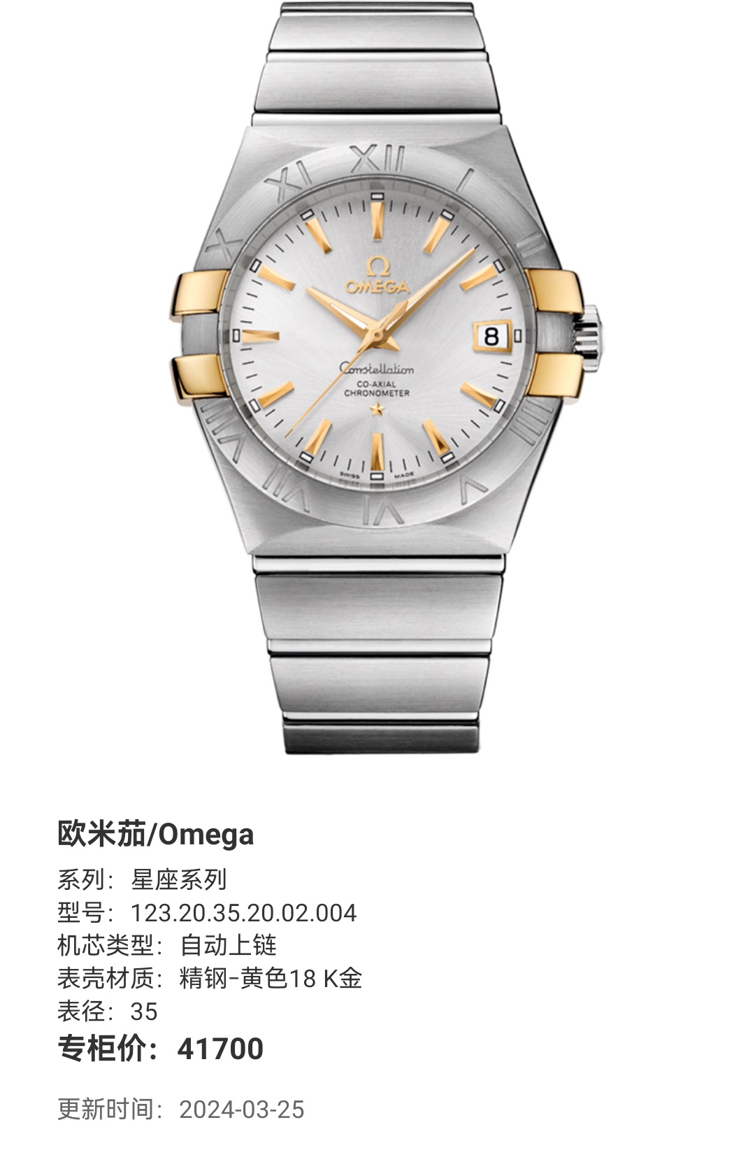 欧米茄/Omega 星座系列 金耳朵123.20.35.20.02.004 自动机械2500机芯 精钢‑黄色18K金 35毫米表径 专柜价41700