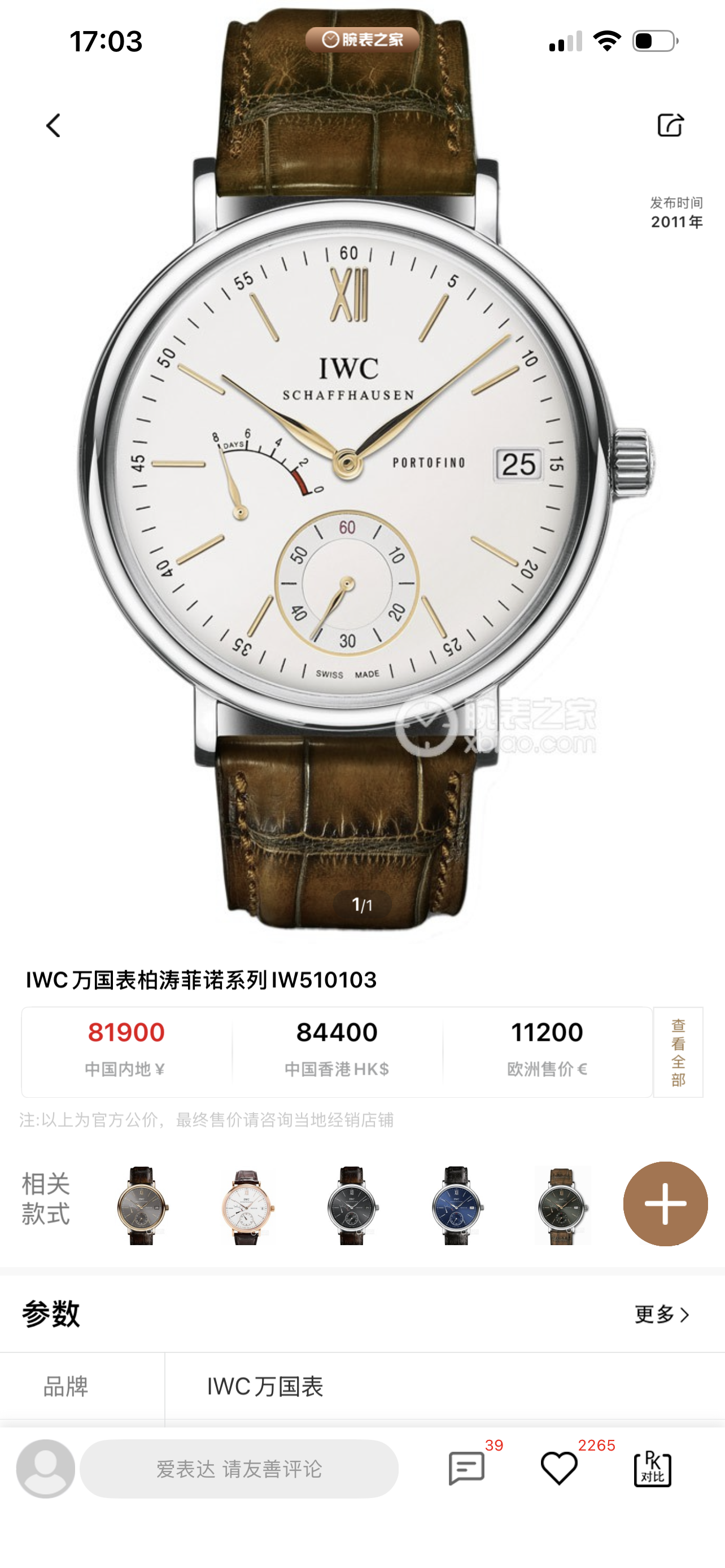 万国柏涛菲诺IW510103机械男性