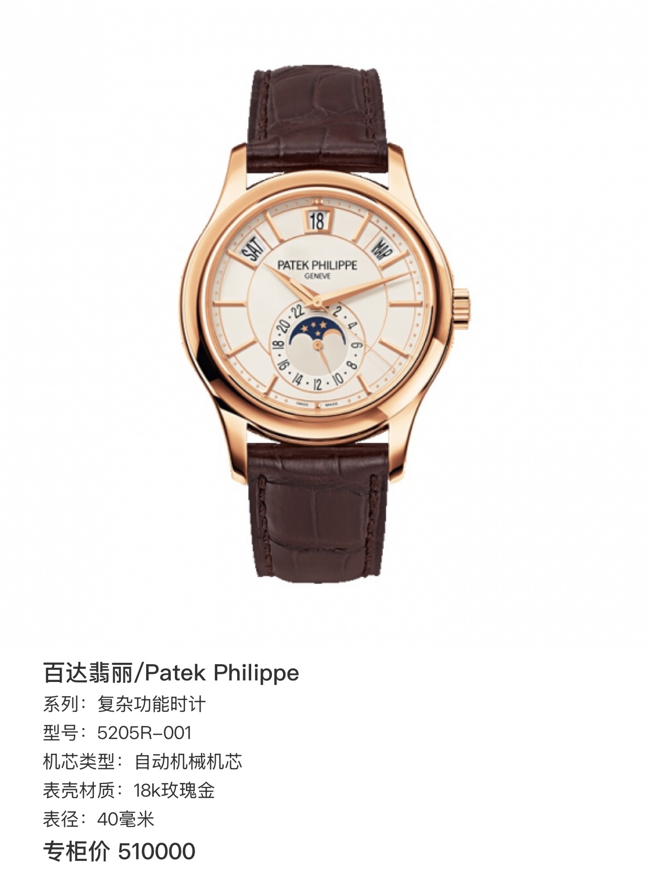 百达翡丽/Patek Philippe 复杂功能时计 5205R-001 自动机械机芯 18k玫瑰金 40毫米 专柜价510000
