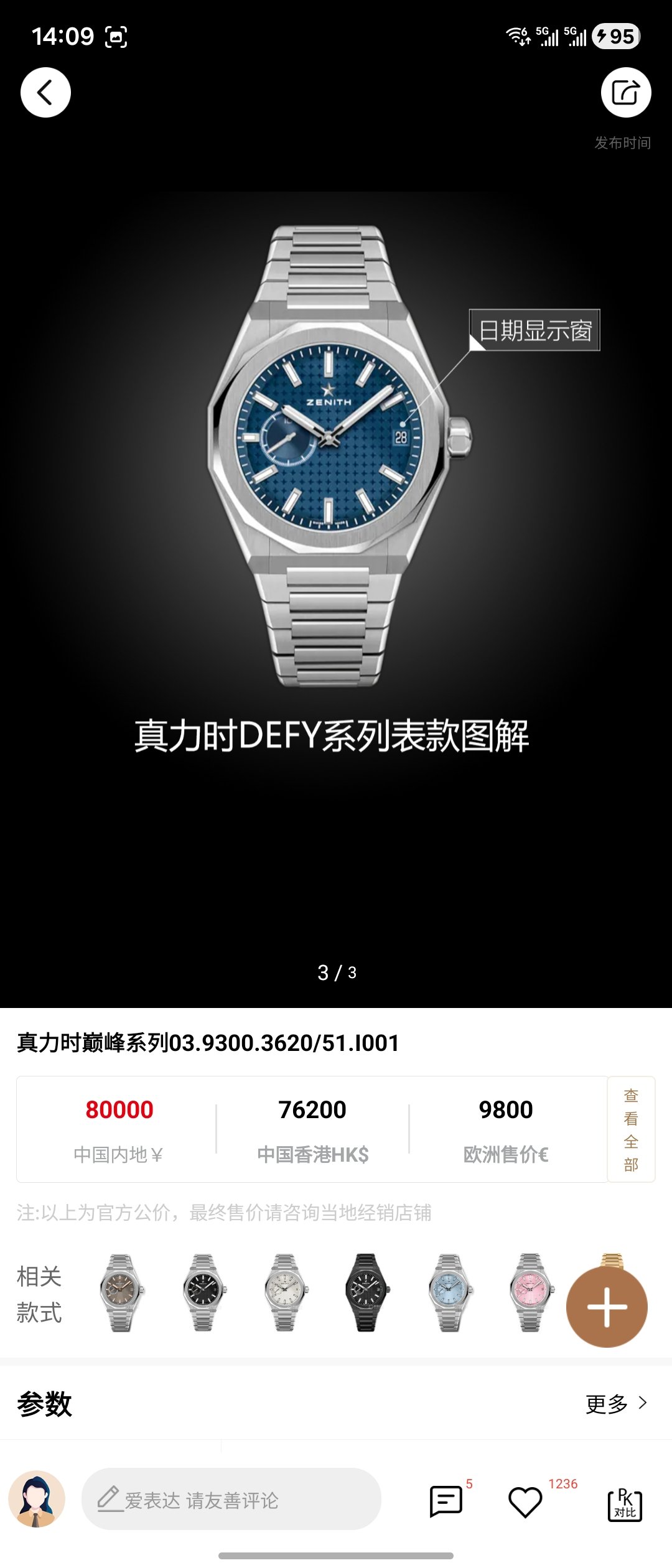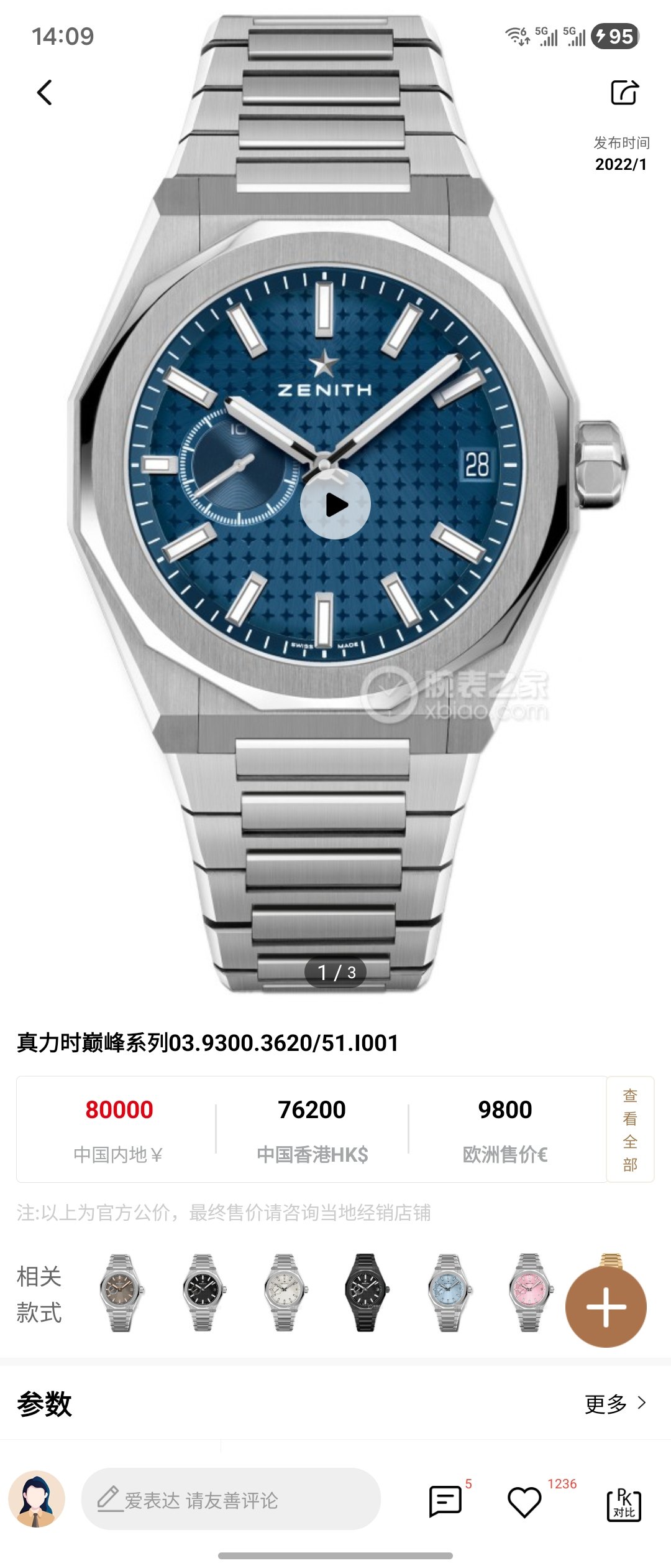 真力时/Zenith DEFY系列 03.9300.3620/51.I001 自动上链 精钢 41毫米 专柜价77400 国行未使用,近期卡,双表带