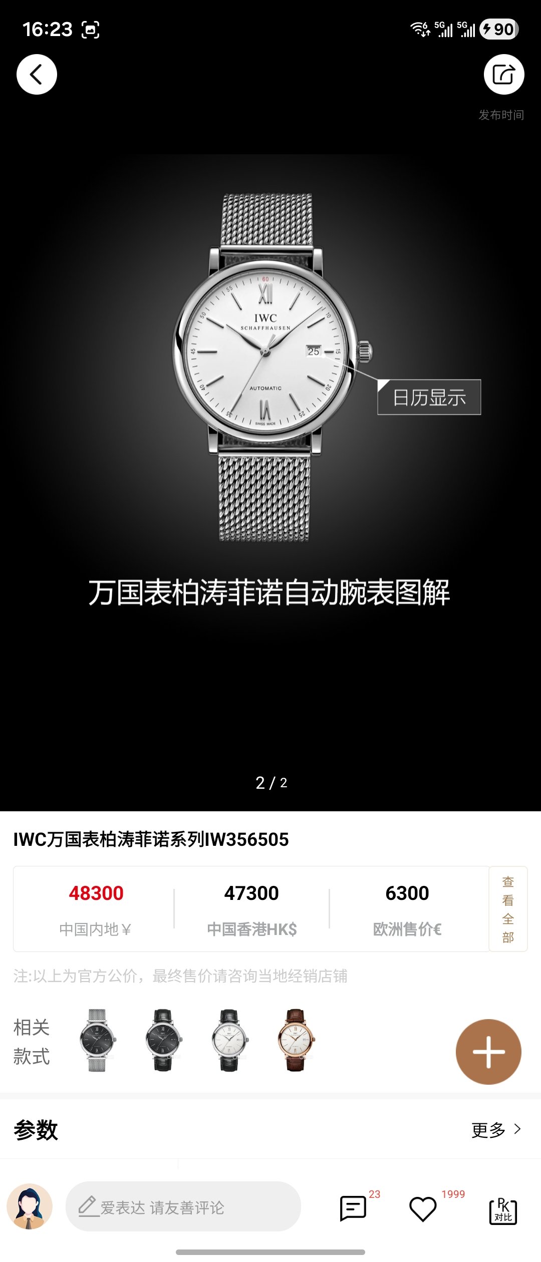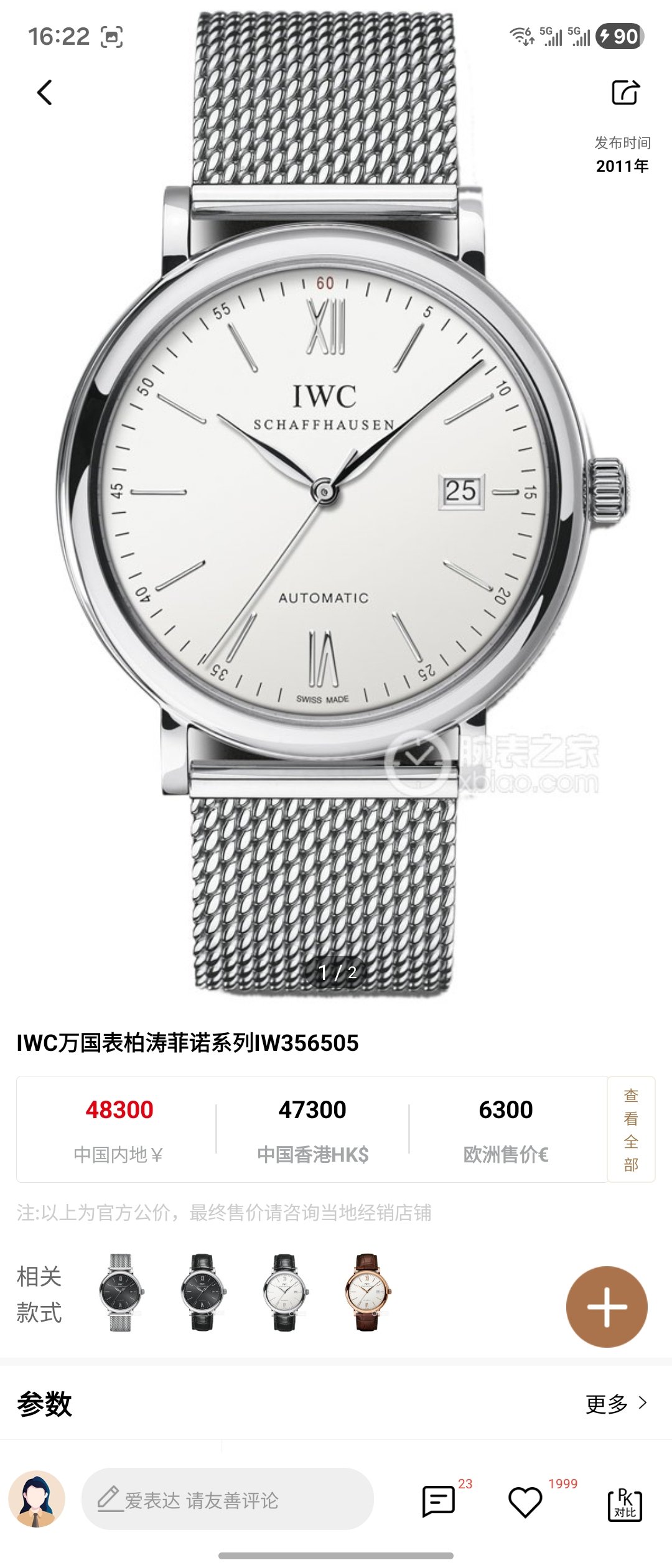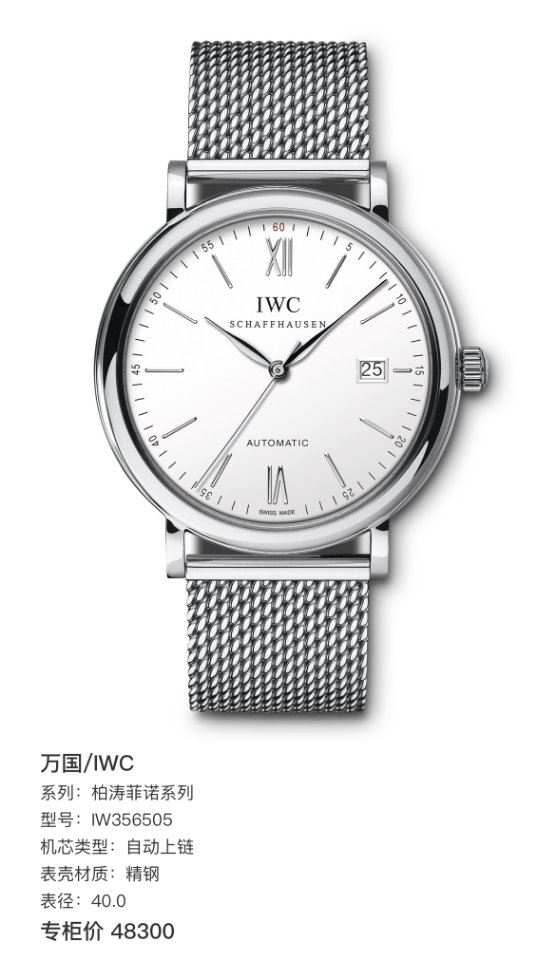万国/IWC 柏涛菲诺系列 IW356505 自动上链 精钢 40.0 专柜价48300 当天卡 ,国行未使用