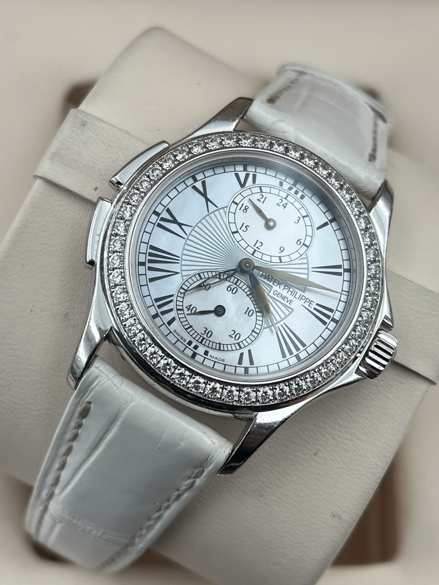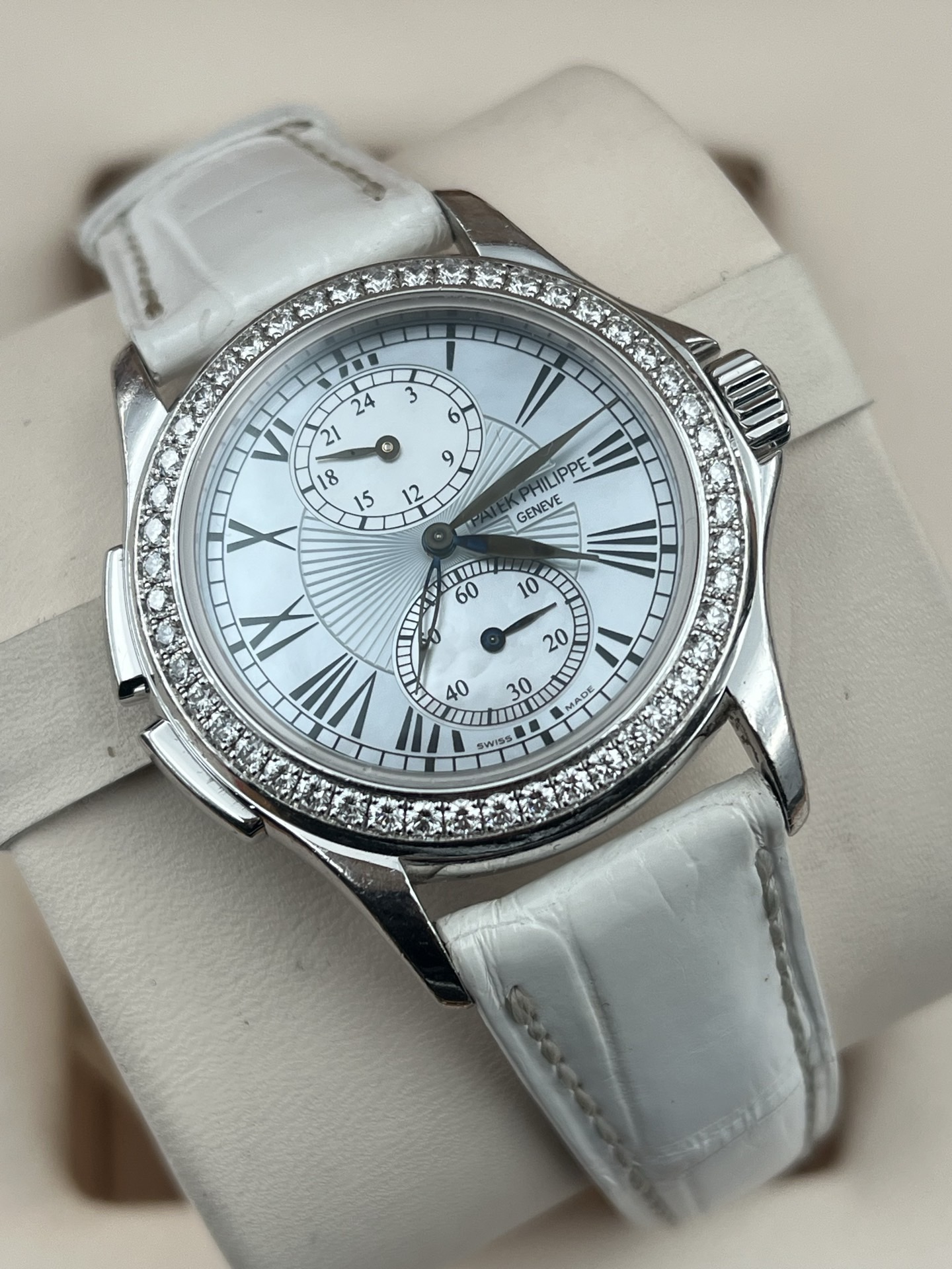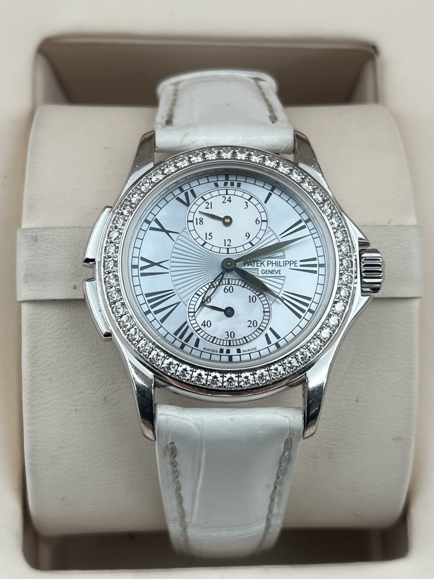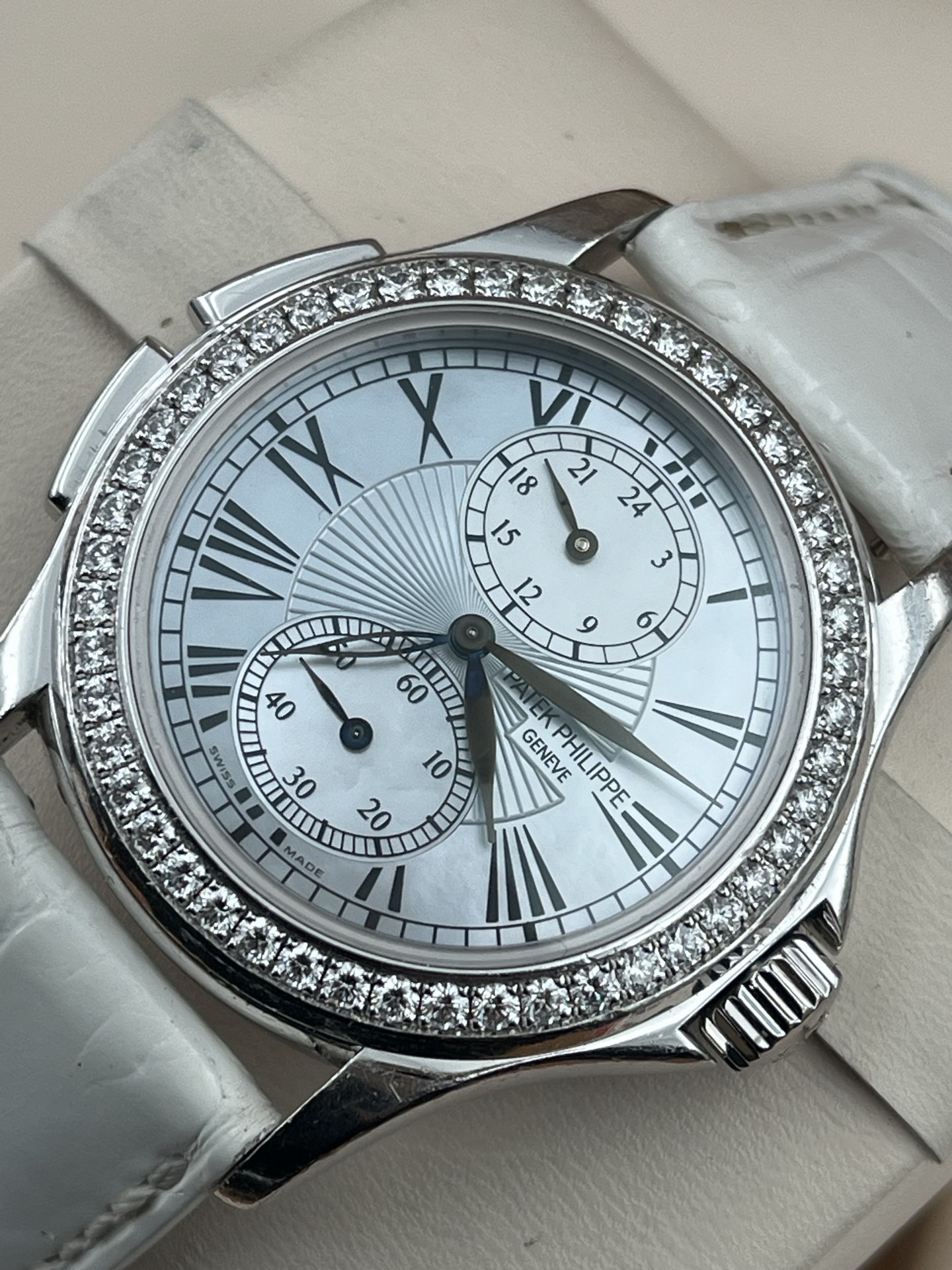 百达翡丽古典表系列4934G-001、女士手动机械腕表、表径:35mm、材质:18K白金/鳄鱼皮带、银白色珍珠贝母盘面、罗马数字刻度、双时区、背透、外圈原钻、全套附件(少盒子)、整表原始品相 新成色、原价280400