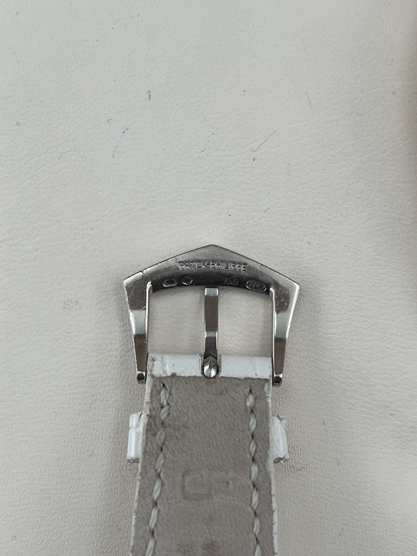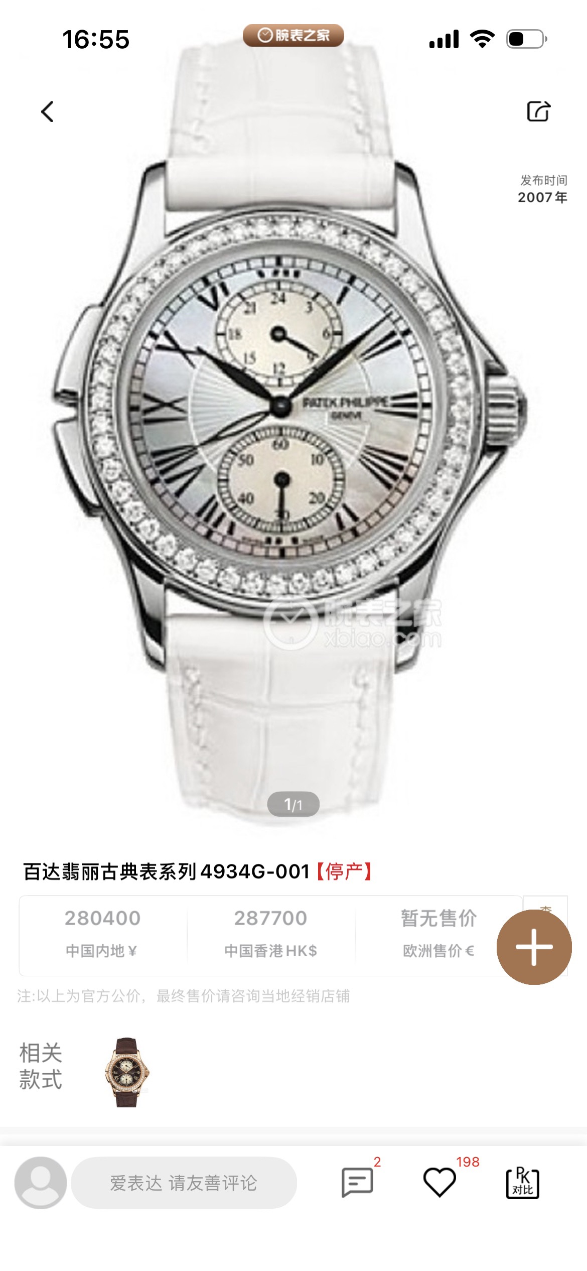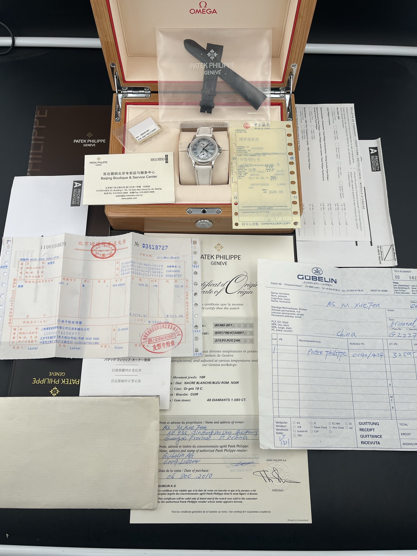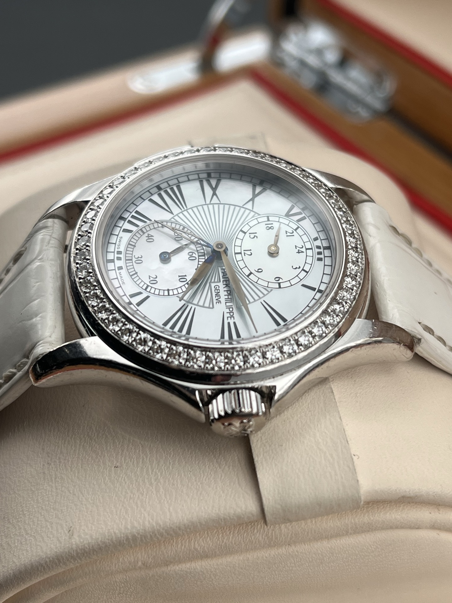百达翡丽古典表系列4934G-001、女士手动机械腕表、表径:35mm、材质:18K白金/鳄鱼皮带、银白色珍珠贝母盘面、罗马数字刻度、双时区、背透、外圈原钻、全套附件(少盒子)、整表原始品相 新成色、原价280400