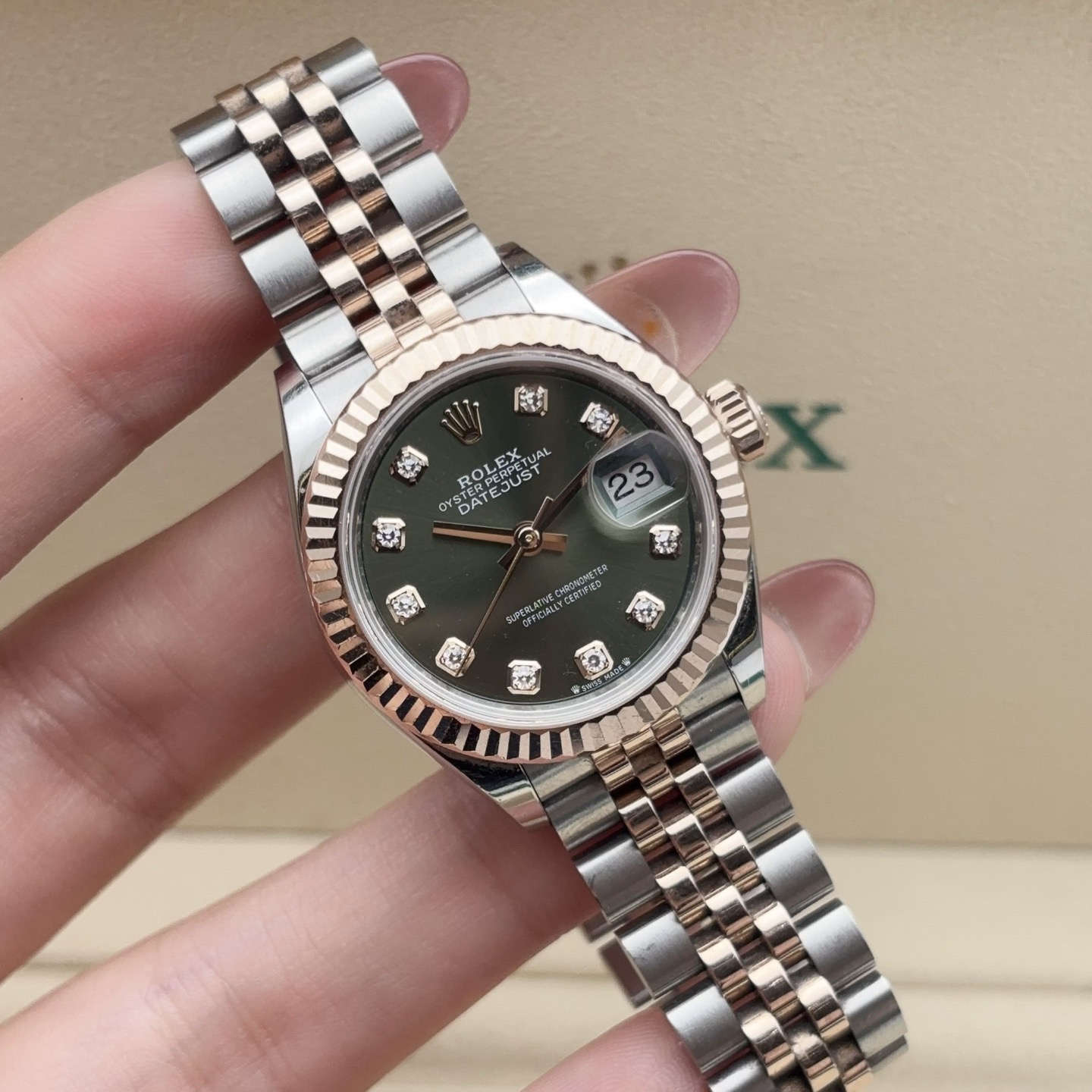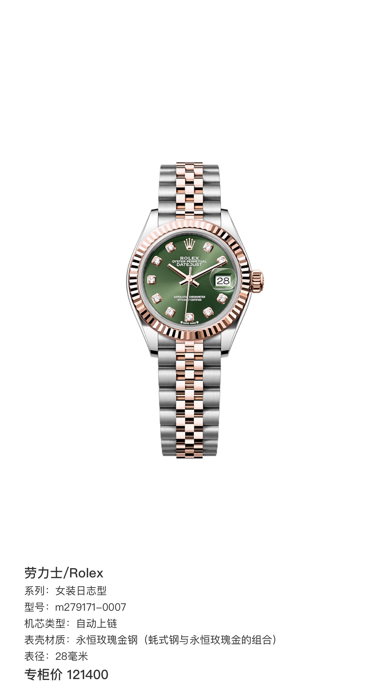 劳力士/Rolex 女装日志型 m279171-0007 自动上链 永恒玫瑰金钢(蚝式钢与永恒玫瑰金的组合) 28毫米 专柜价121400。