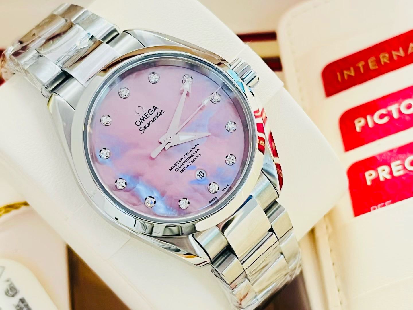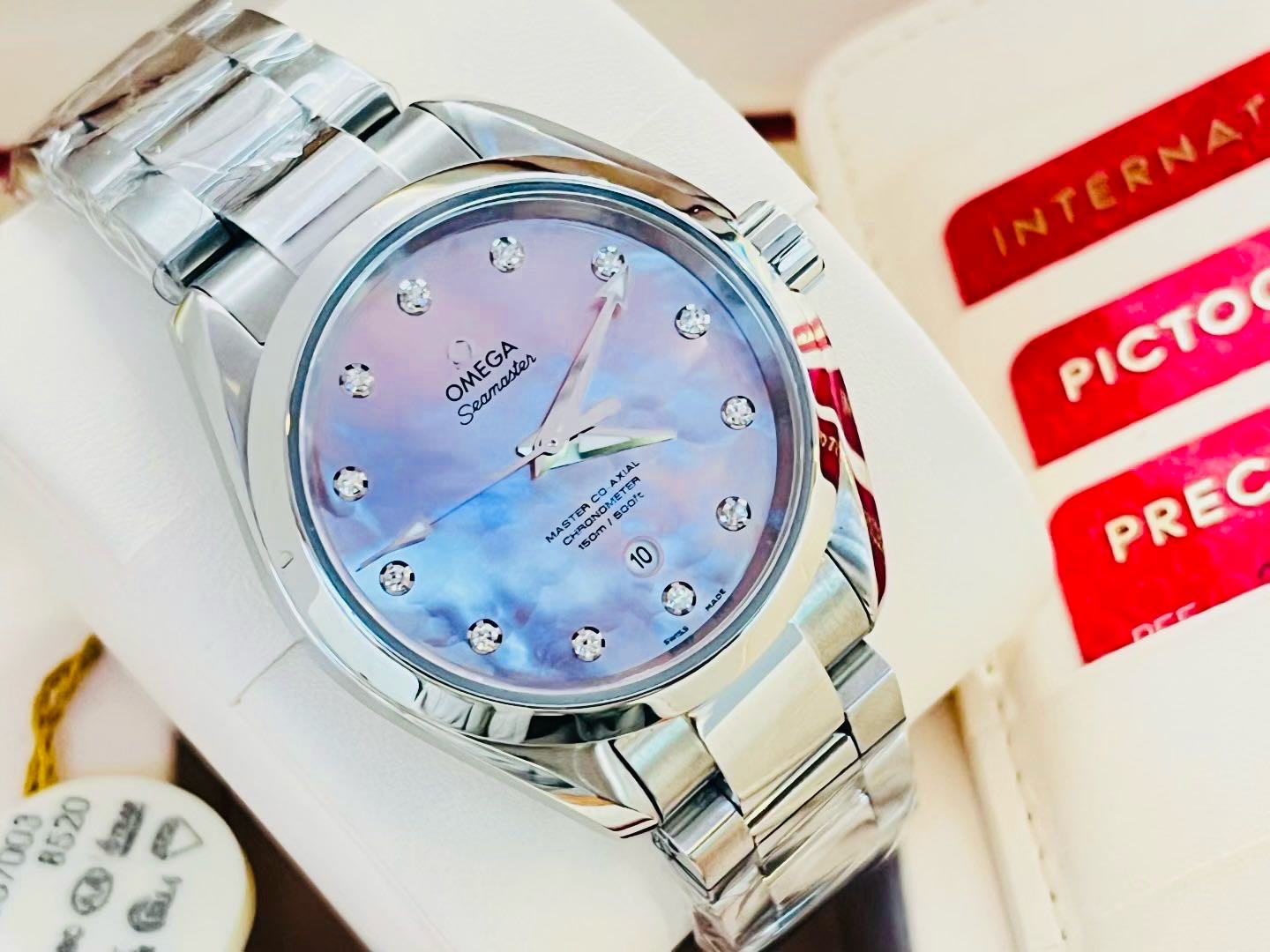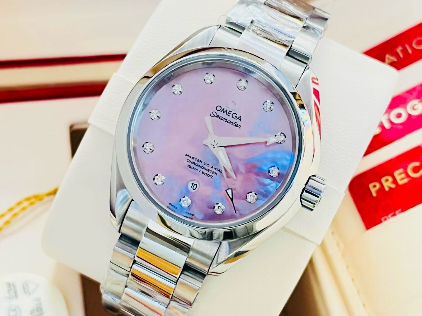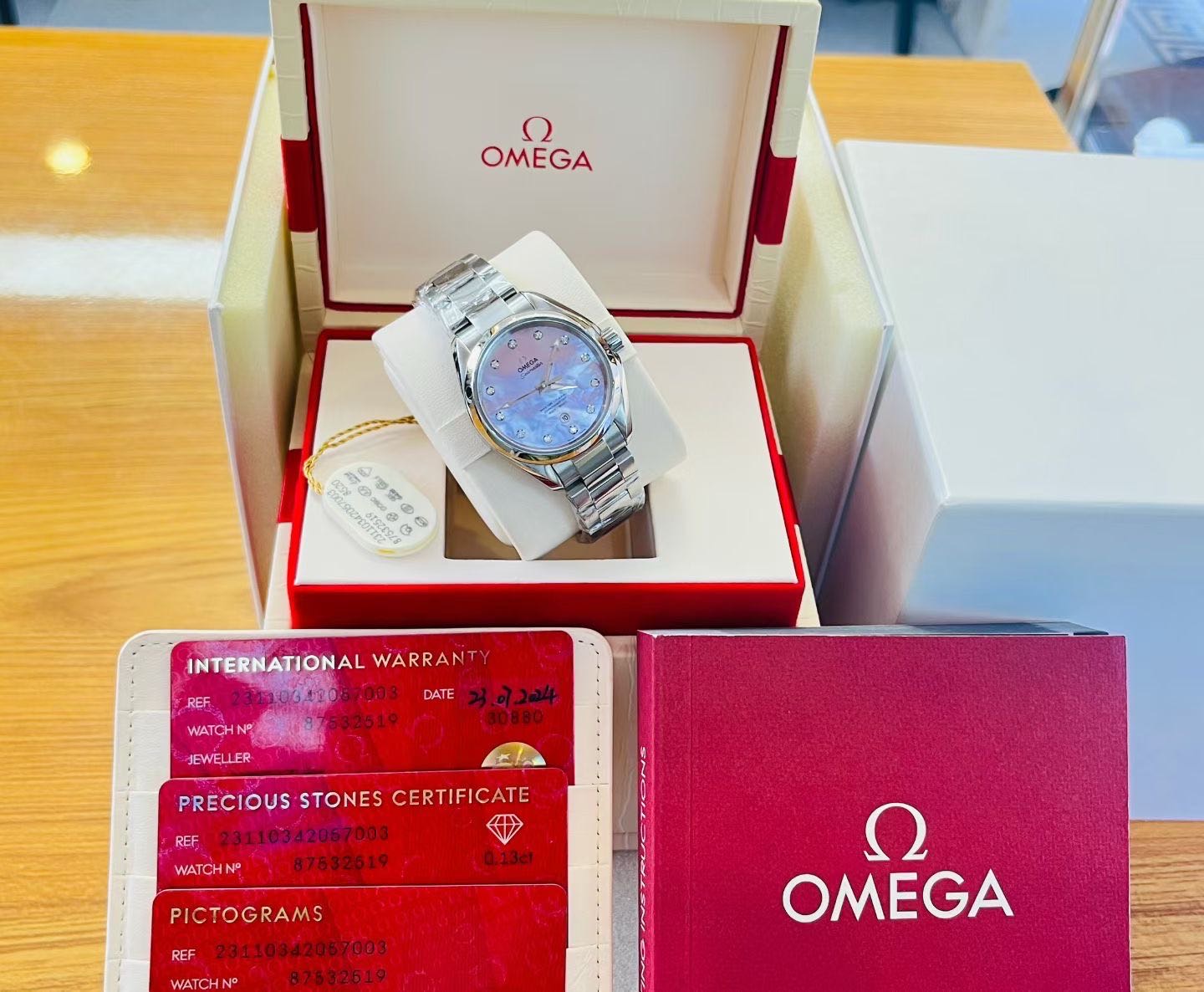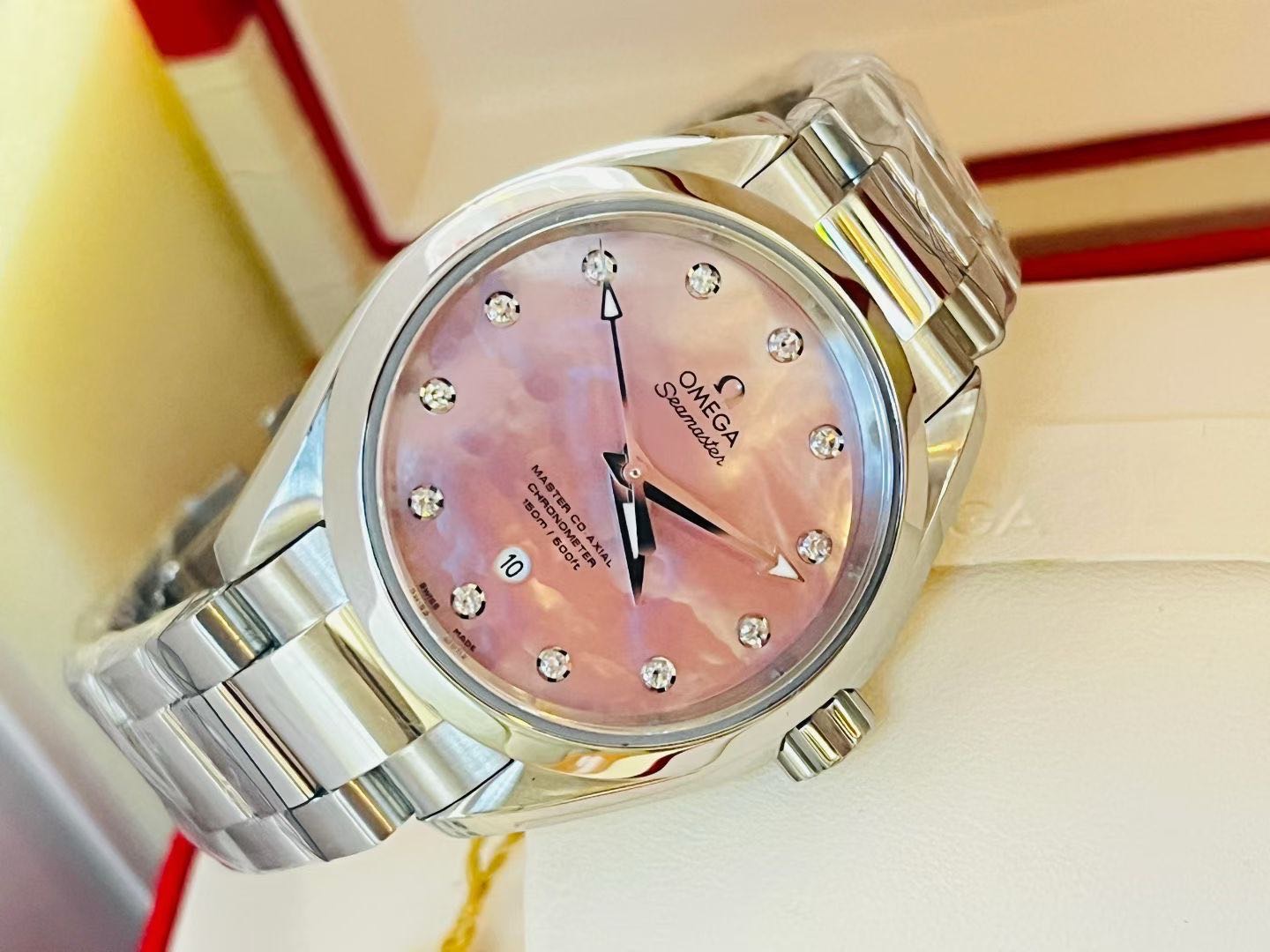 欧米茄海马系列 231.10.34.20.57.003。 海马150 粉贝母钻刻 贝母典雅粉盘 AT8520自动机械机芯 。2024年7月份全套购入。品相完美!表径 34mm。公价50900,实物超级漂亮的钻刻粉贝母表盘!现极品大全套好价