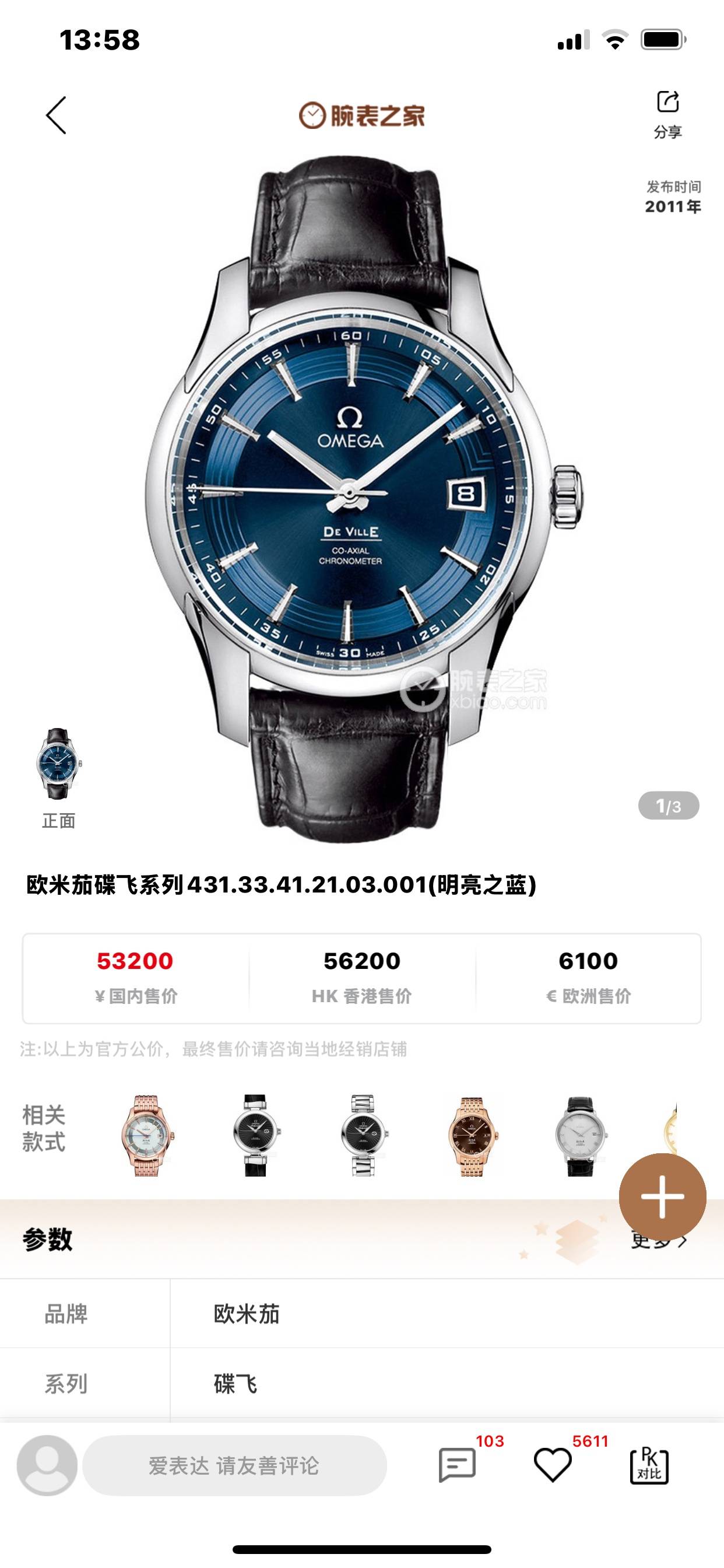 欧米茄 蓝盘 19年购买保卡 总重82.62克