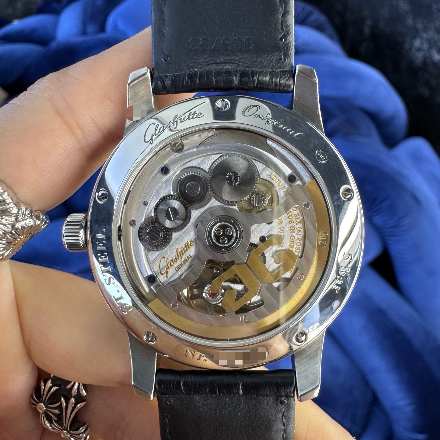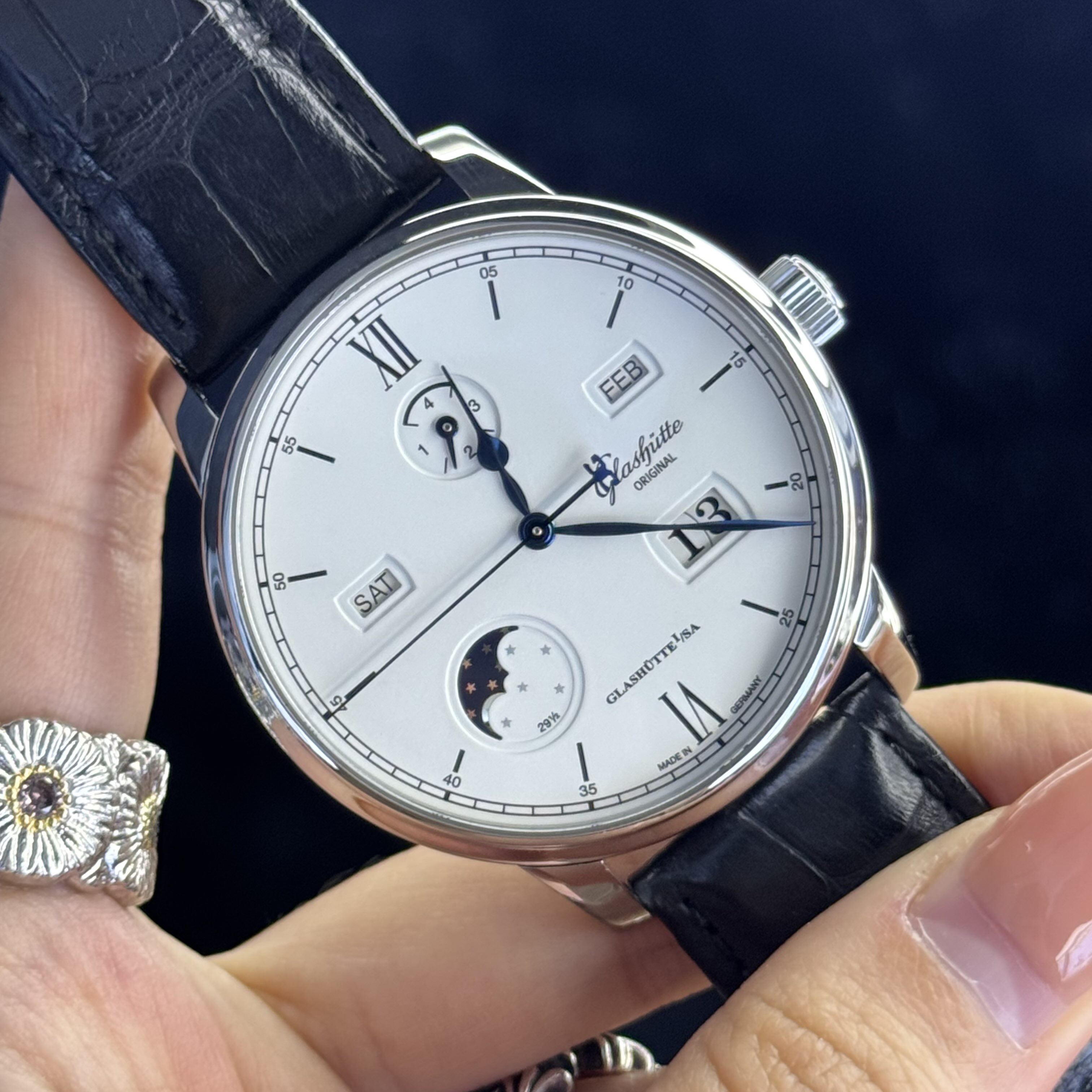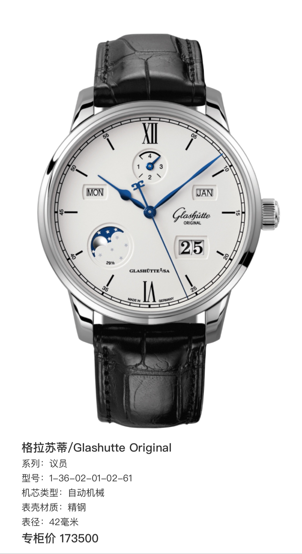 24年全套,格拉苏蒂议员系列1-36-02-01-02-61,42mm表径,精钢表壳,自动机械机芯,背透设计,月相+万年历+大日历+星期+月份显示,折叠扣 走时精准,附件齐全