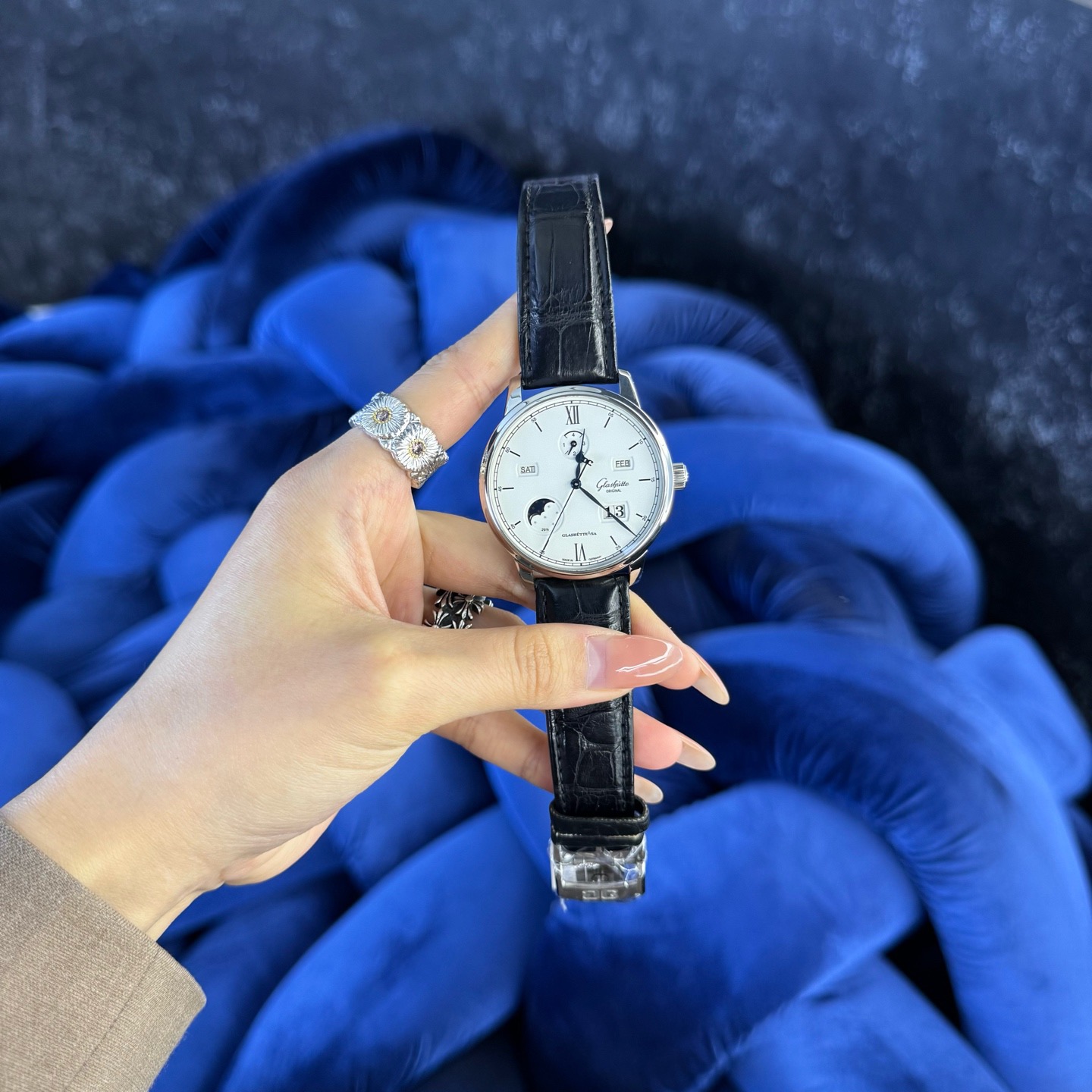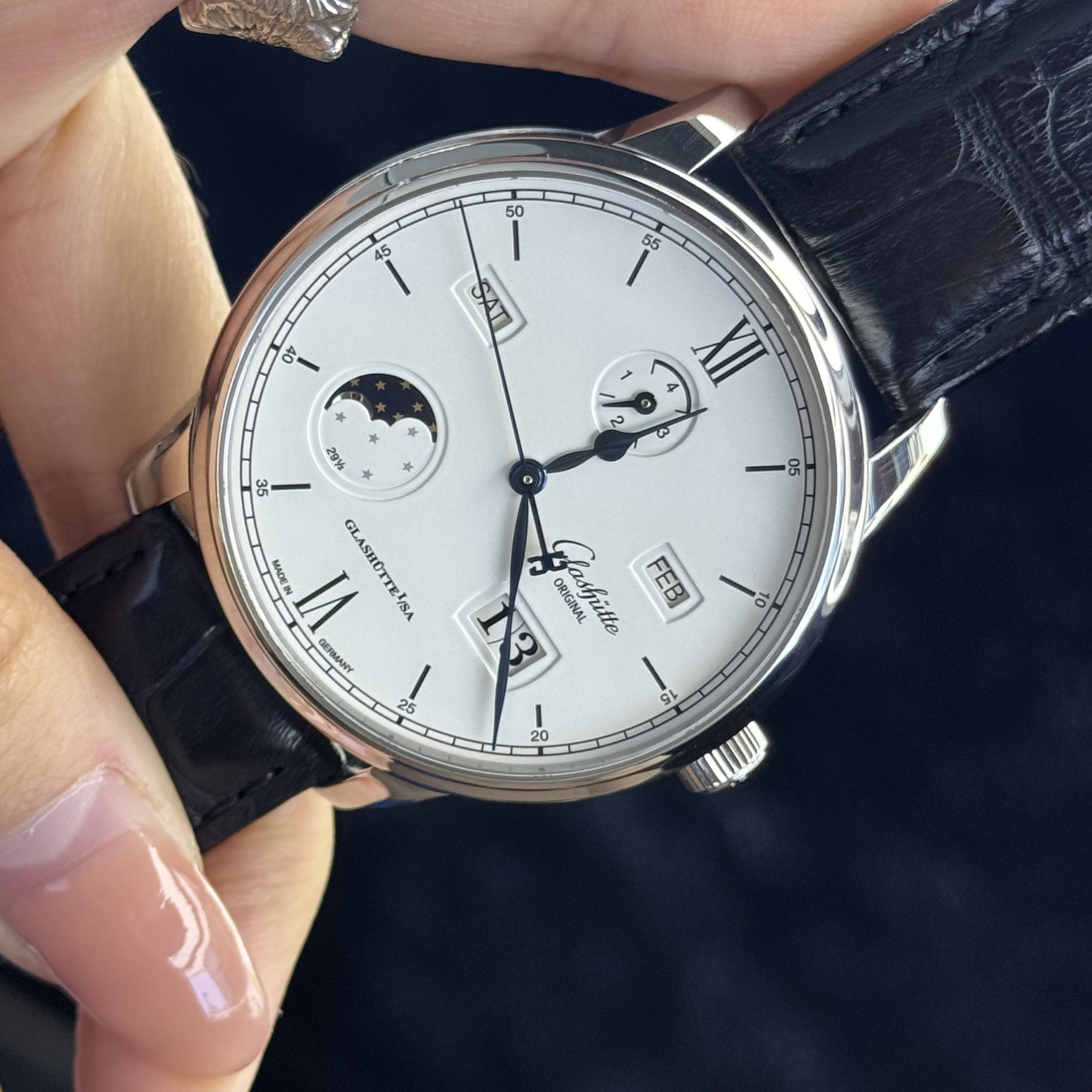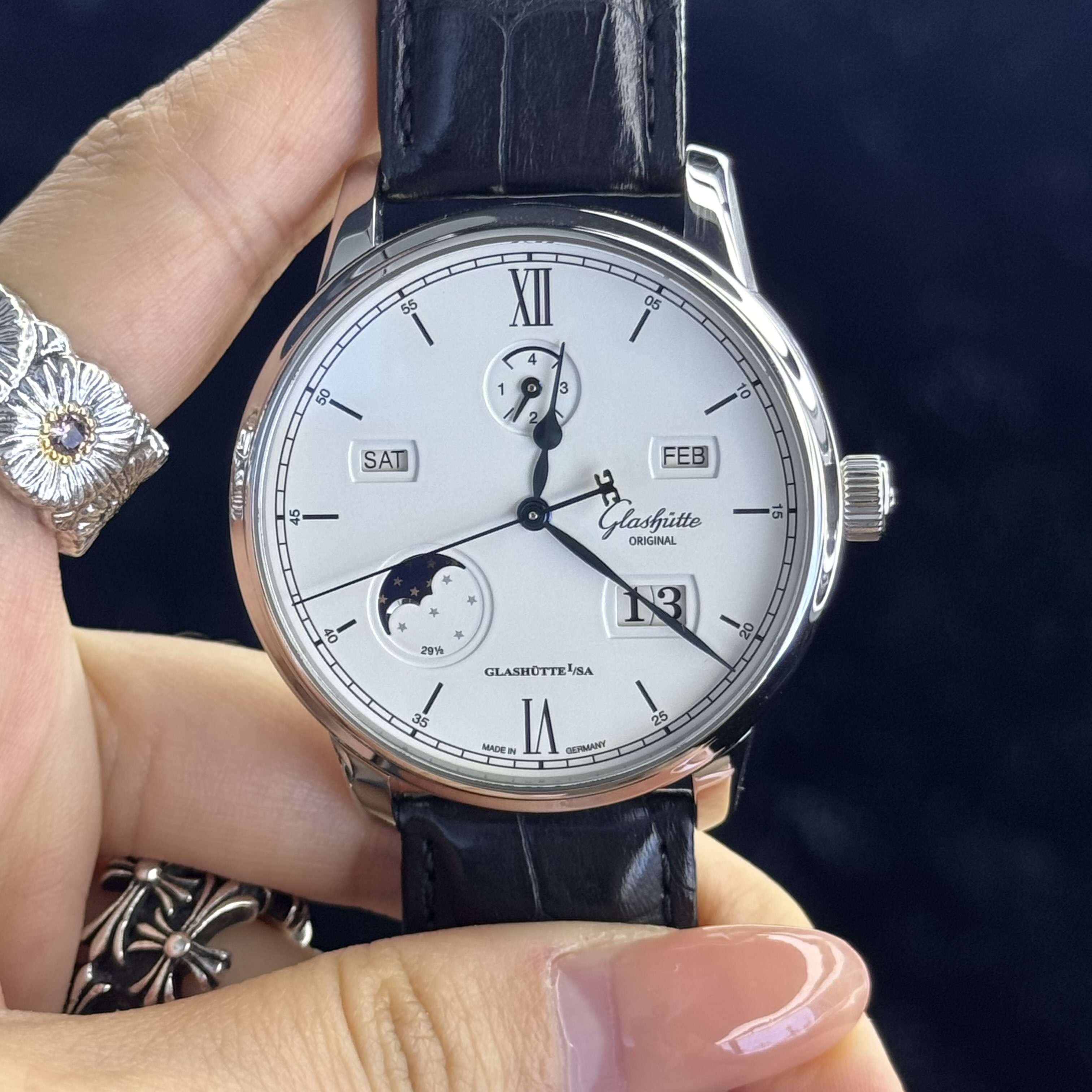 24年全套,格拉苏蒂议员系列1-36-02-01-02-61,42mm表径,精钢表壳,自动机械机芯,背透设计,月相+万年历+大日历+星期+月份显示,折叠扣 走时精准,附件齐全