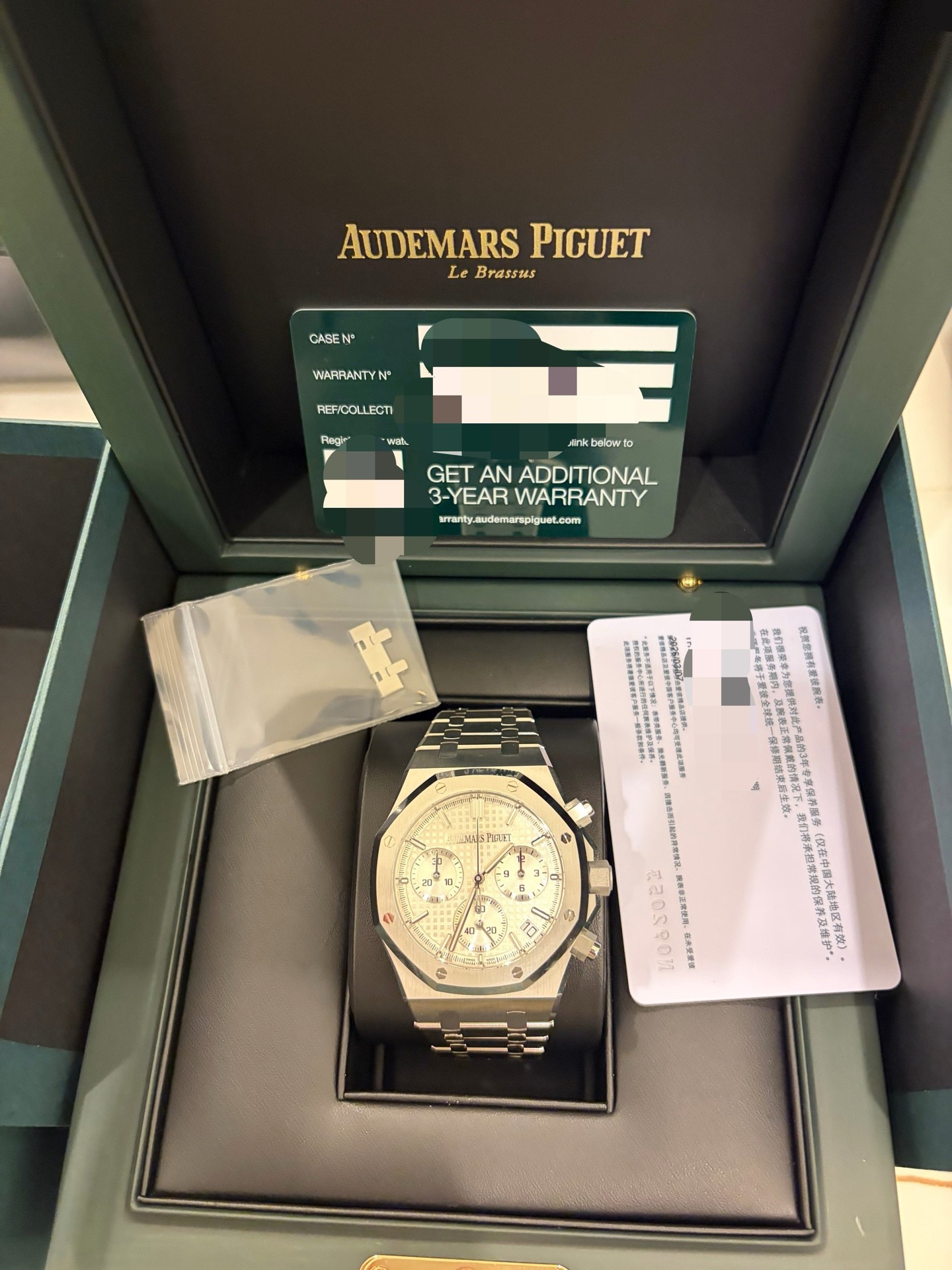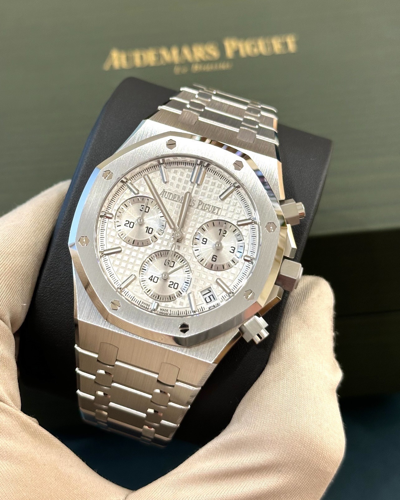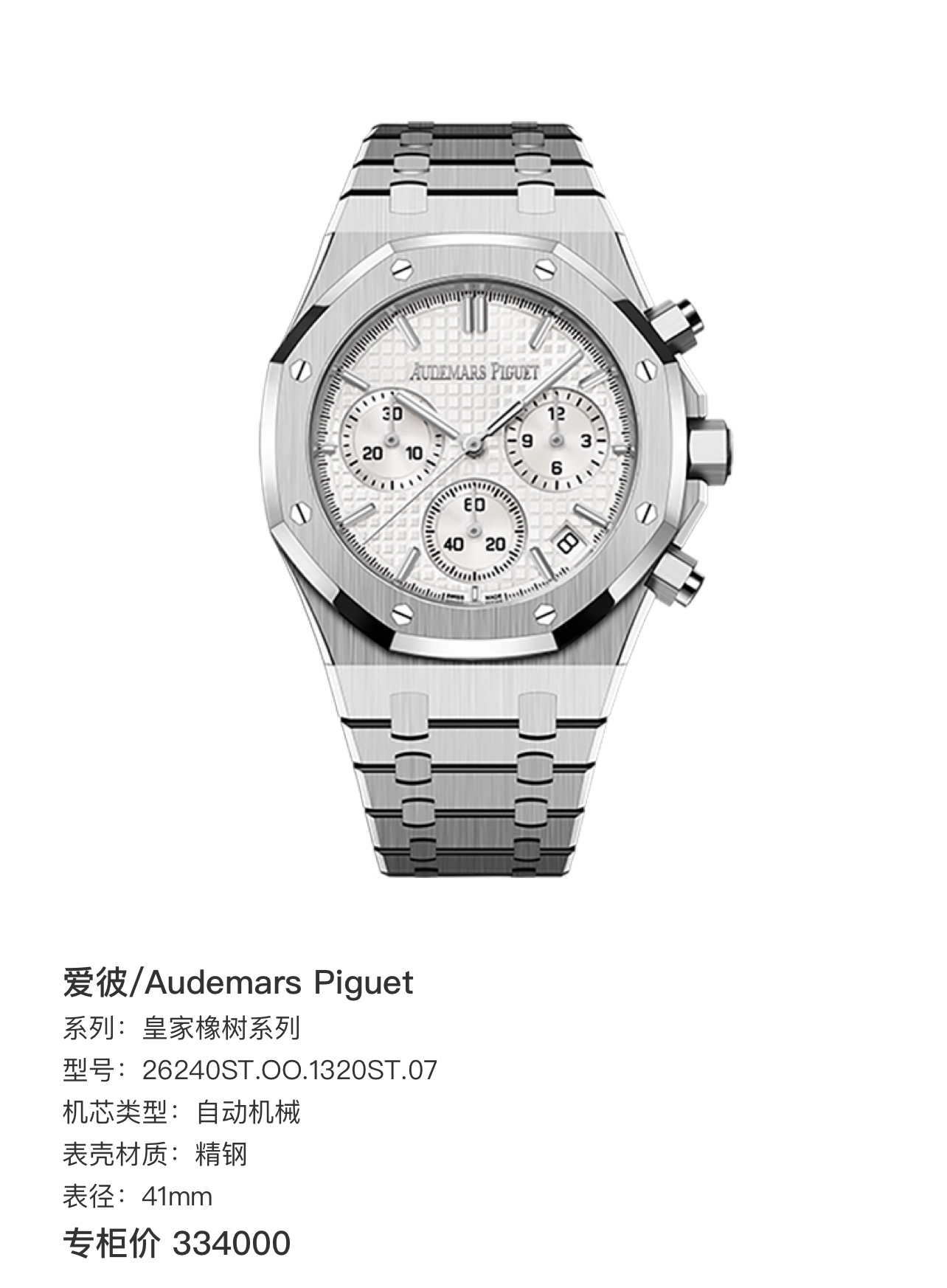 爱彼皇家橡树26240st白盘,41mm表径,自动机械,精钢材质,日期显示,计时功能,全新未使用国行双保卡2026年03月,现货好价