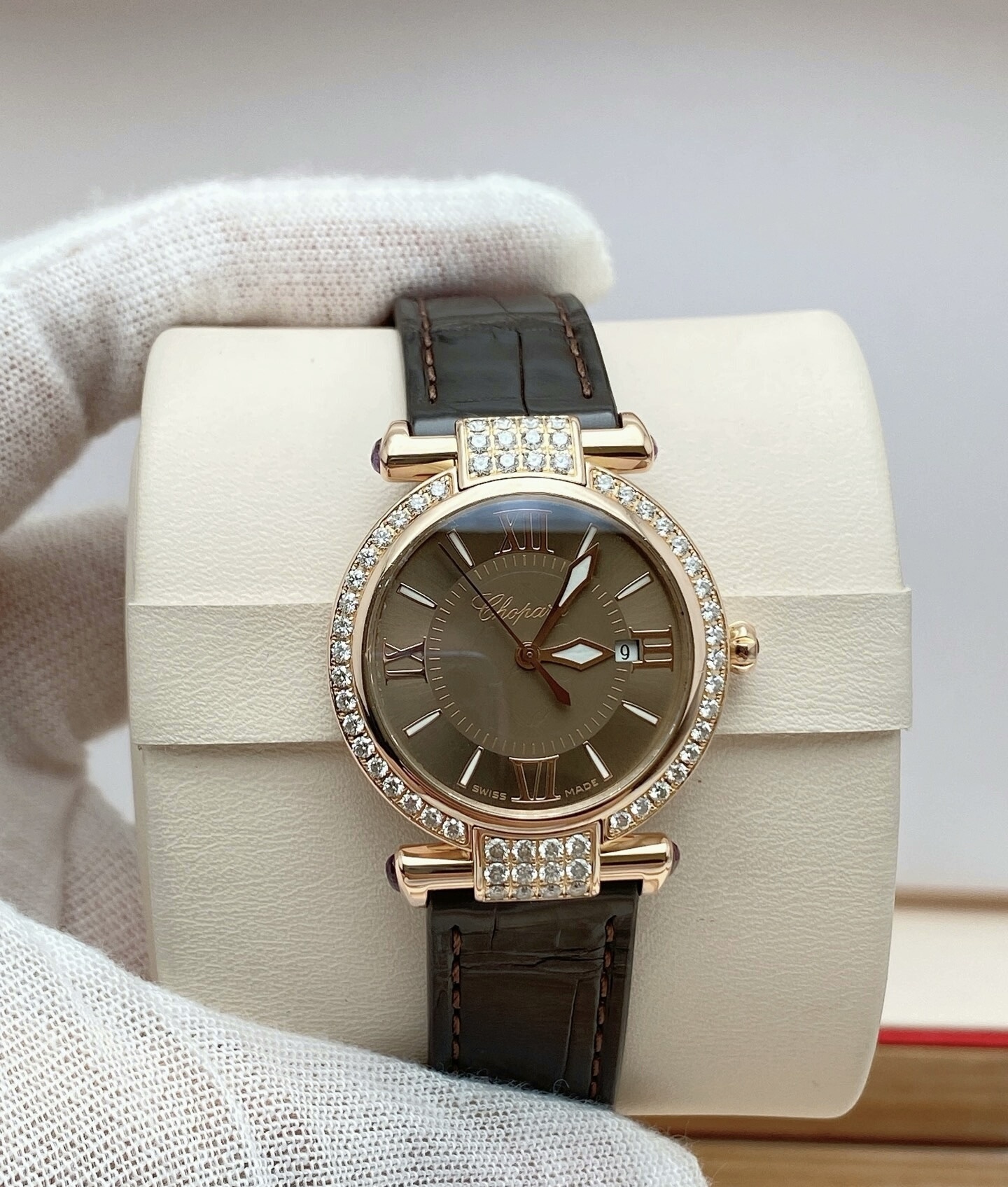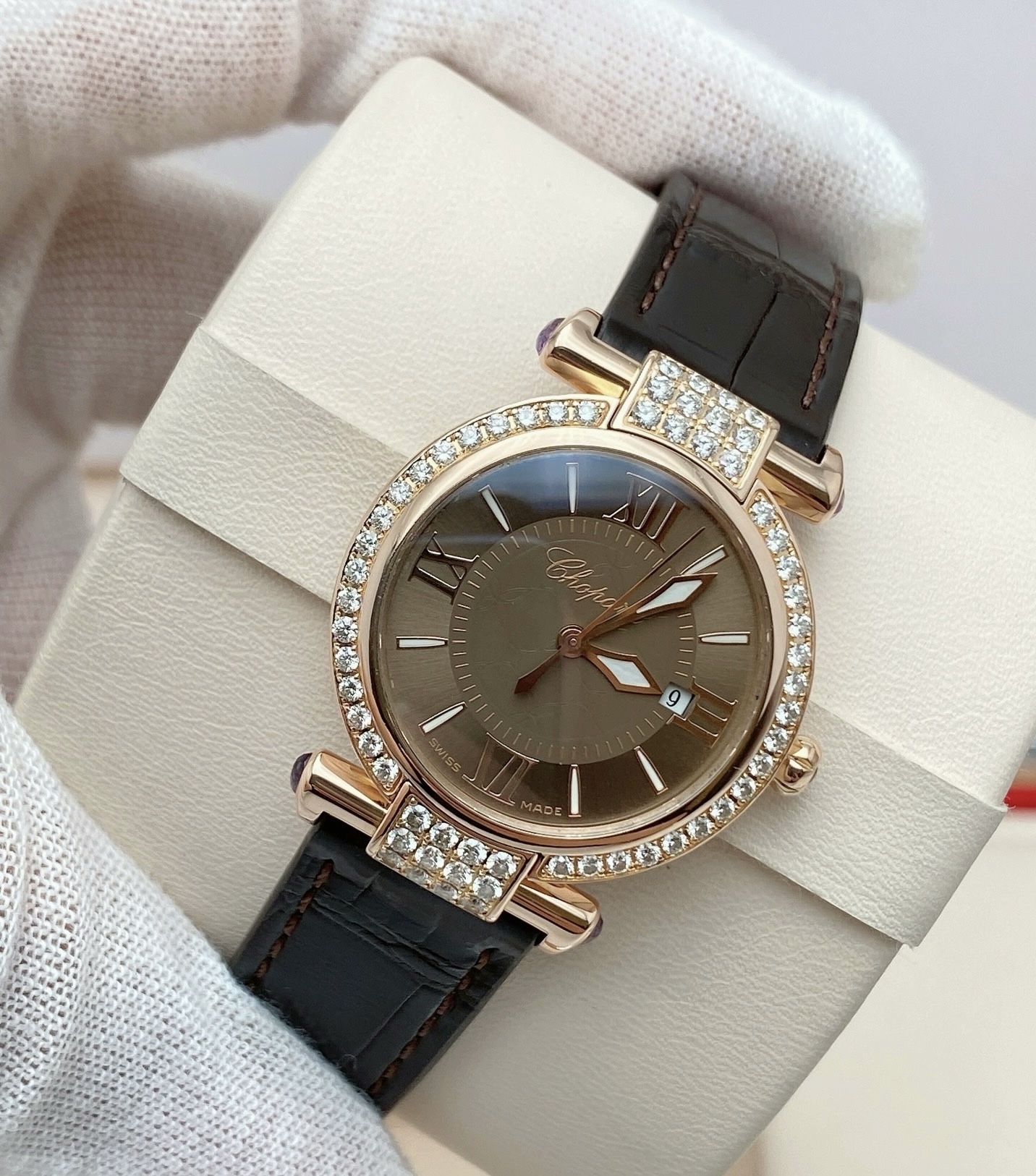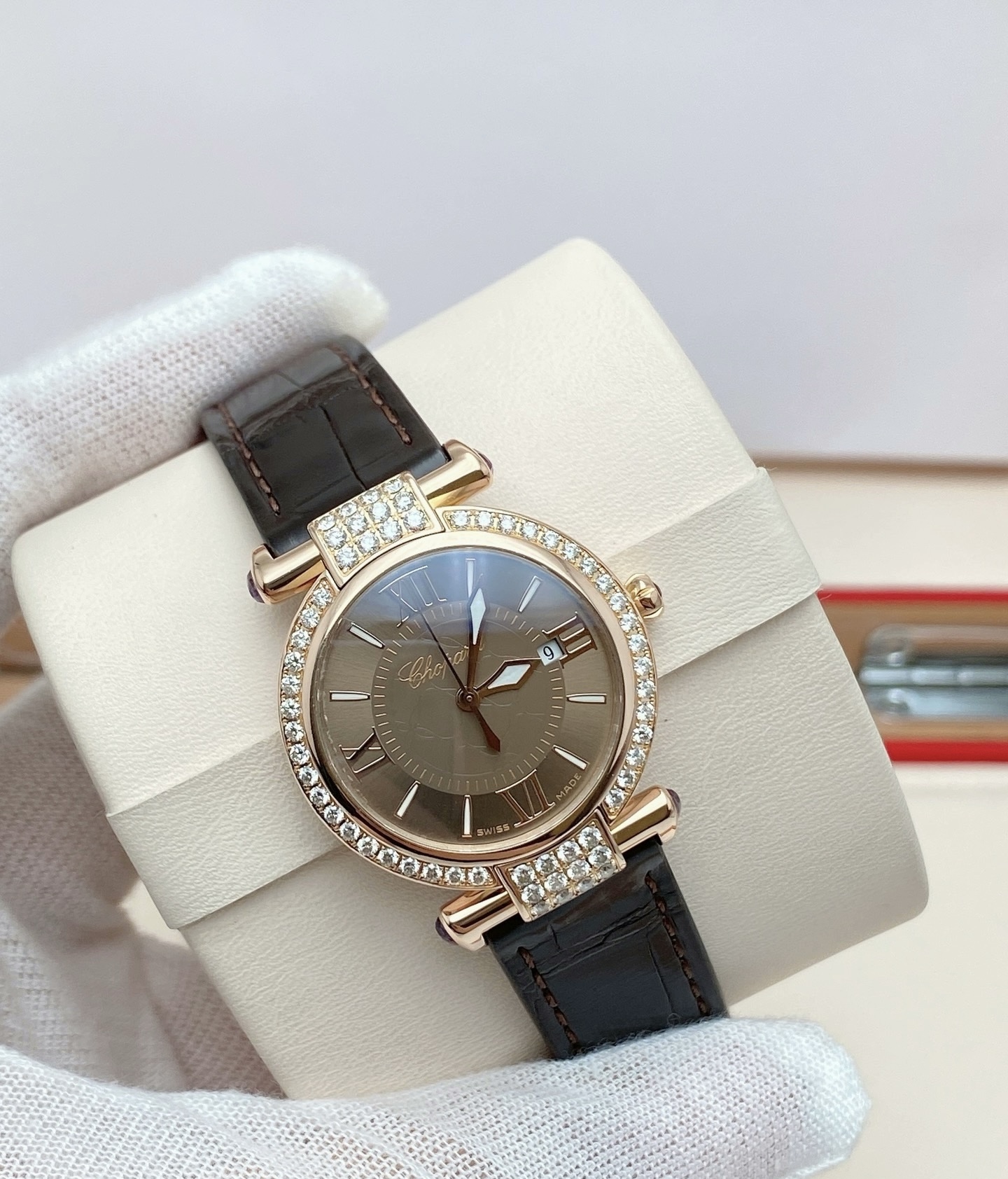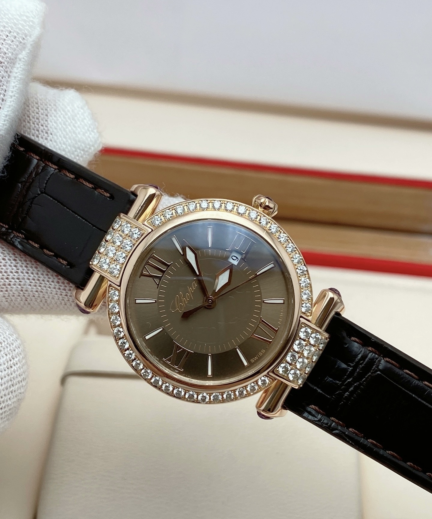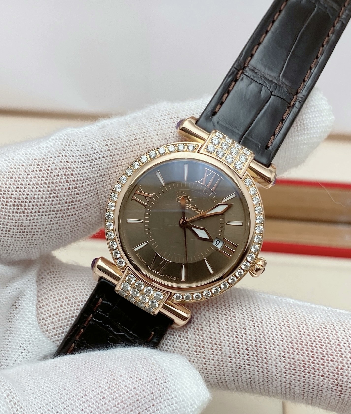 28mm表径,18k玫瑰金镶钻表壳,日期显示