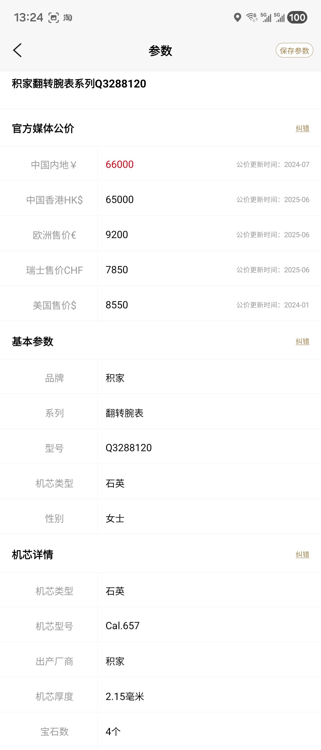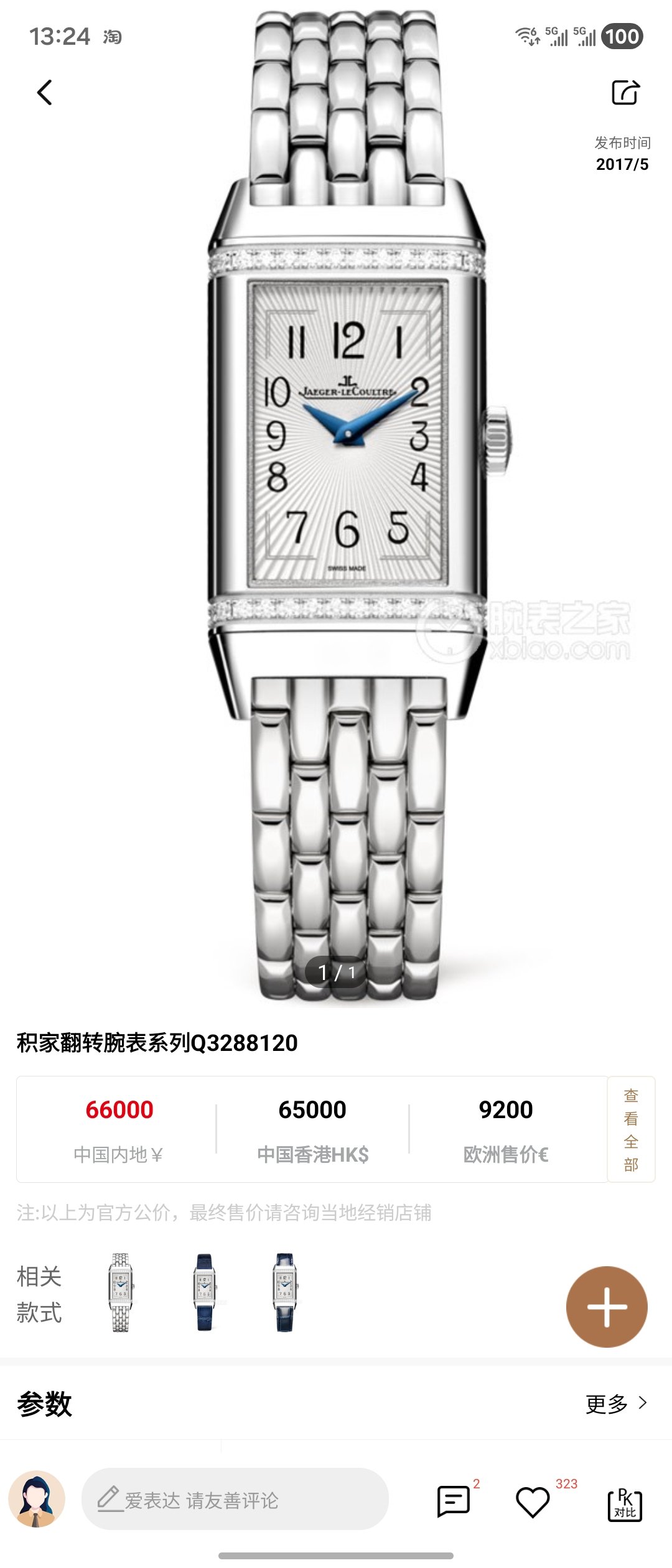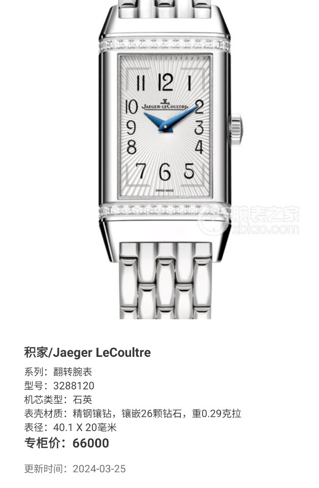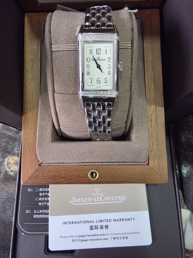 积家/Jaeger LeCoultre 翻转腕表 3288120 石英 精钢镶钻,镶嵌26颗钻石,重0.29克拉 40.1 X 20毫米 专柜价66000 26年2月,国行未使用