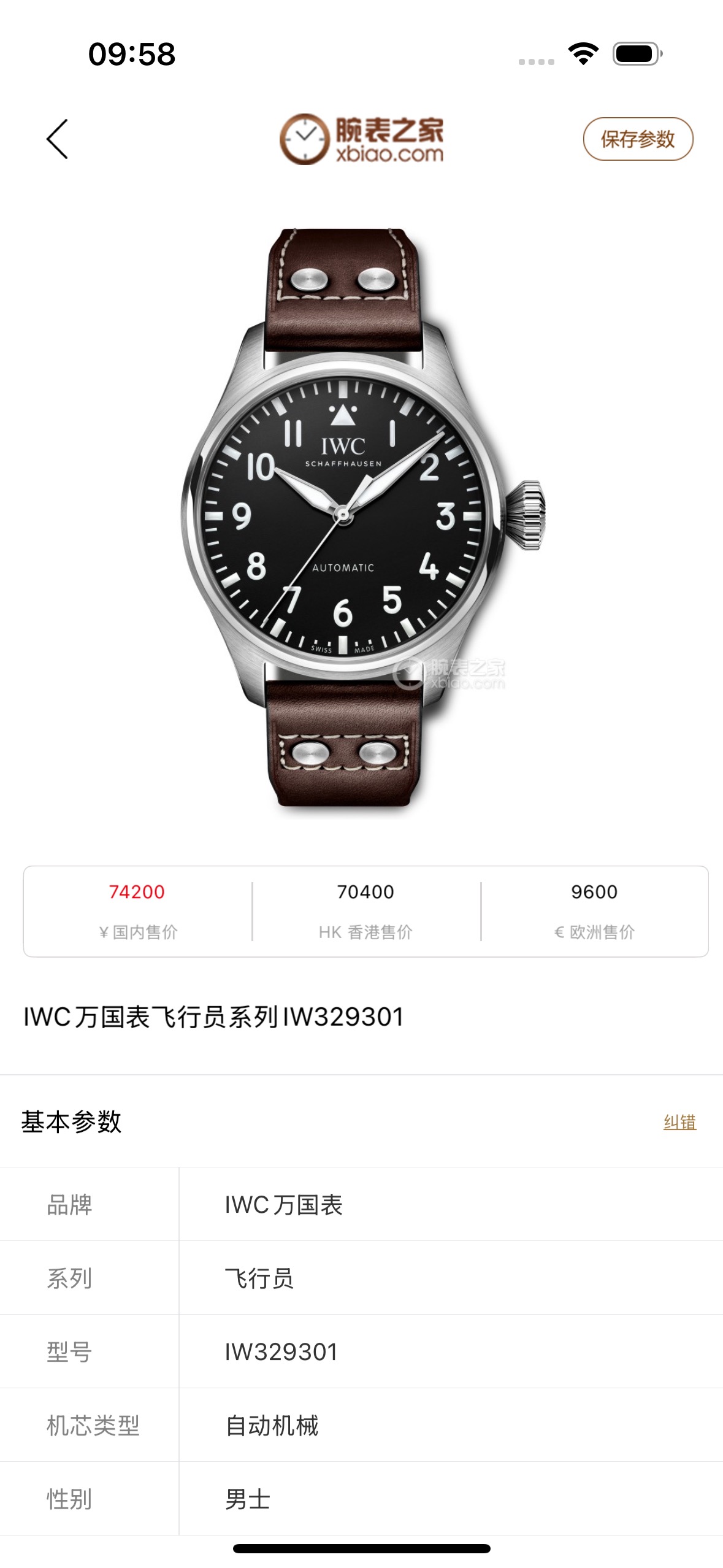 万国大型飞行员IW329301机械男性