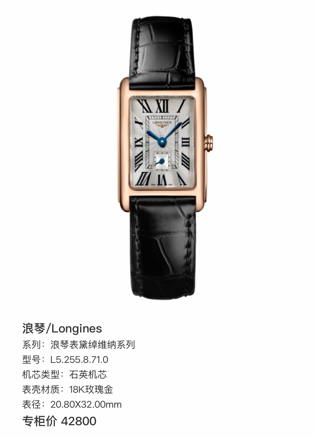 浪琴/Longines 浪琴表黛绰维纳系列 L5.255.8.71.0 石英机芯 18K玫瑰金 20.80X32.00mm 专柜价42800