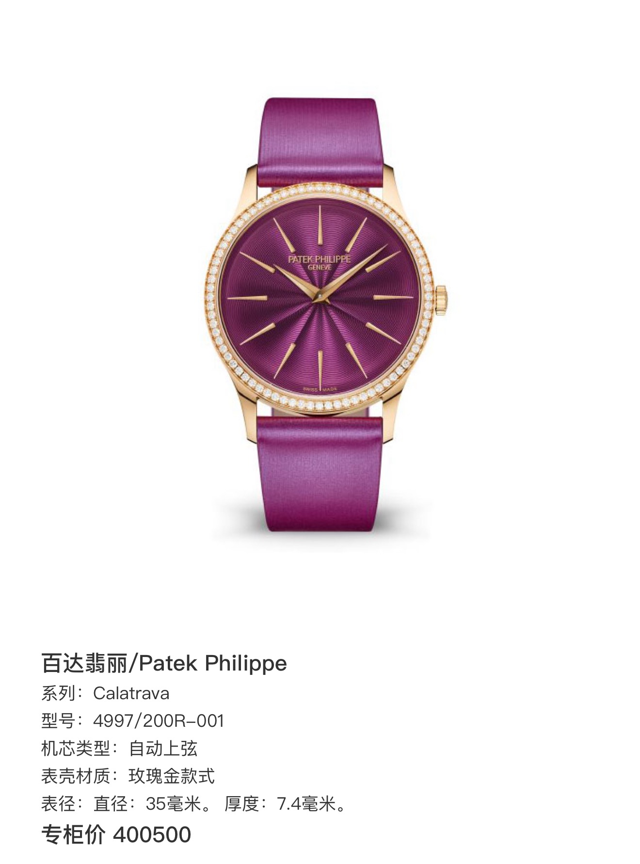百达翡丽/Patek Philippe Calatrava 4997/200R-001 自动上弦 玫瑰金款式 直径:35毫米。 厚度:7.4毫米。 专柜价400500,
