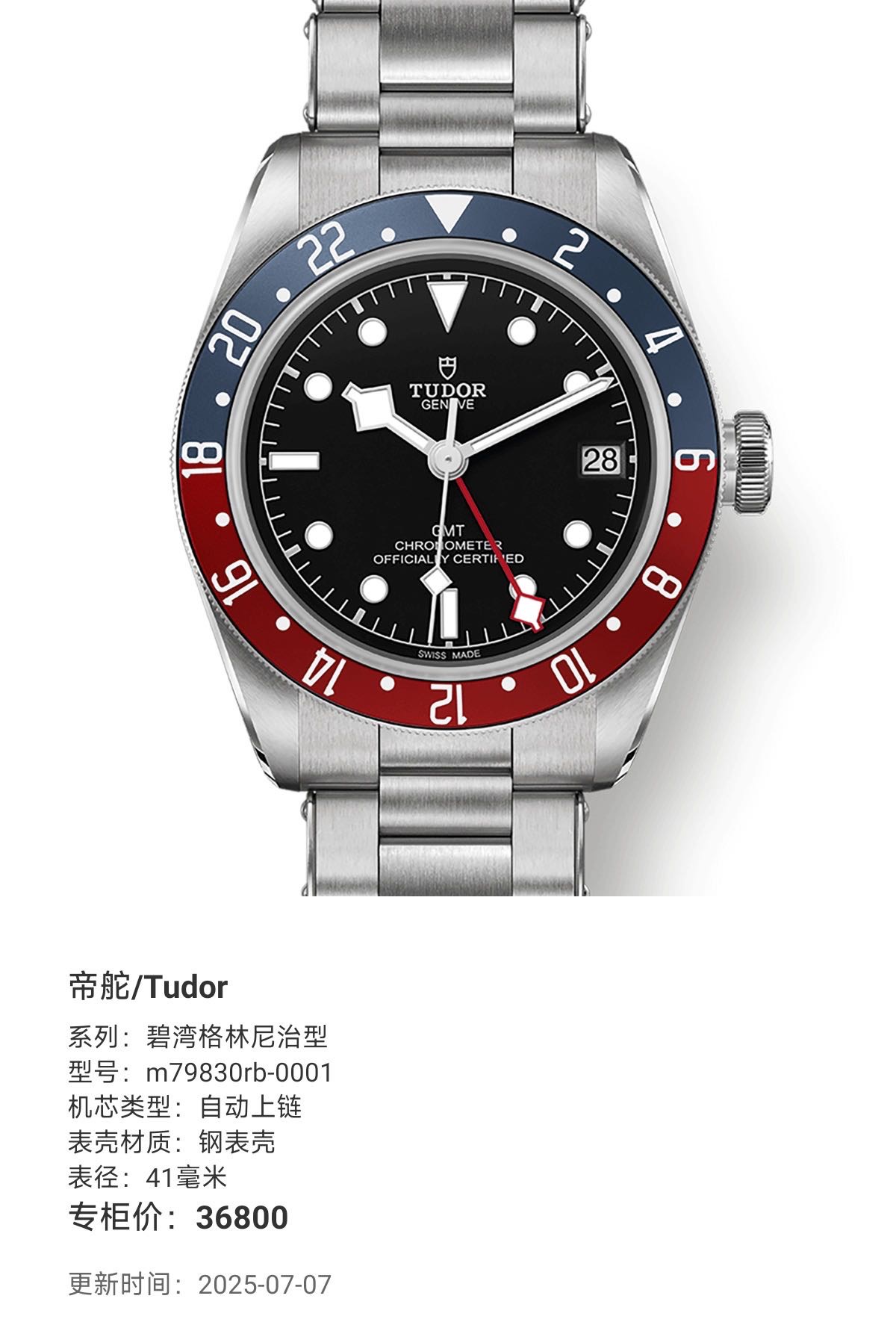帝舵/Tudor 碧湾格林尼治型 m79830rb-0001 自动上链 钢表壳 41毫米 专柜价36800元 国行全新未使用25年卡