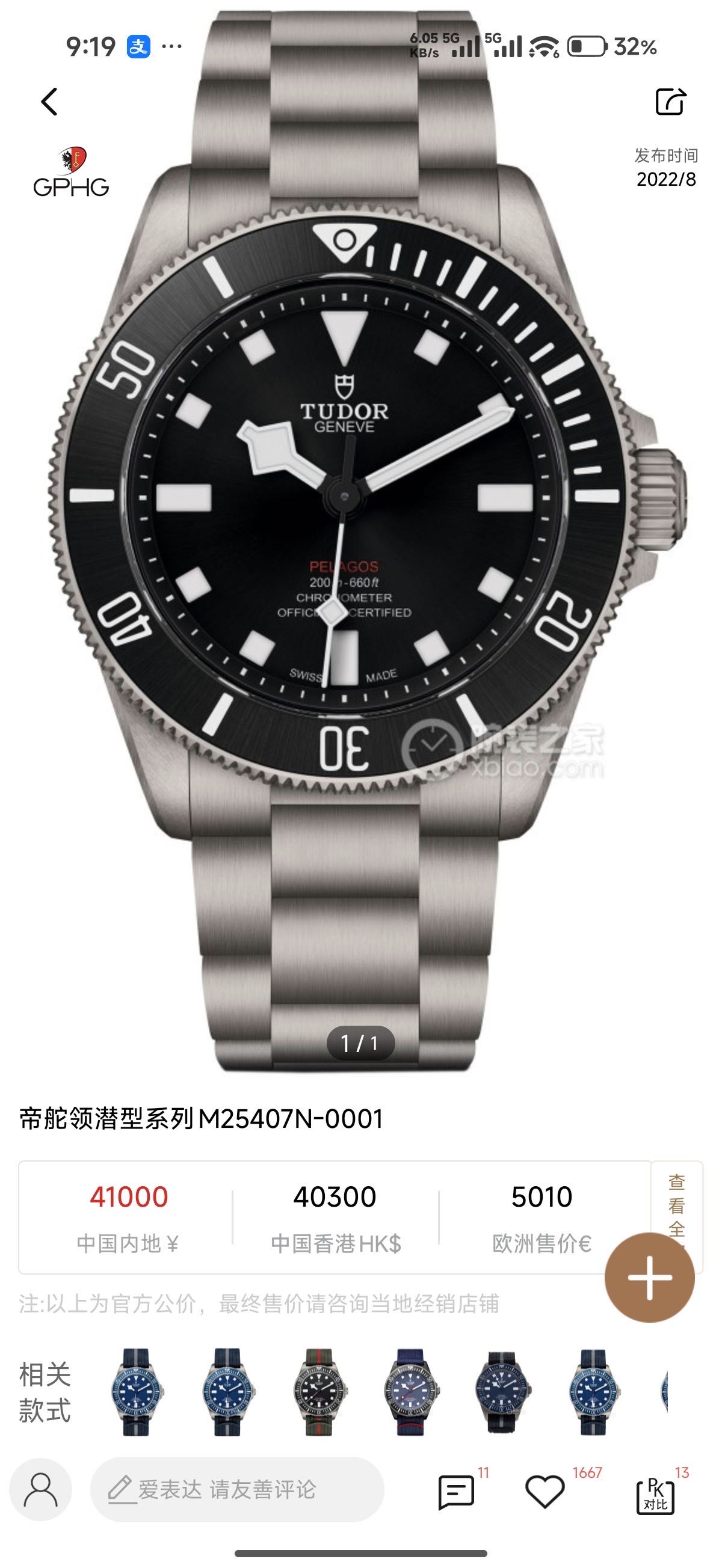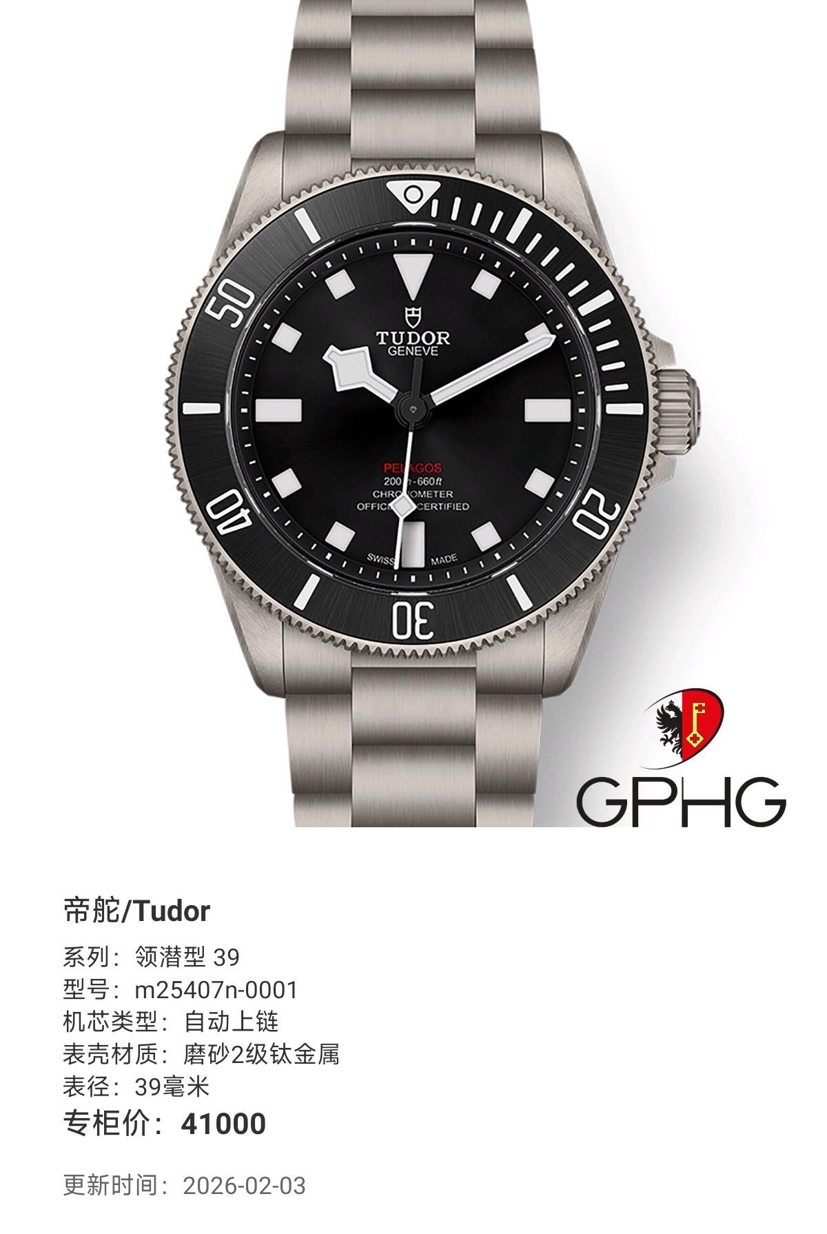 帝舵/Tudor 领潜型 39 m25407n-0001 自动上链 磨砂2级钛金属 39毫米 专柜价41000