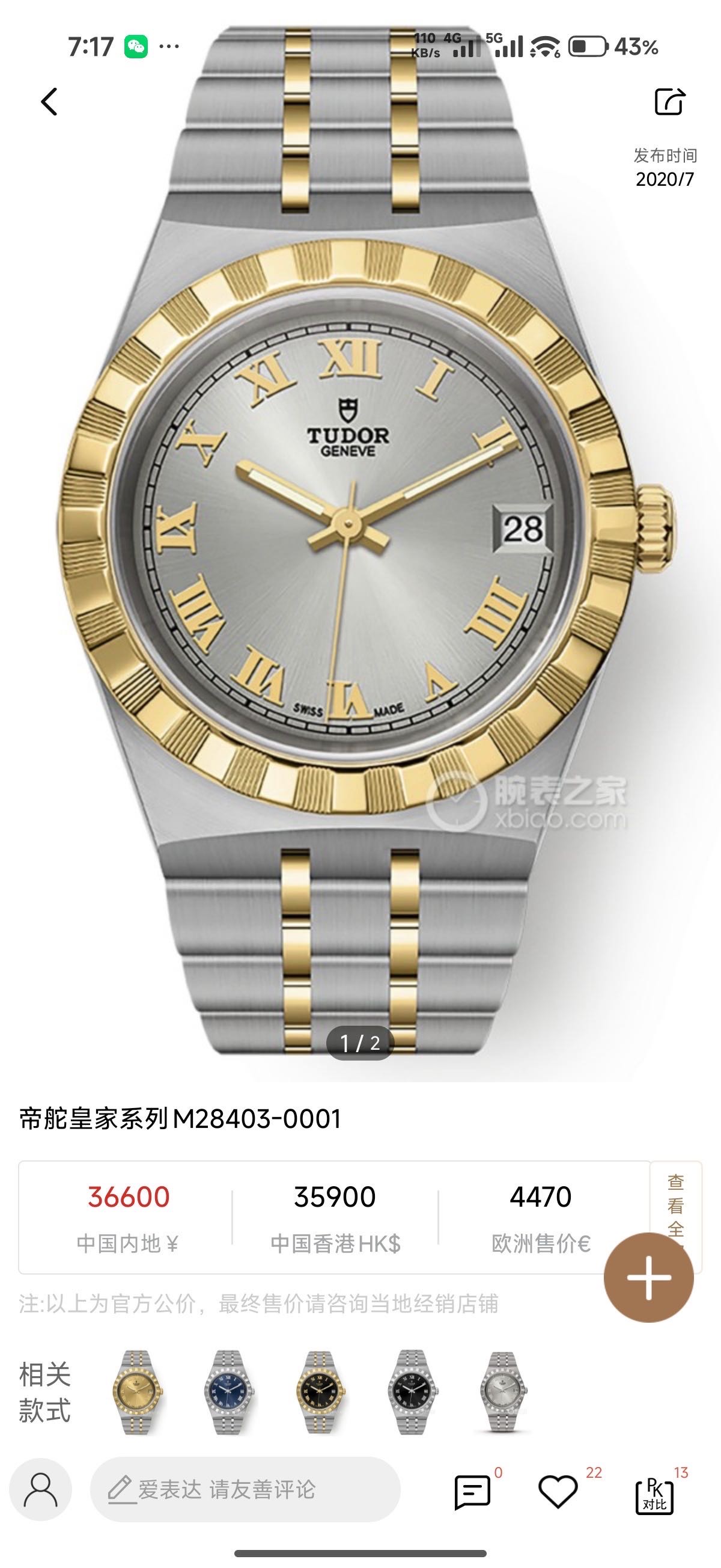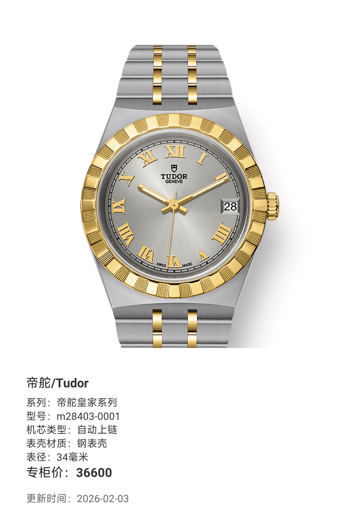 帝舵/Tudor 帝舵皇家系列 m28403-0001 自动上链 钢表壳 34毫米 专柜价36600 全新全套未使用
