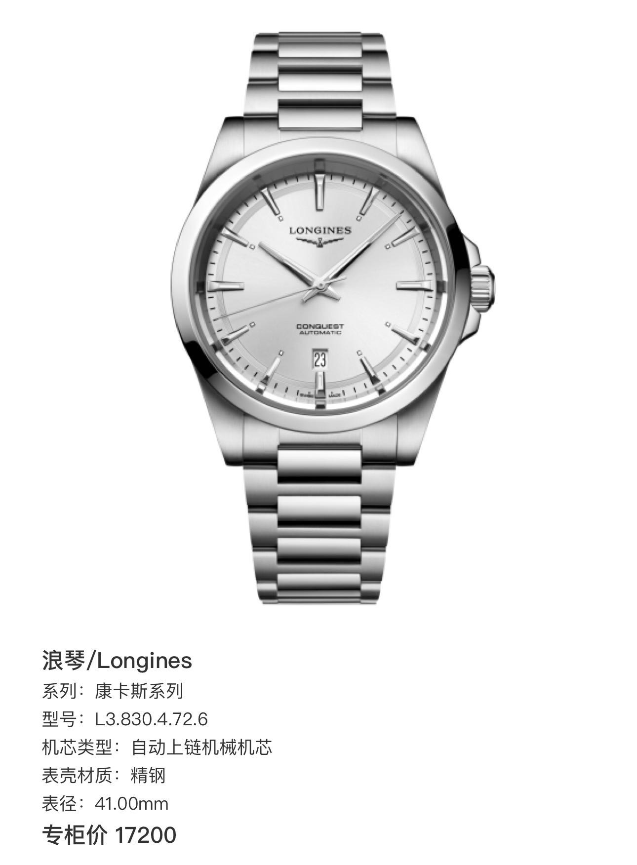 24年全套 浪琴/Longines 康卡斯系列 L3.830.4.72.6 自动上链机械机芯 精钢 41.00mm 专柜价17200