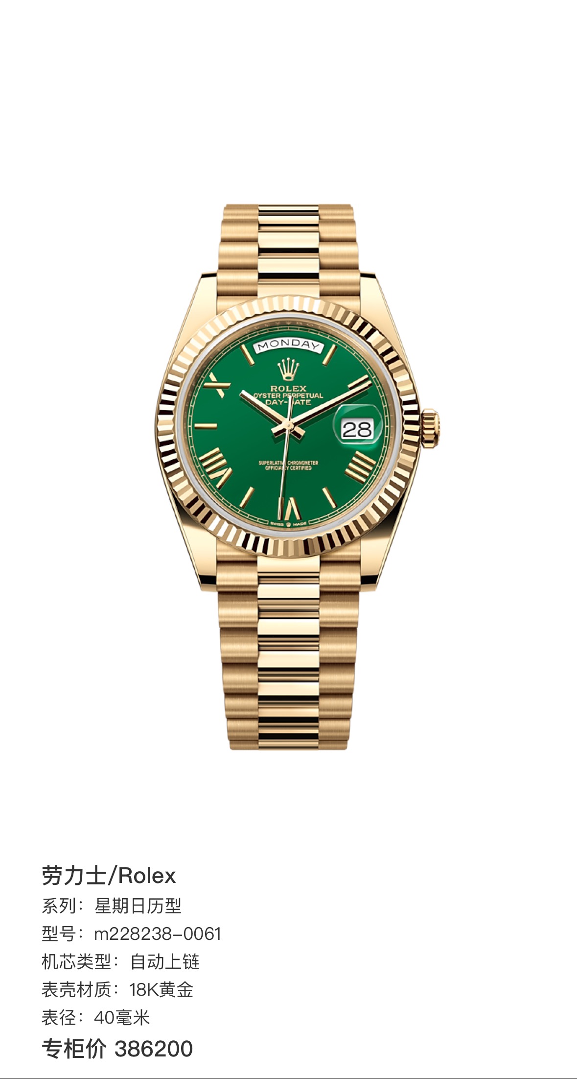 劳力士/Rolex 星期日历型 m228238-0061 自动上链 18K黄金 40毫米 专柜价386200