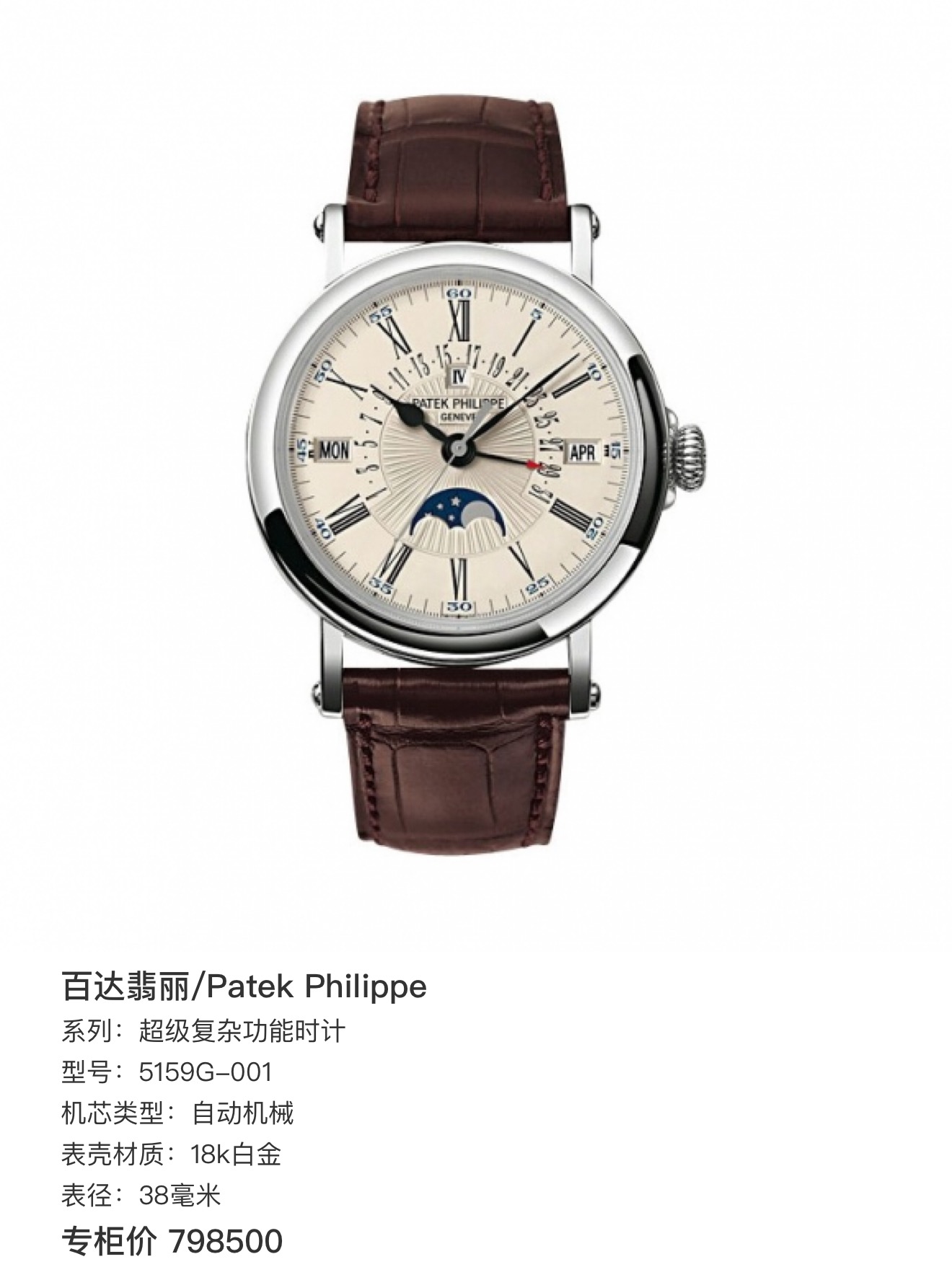 百达翡丽/Patek Philippe 超级复杂功能时计 5159G-001 自动机械 18k白金 38毫米 专柜价798500 现货