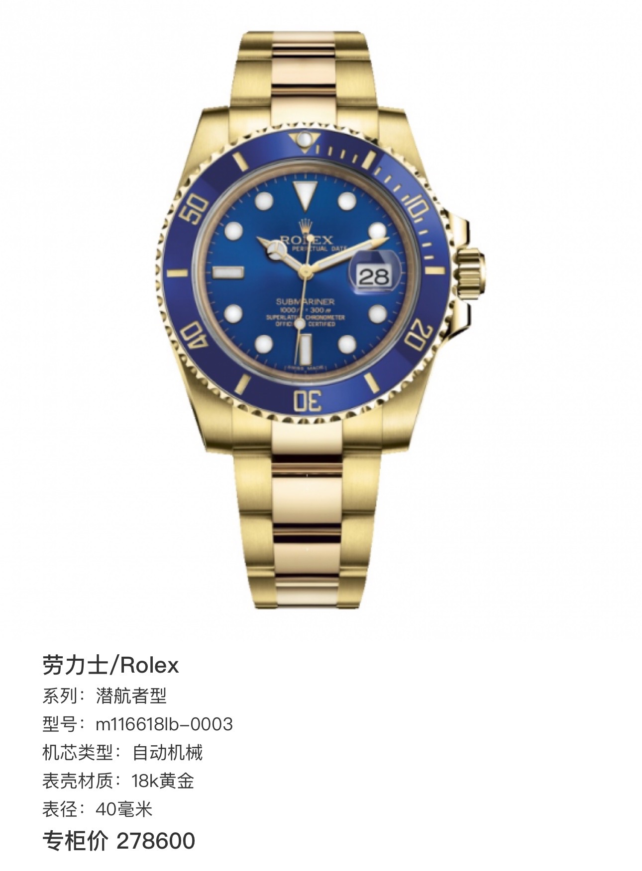 劳力士/Rolex 潜航者型 m116618lb-0003 自动机械 18k黄金 40毫米 全金蓝 单表 专柜价278600。