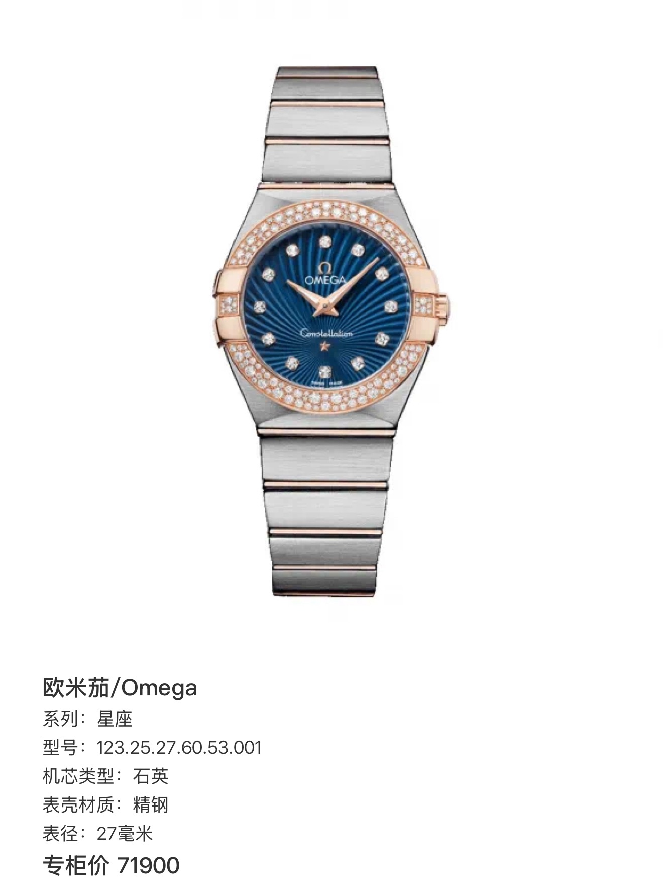 欧米茄/Omega 星座 123.25.27.60.53.001 石英 精钢 27毫米 专柜价71900