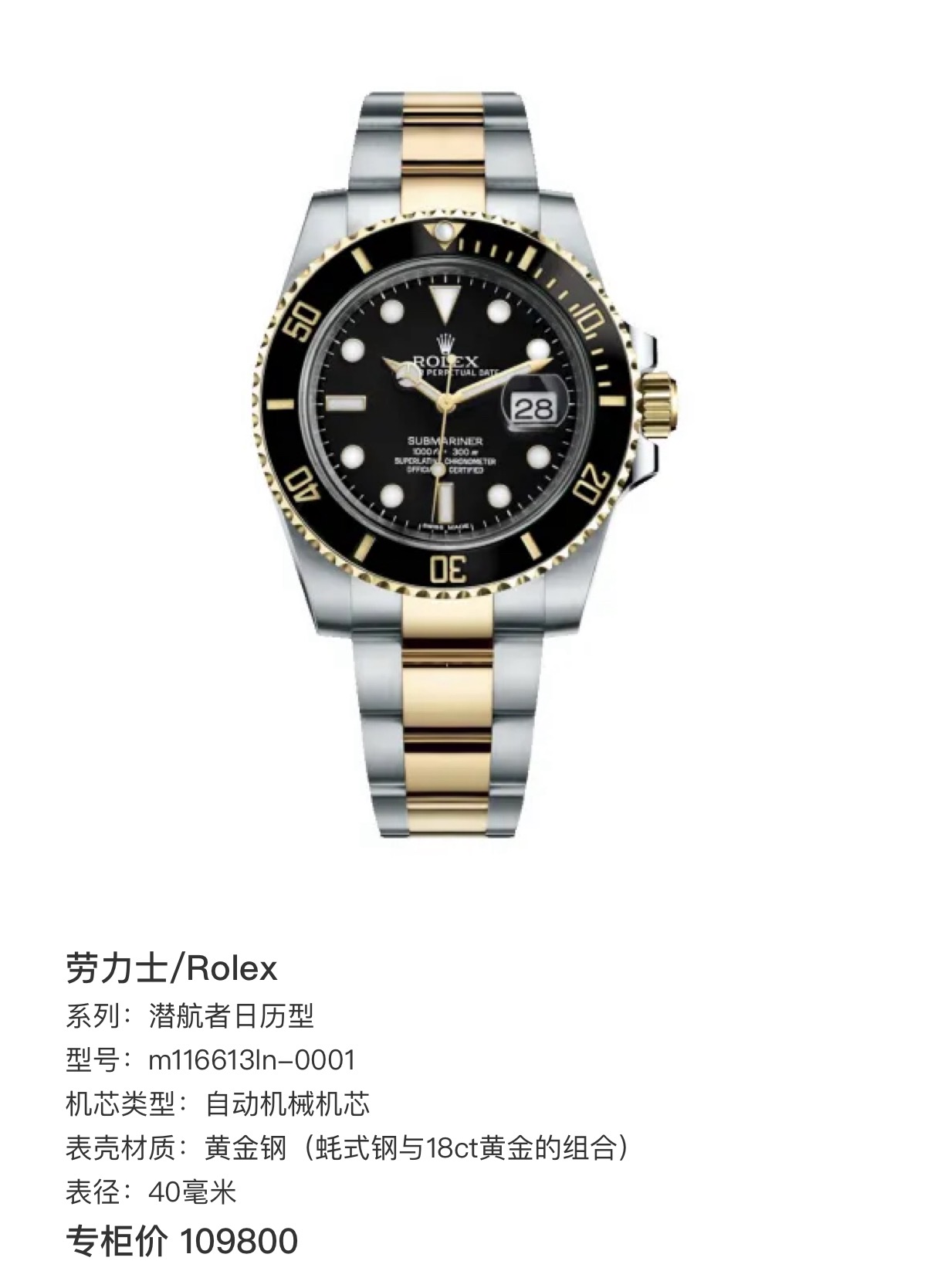 劳力士/Rolex 潜航者日历型 m116613ln-0001 自动机械机芯 黄金钢(蚝式钢与18ct黄金的组合) 40毫米 单表 专柜价109800 现货好价。