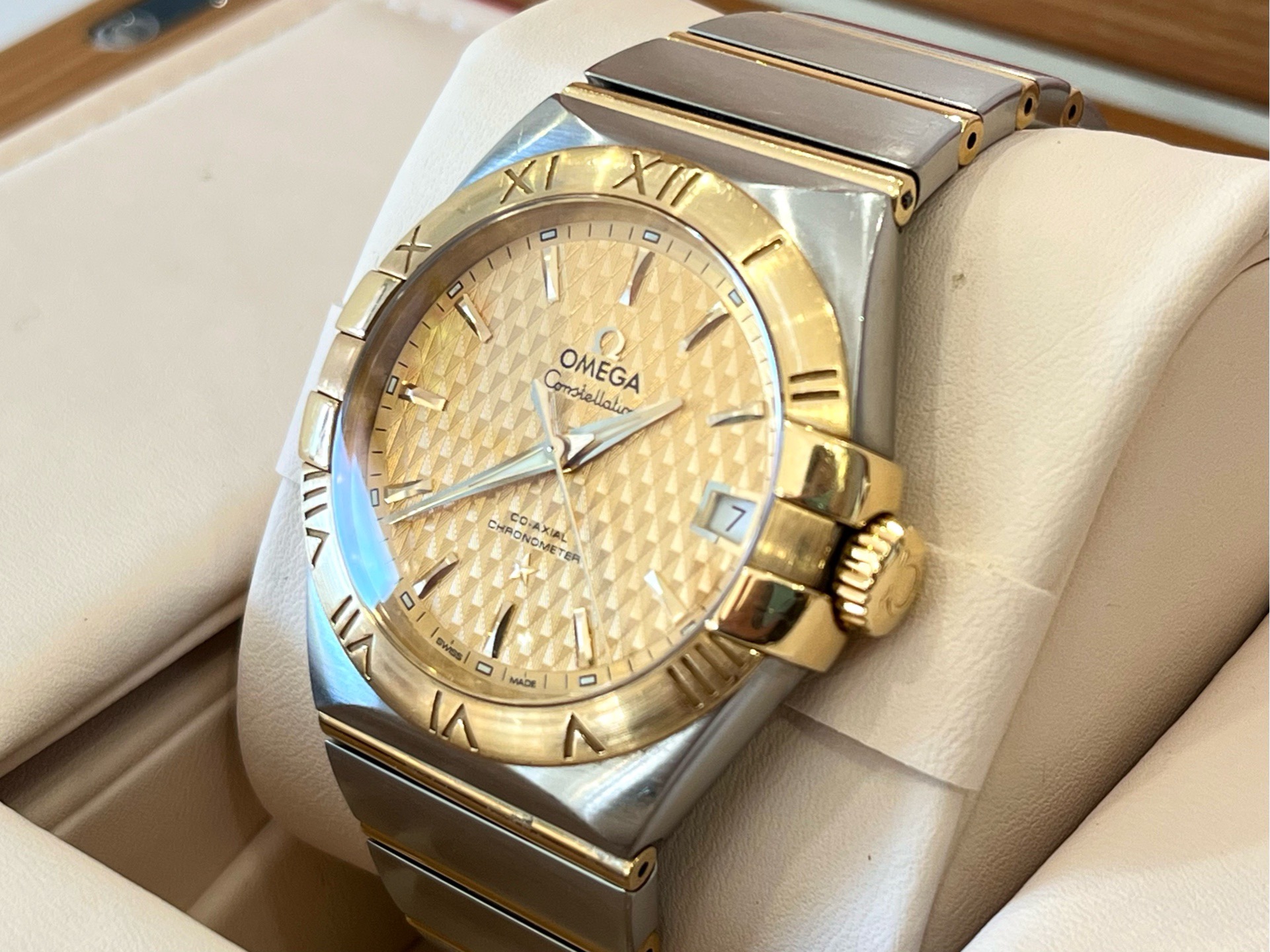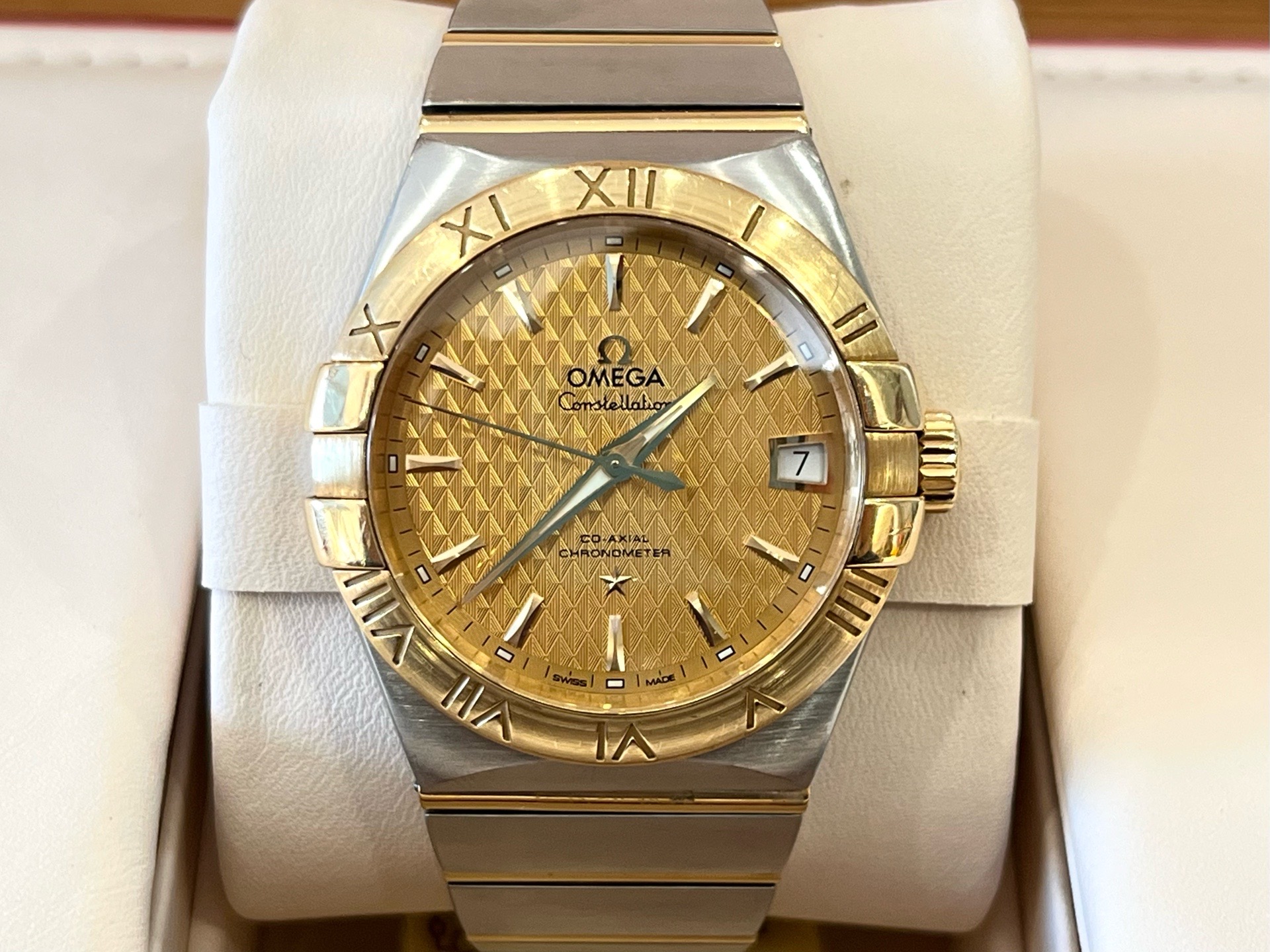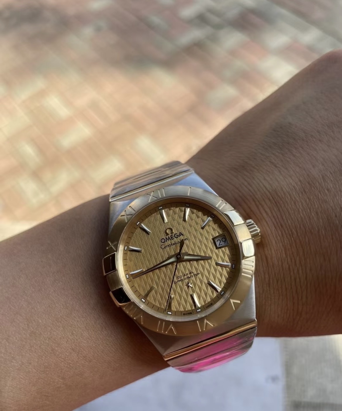 24年全套 欧米茄 Omega 星座系列123.20.38.21.08.002 男士自动机械表 表径38mm 浮雕棱形图案香槟色表盘 间金表链 背透 蝴蝶表扣 棒状时标 日期显示 机芯8500 专柜65200 现货特价