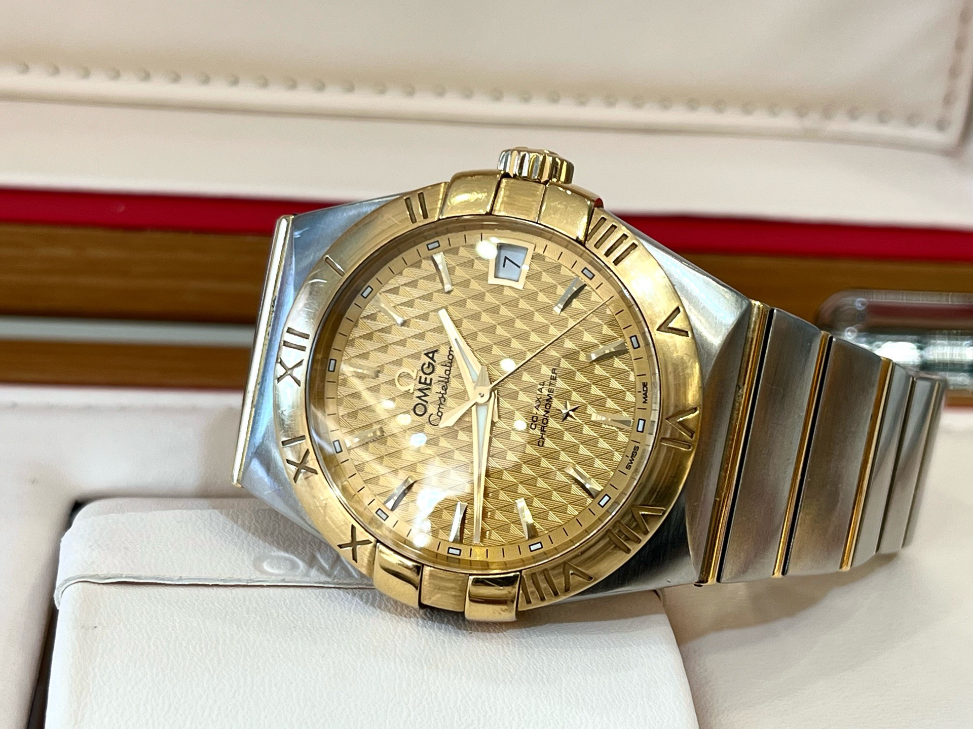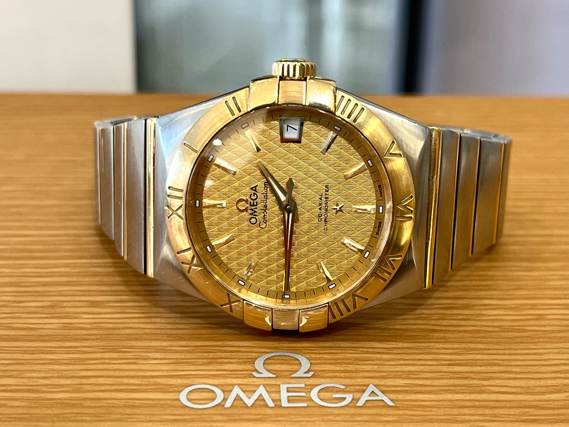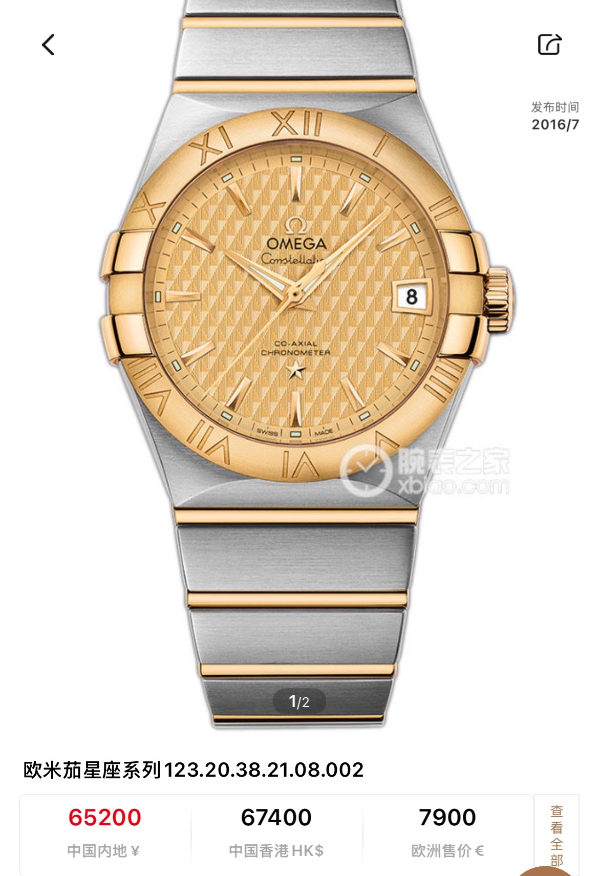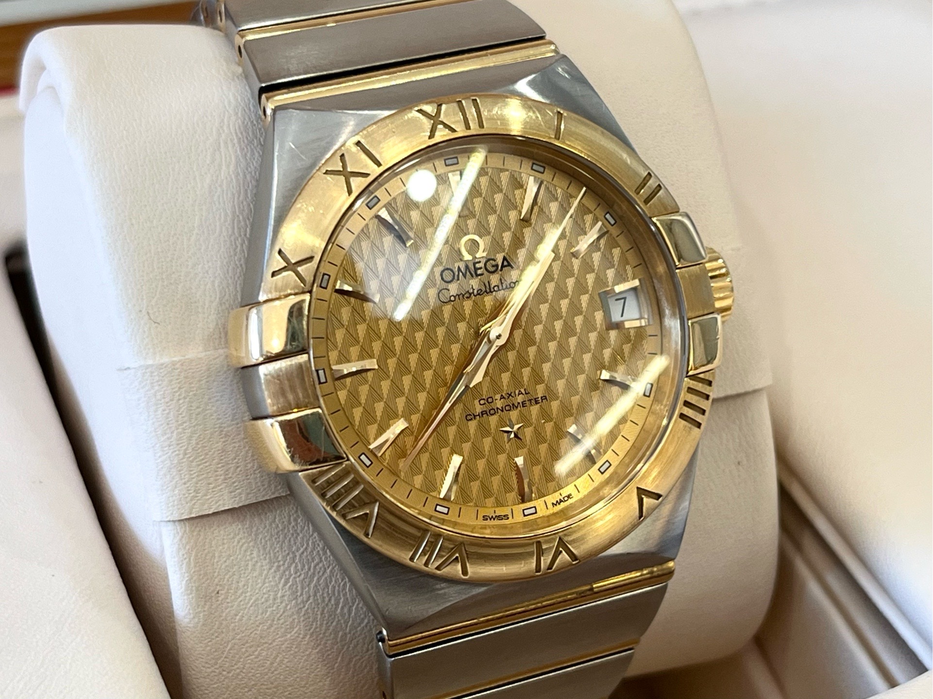 24年全套 欧米茄 Omega 星座系列123.20.38.21.08.002 男士自动机械表 表径38mm 浮雕棱形图案香槟色表盘 间金表链 背透 蝴蝶表扣 棒状时标 日期显示 机芯8500 专柜65200 现货特价