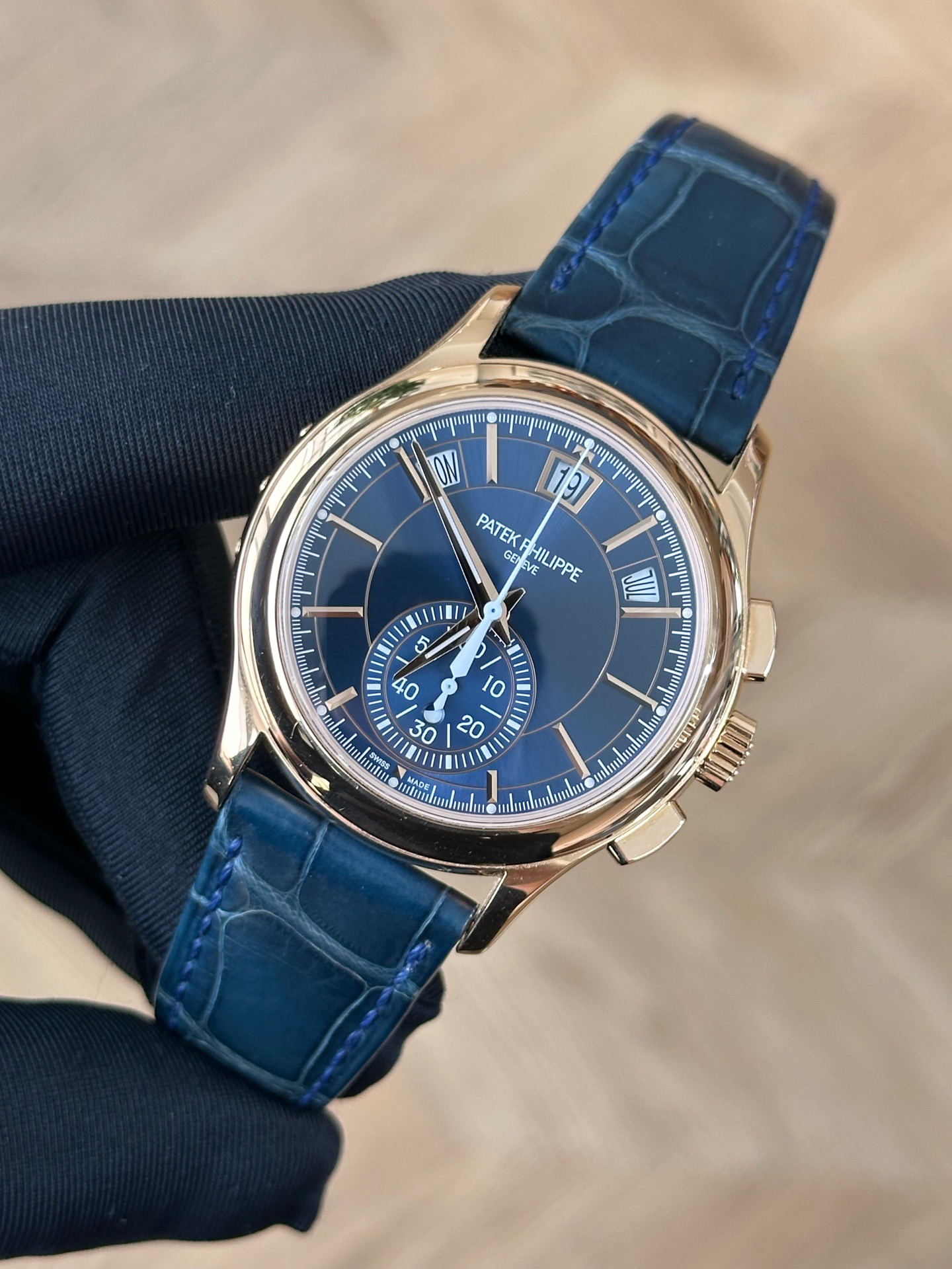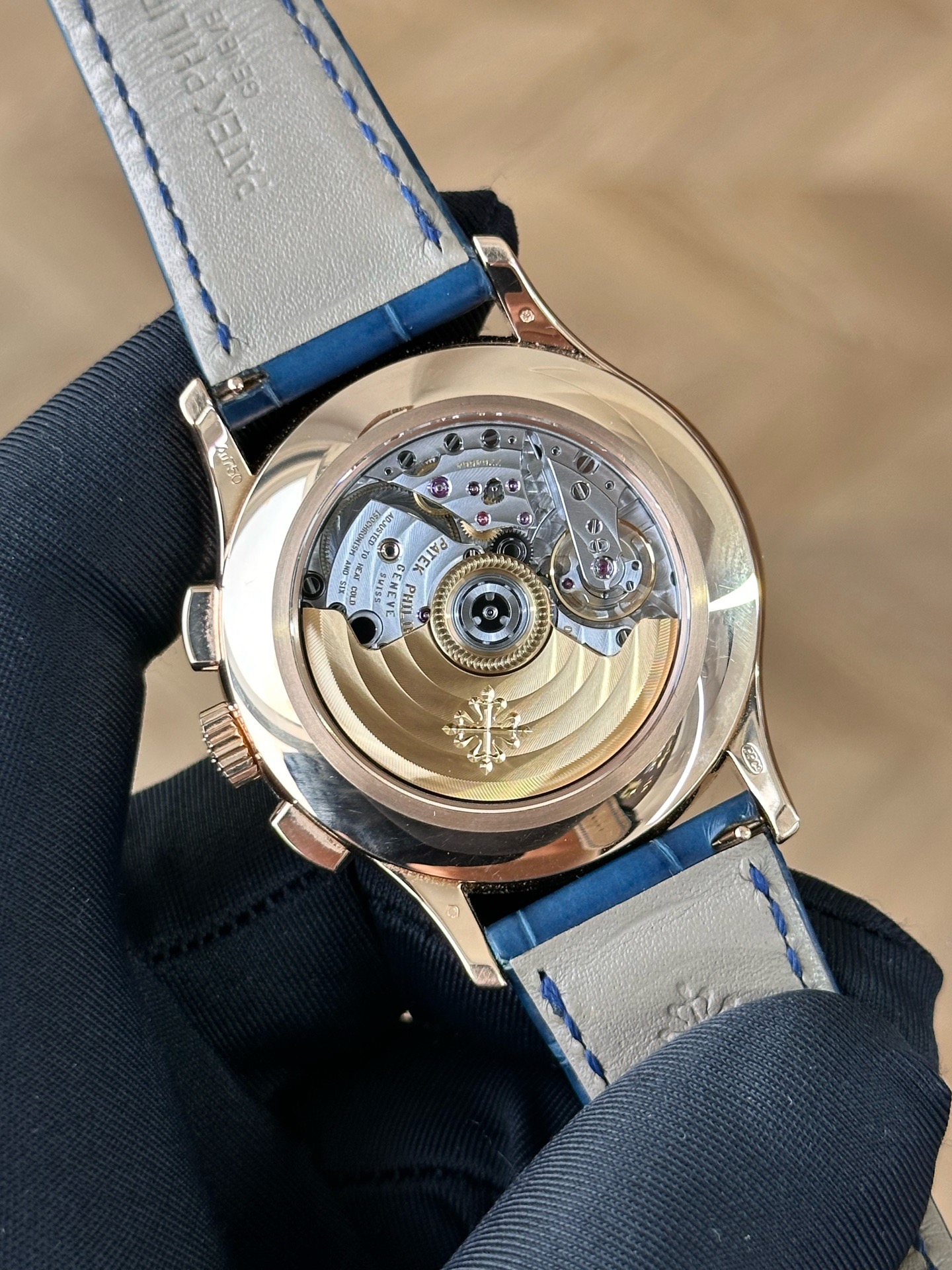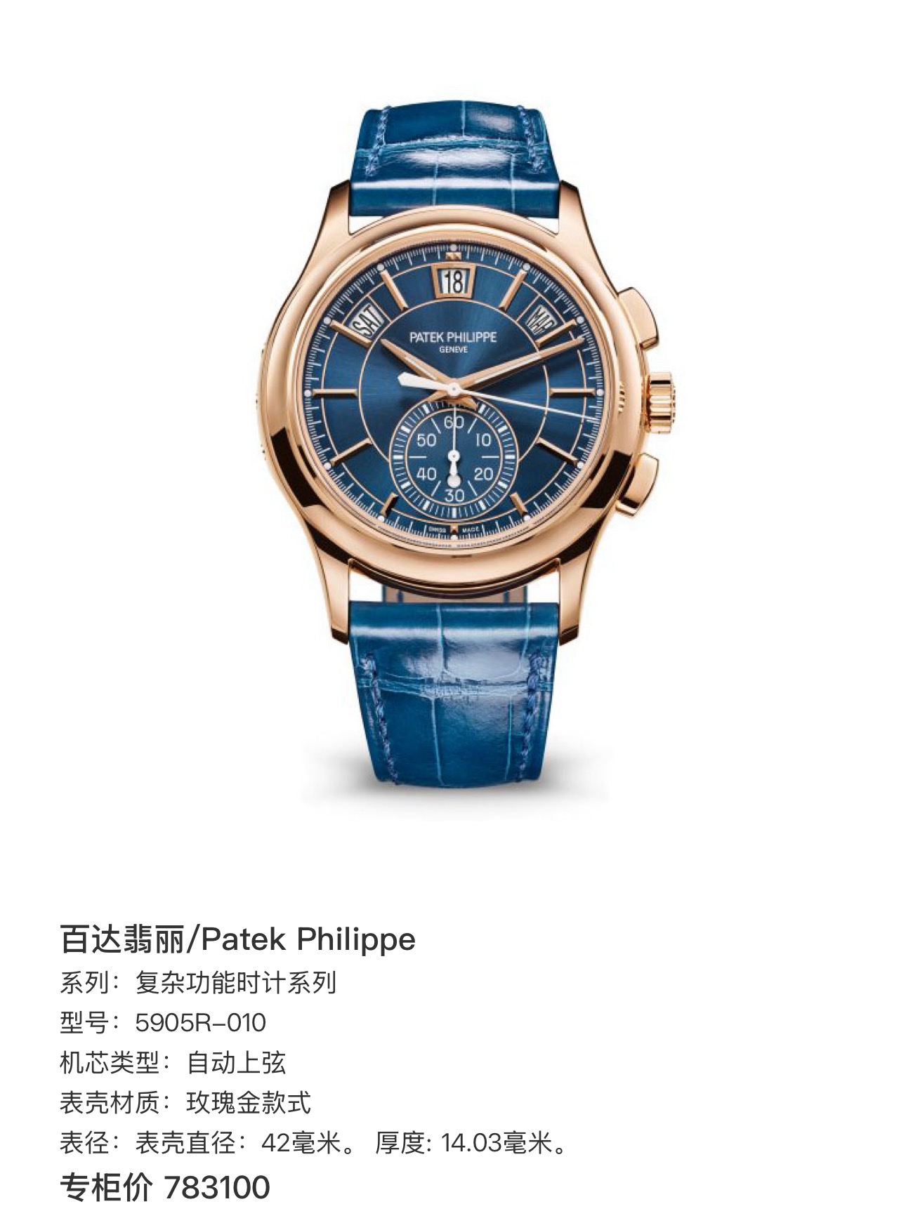百达翡丽/Patek Philippe 复杂功能时计系列 5905R-010 自动上弦 玫瑰金款式 表壳直径:42毫米表径;蓝盘新款,针扣,日期/星期/月份/年历/计时功能;专柜价783100;全套