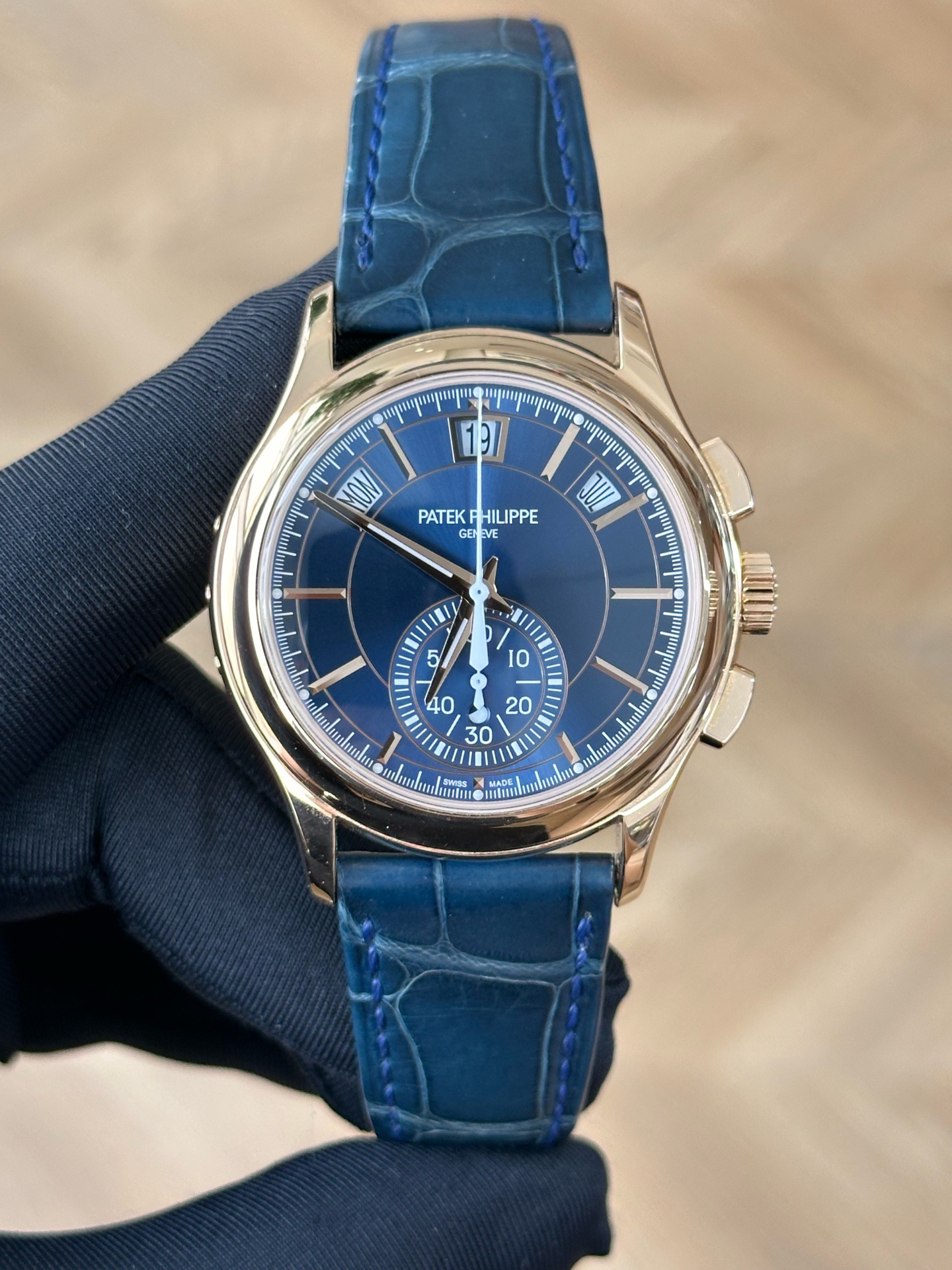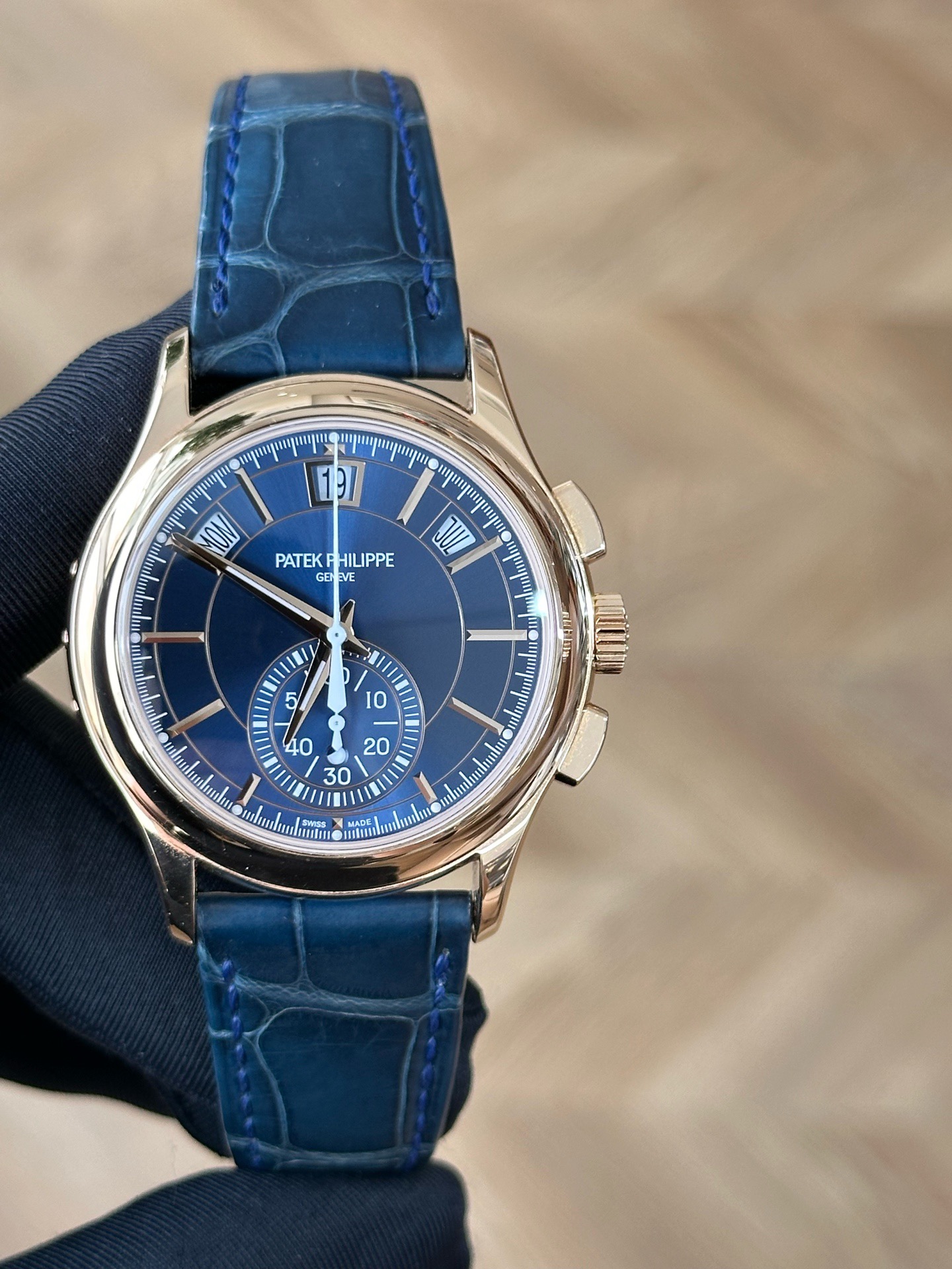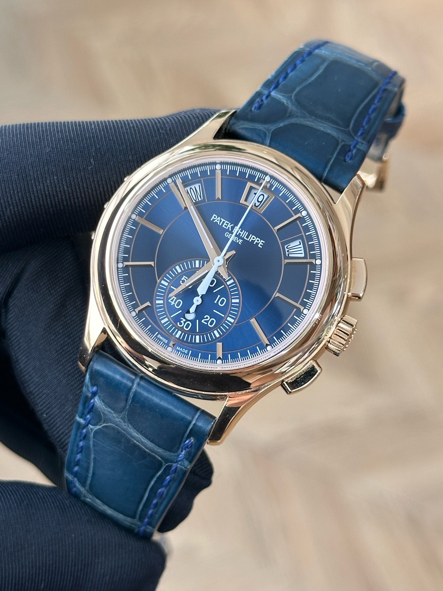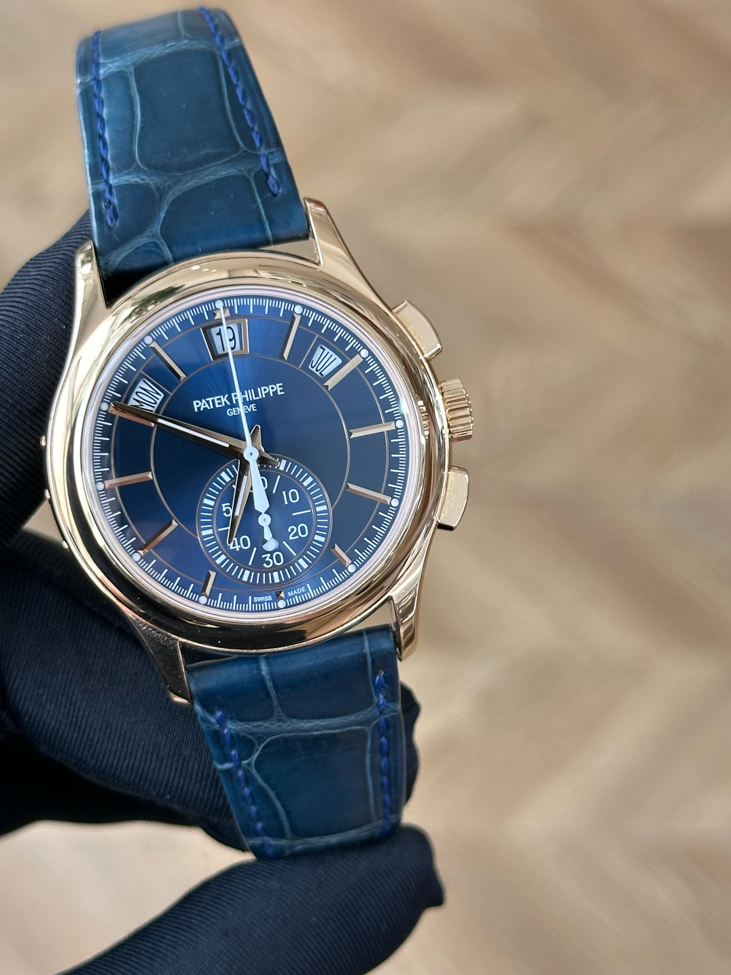 百达翡丽/Patek Philippe 复杂功能时计系列 5905R-010 自动上弦 玫瑰金款式 表壳直径:42毫米表径;蓝盘新款,针扣,日期/星期/月份/年历/计时功能;专柜价783100;全套
