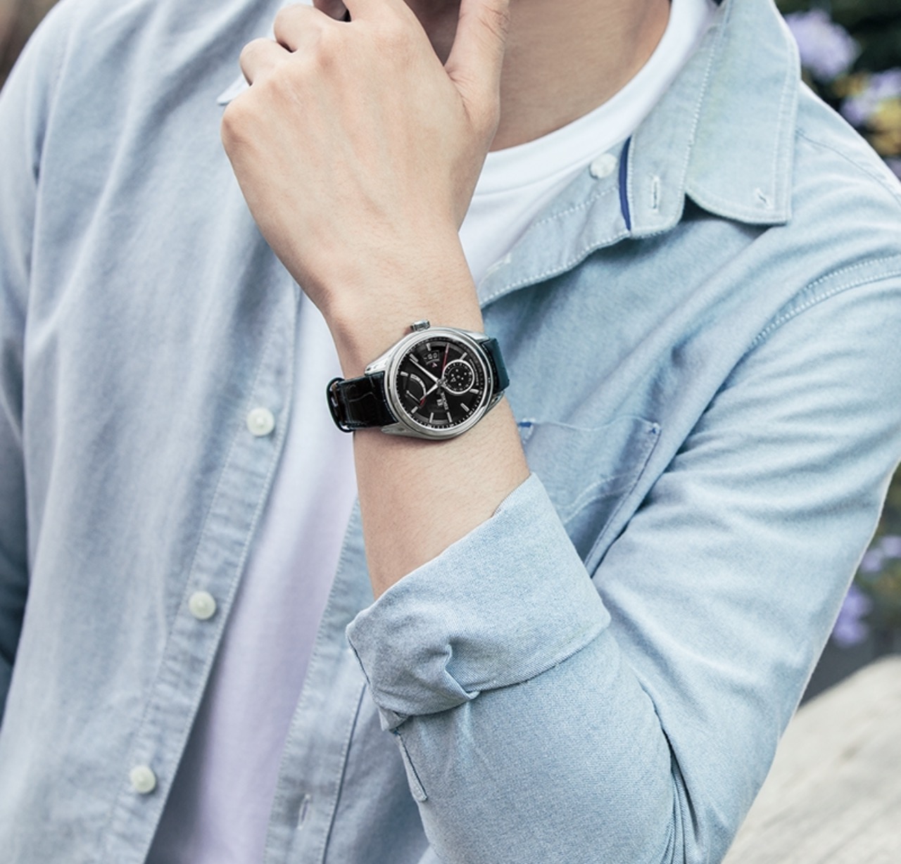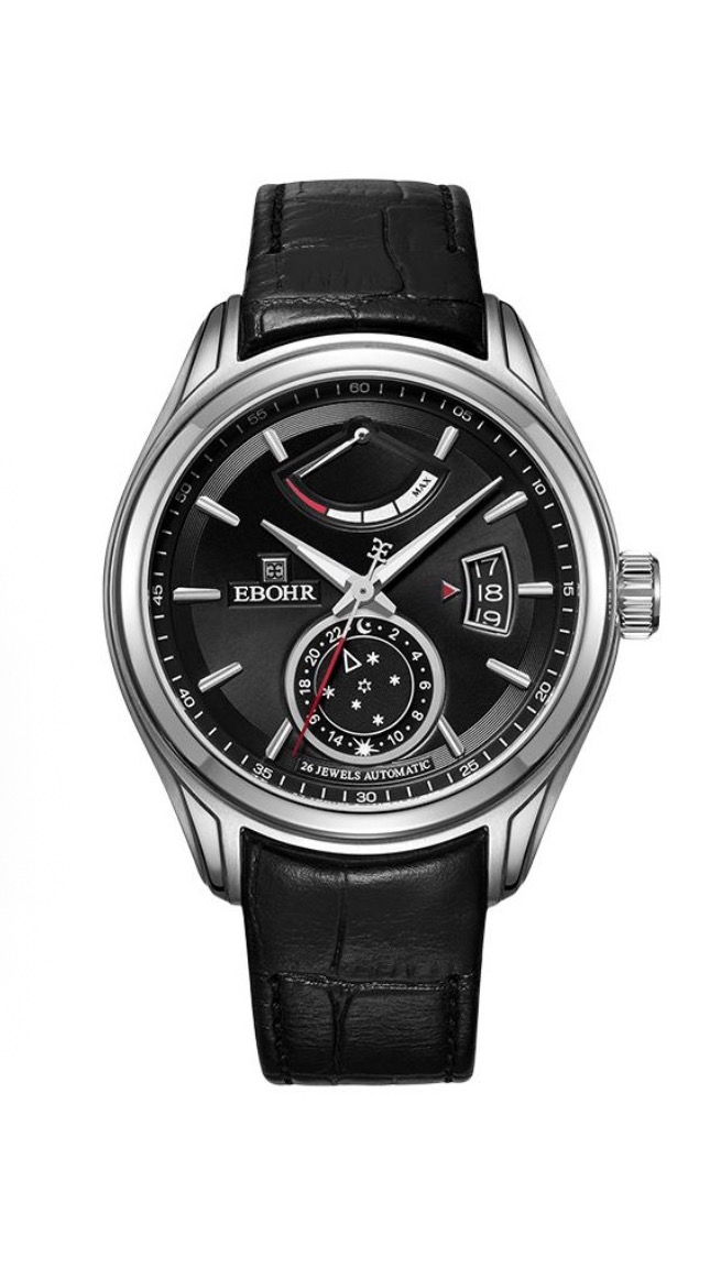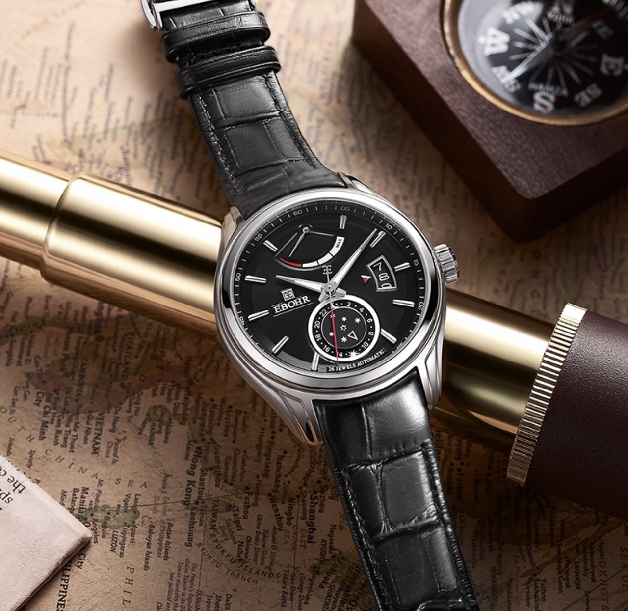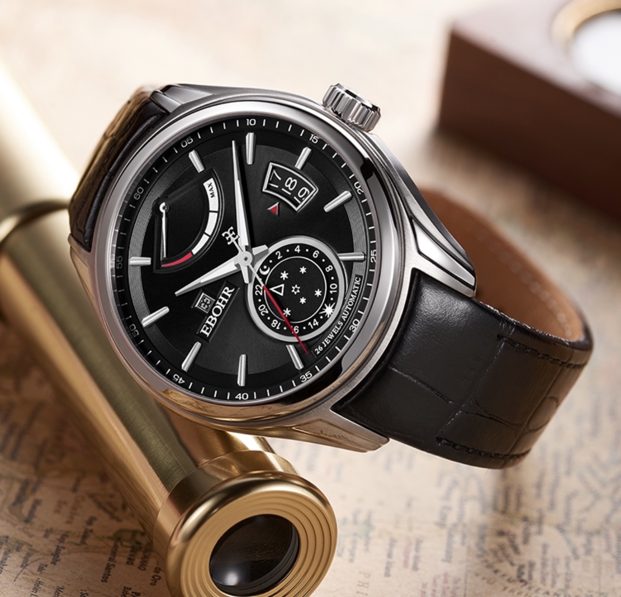 依波表 潮流时尚商务风 10940334机械机芯 牛皮表带 国表 42.5毫米 男表 黑色表盘 防水 日历 动能显示 专柜售价4580 全新全套未使用近期保卡