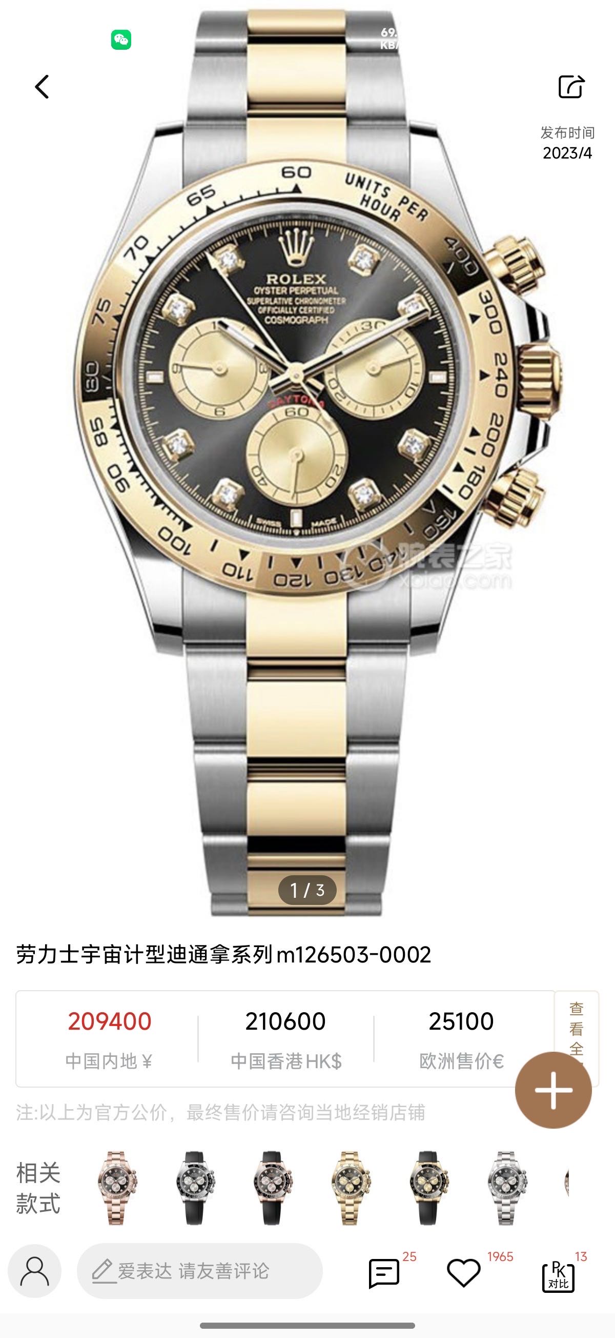 劳力士宇宙计型迪通拿 黑钻间金迪 M126503-0002机械男性