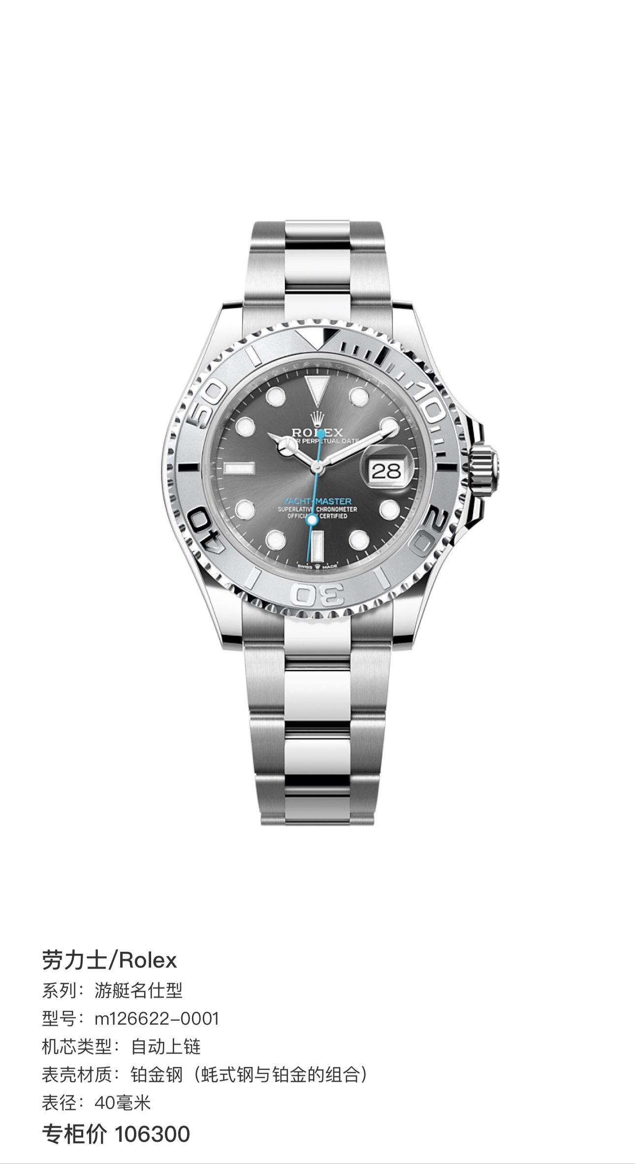 劳力士/Rolex 游艇名仕型 m126622-0001 自动上链 铂金钢(蚝式钢与铂金的组合) 40毫米 专柜价106300