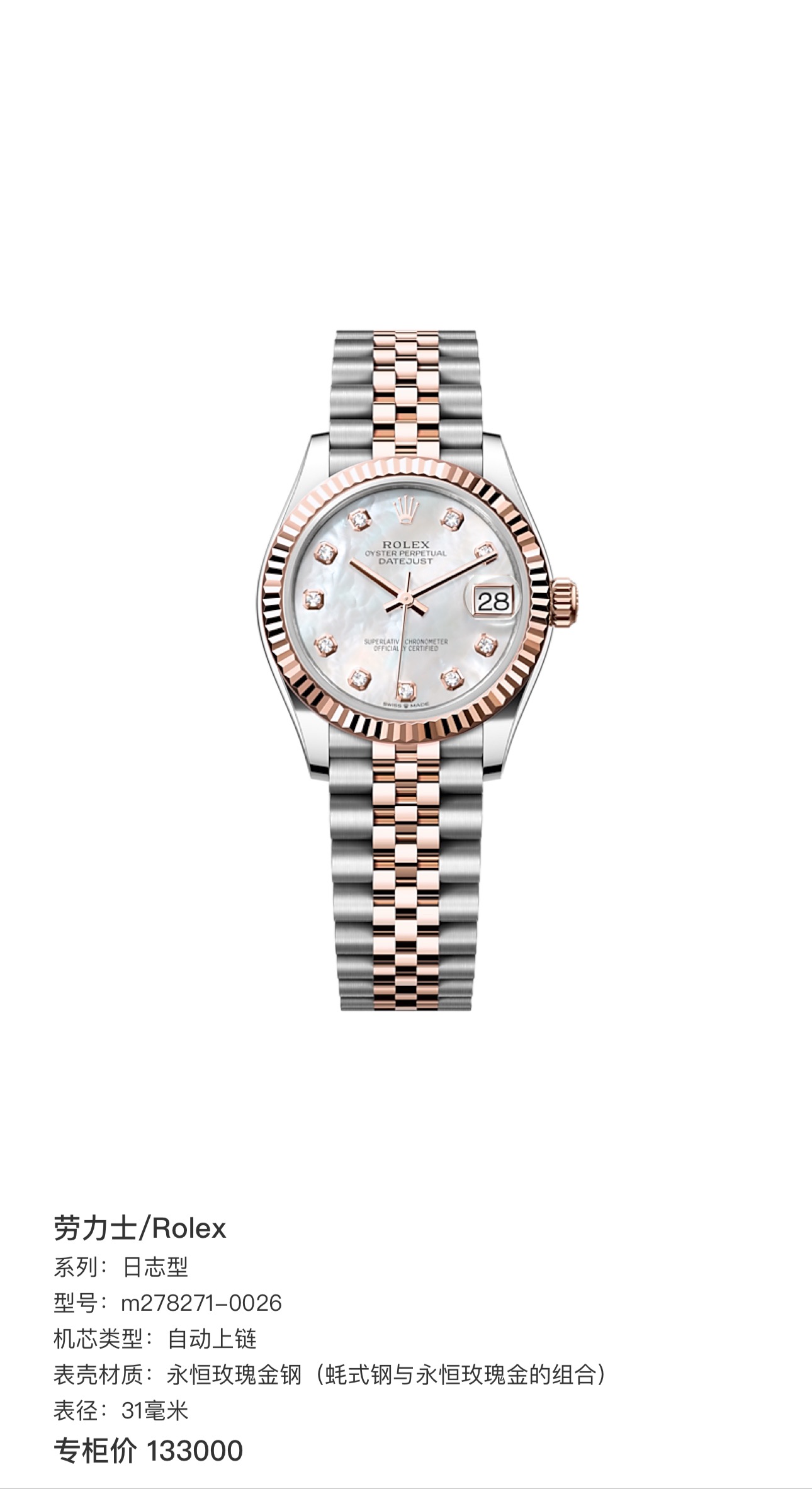 劳力士/Rolex 日志型 m278271-0026 自动上链 永恒玫瑰金钢(蚝式钢与永恒玫瑰金的组合) 31毫米 专柜价133000
