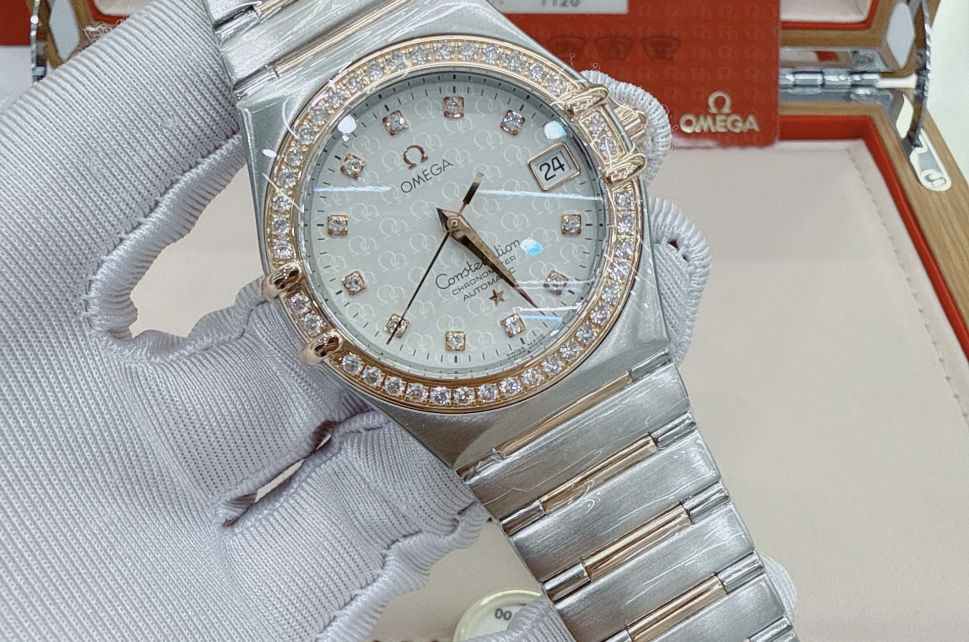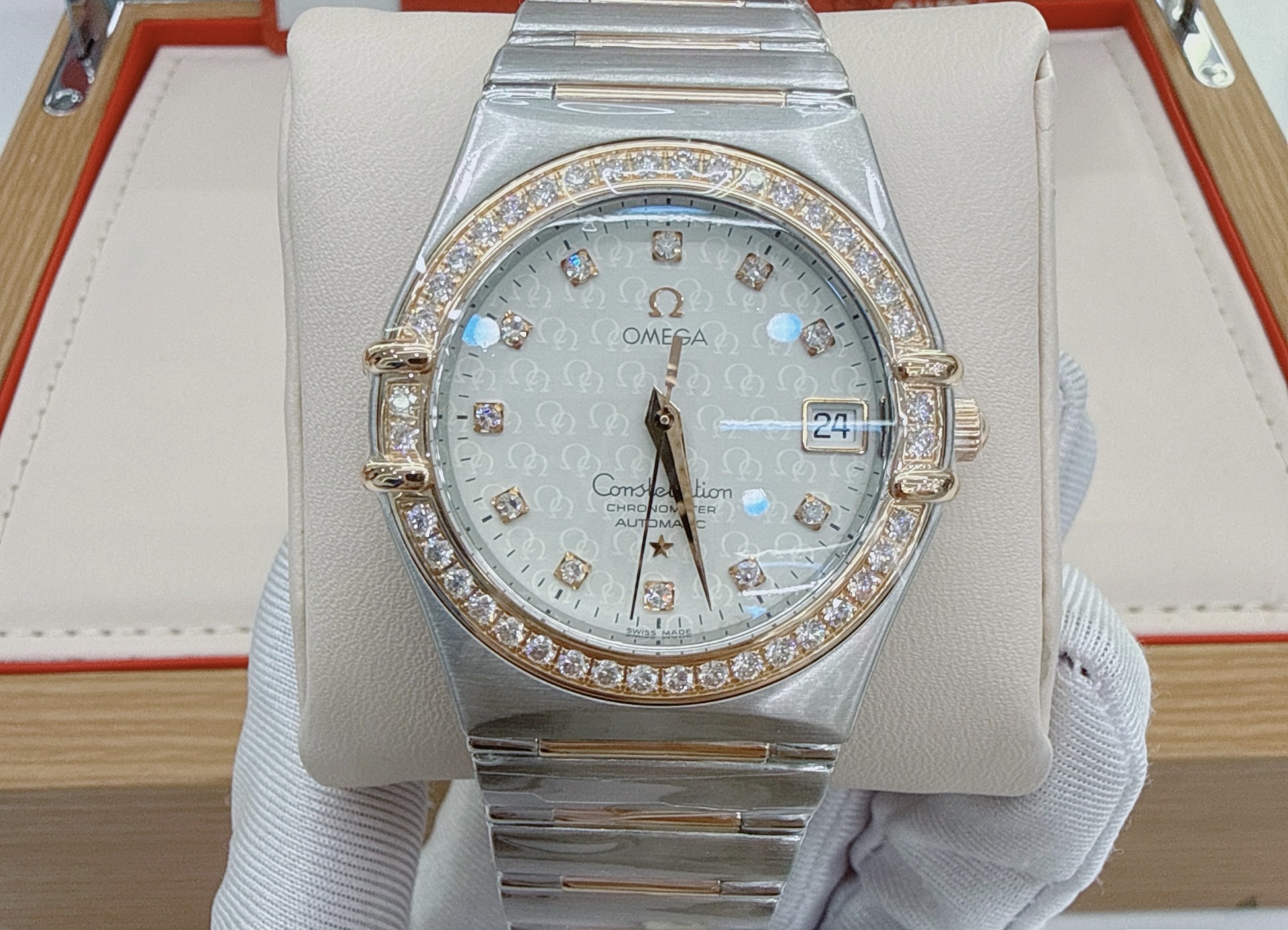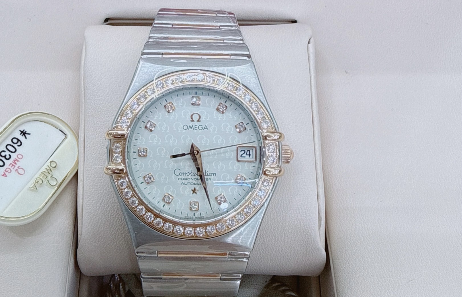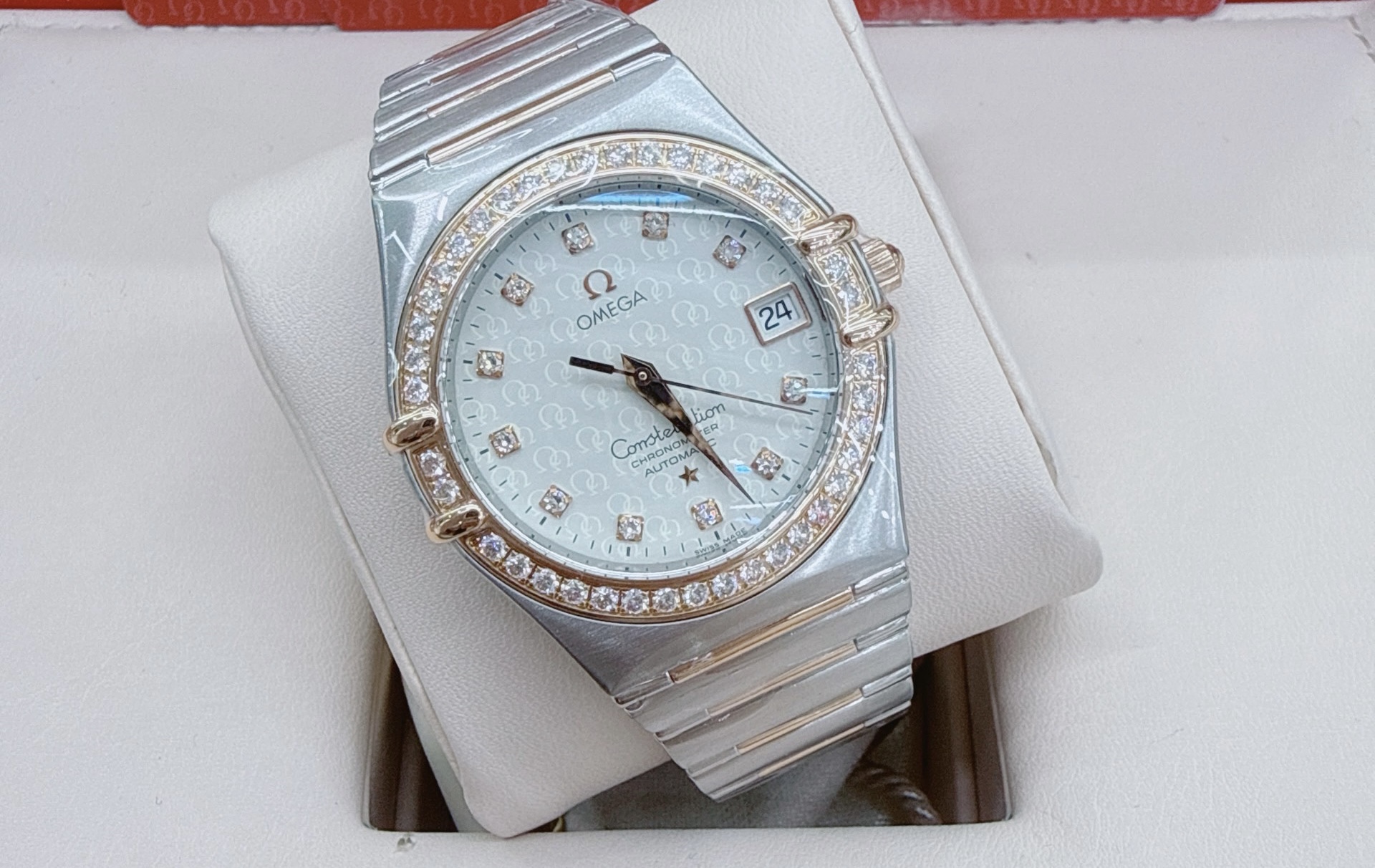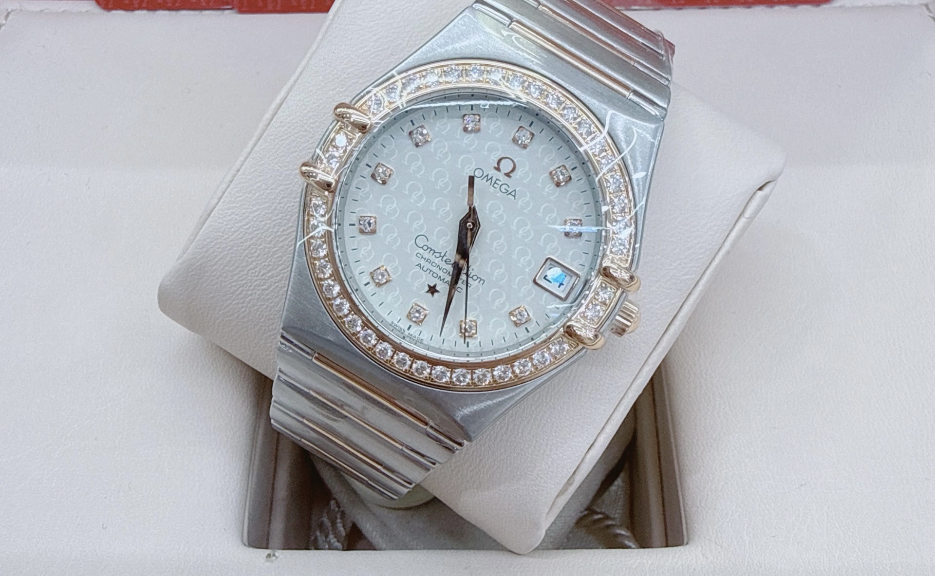 35mm表径,精钢材质表壳,日期显示,镶钻时标