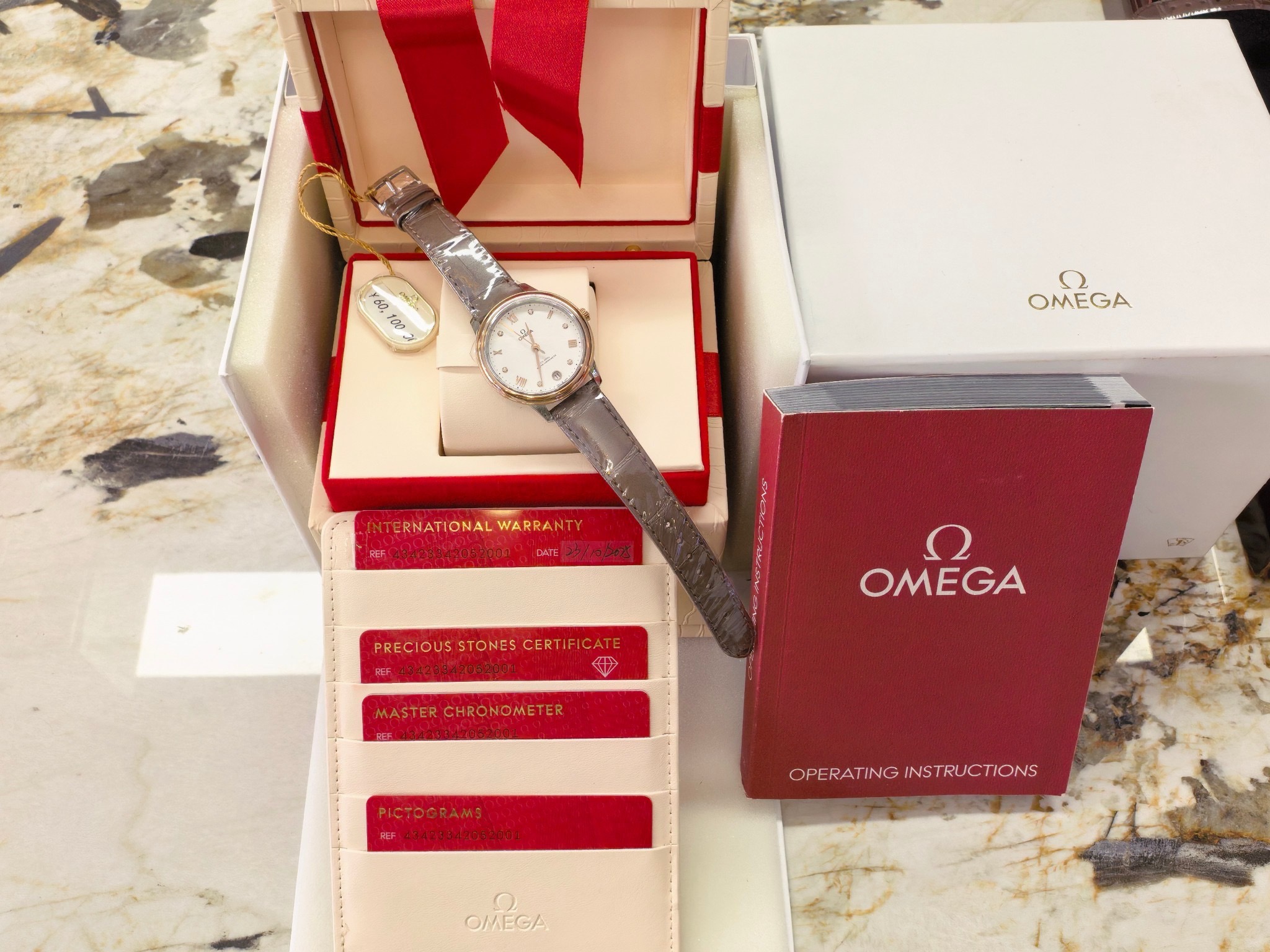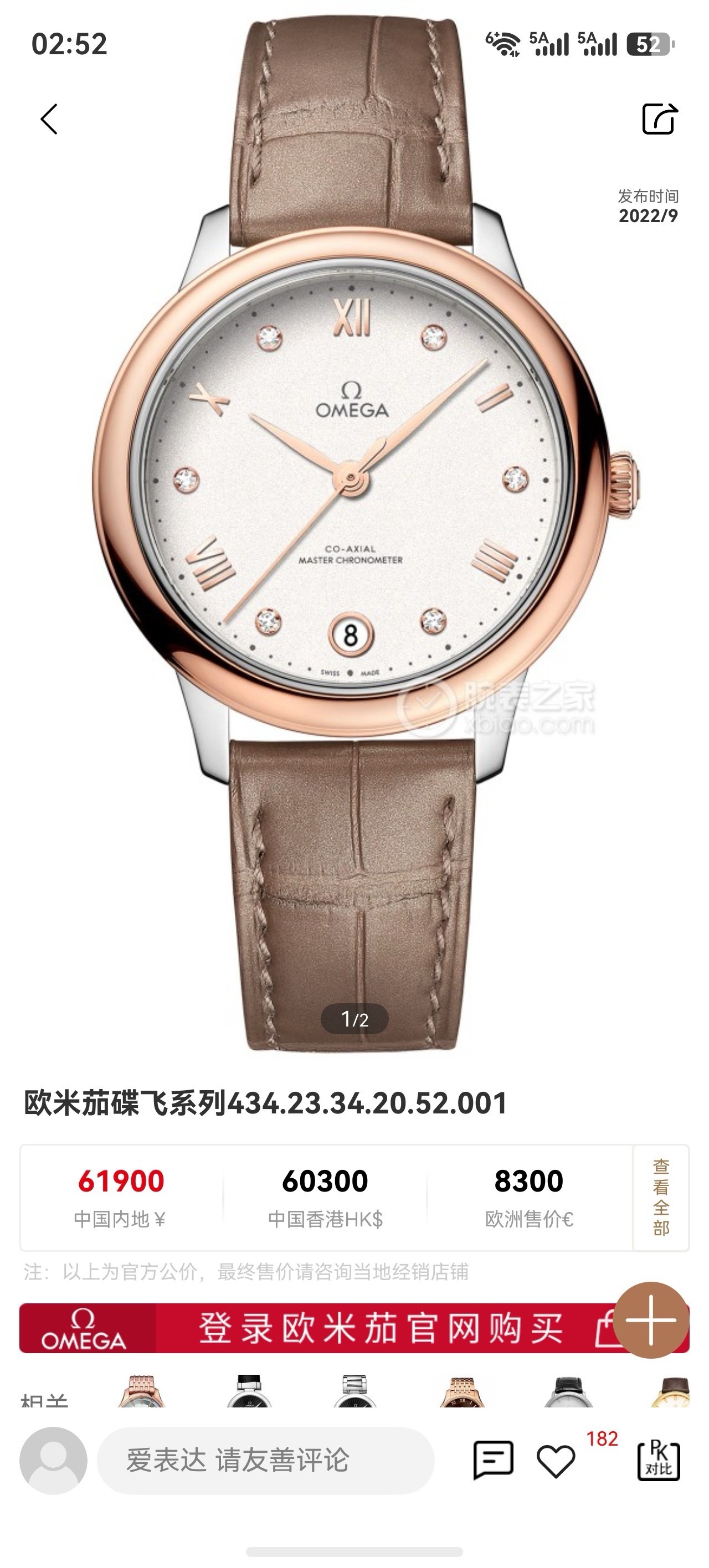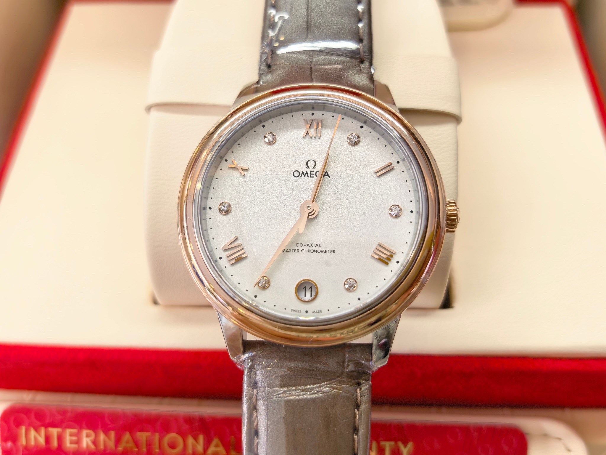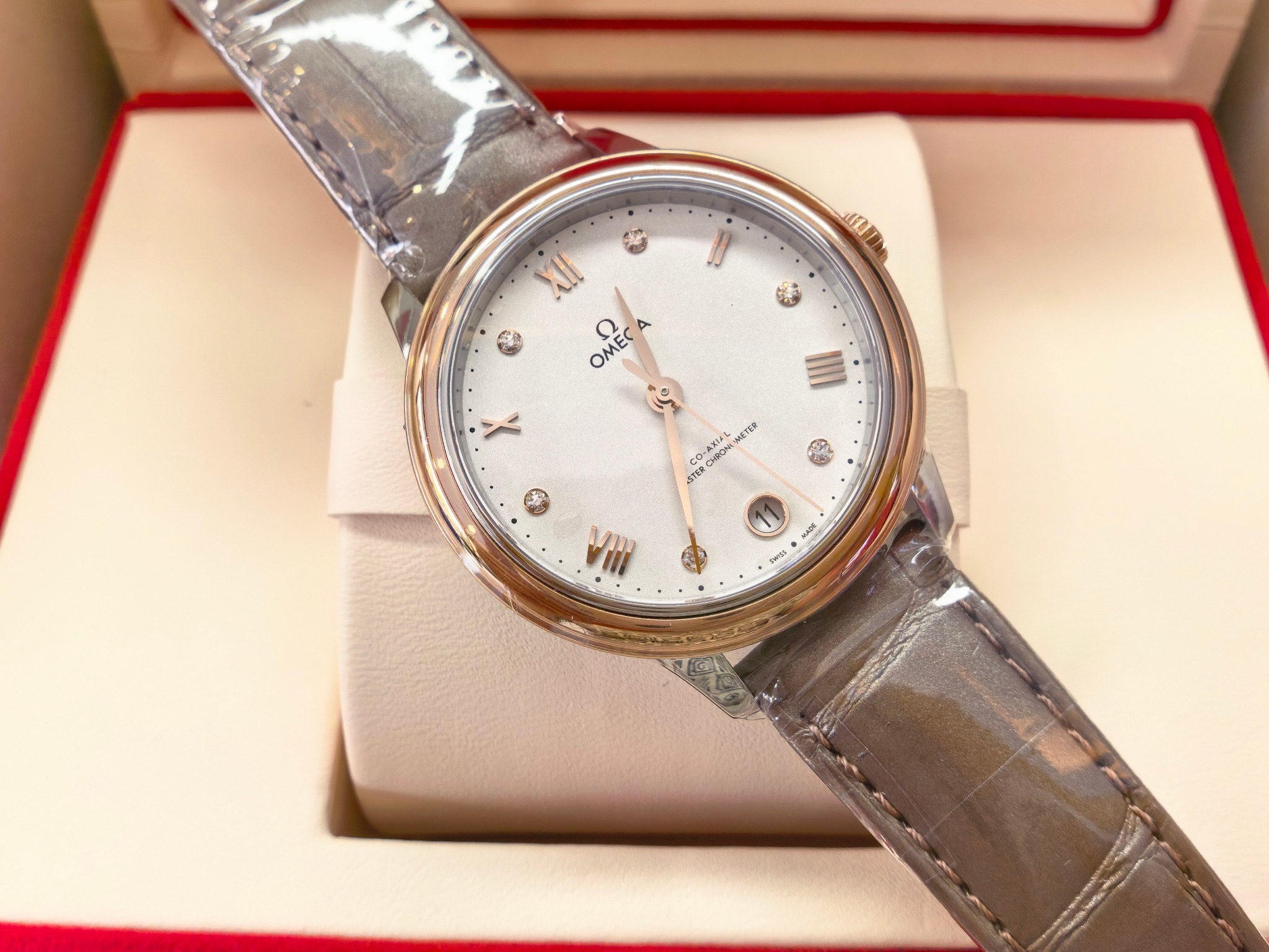 欧米茄碟飞系列434.23.34.20.52.001 自动机械腕表 客户2025年10月全新未使用购买 全新未拆封 原装膜都在 最新款碟飞 表径34mm 银白色表盘镶钻 18K金玫瑰金 背透8800机芯 公价61900 现货全新未使用未拆封好价
