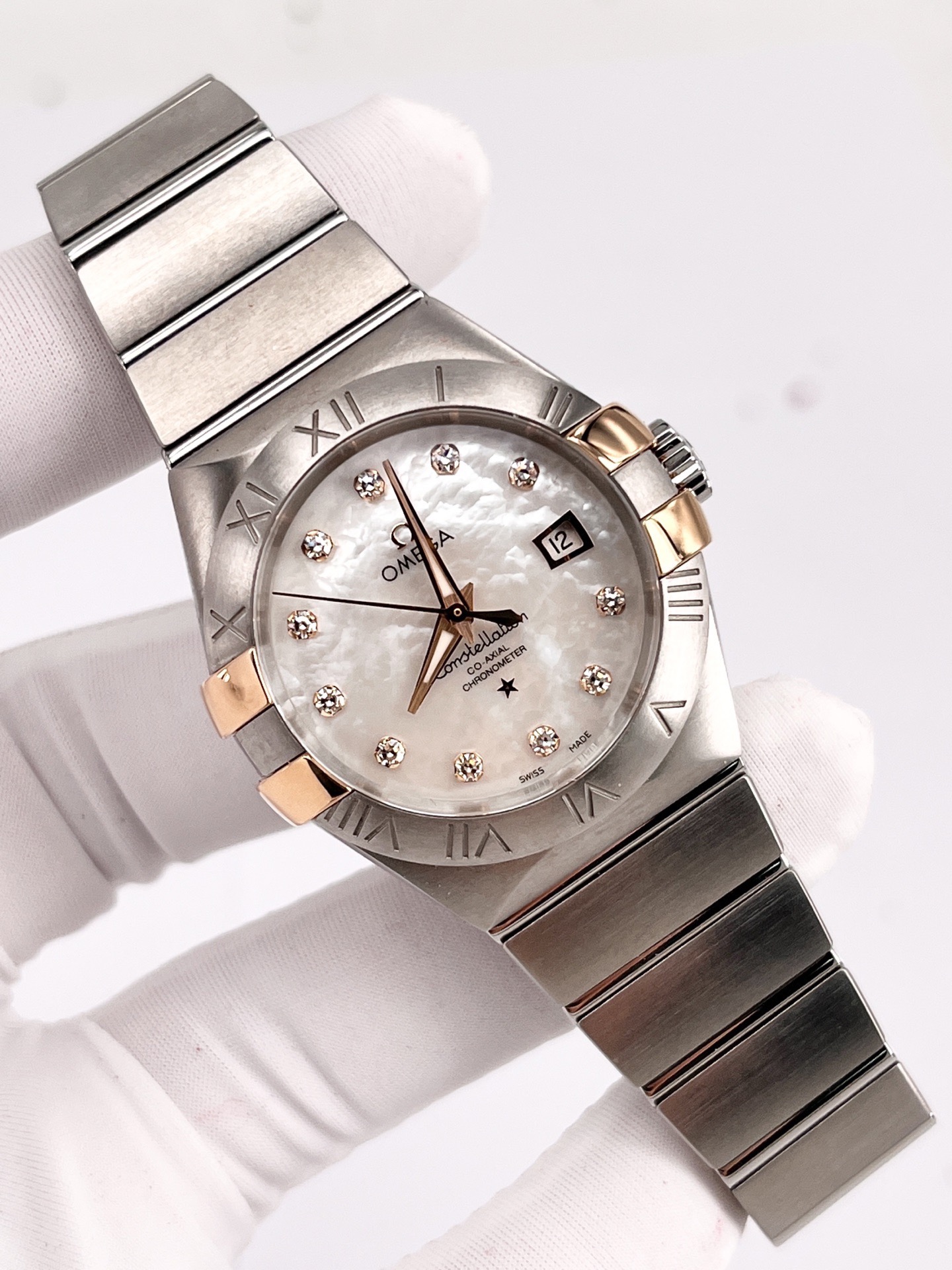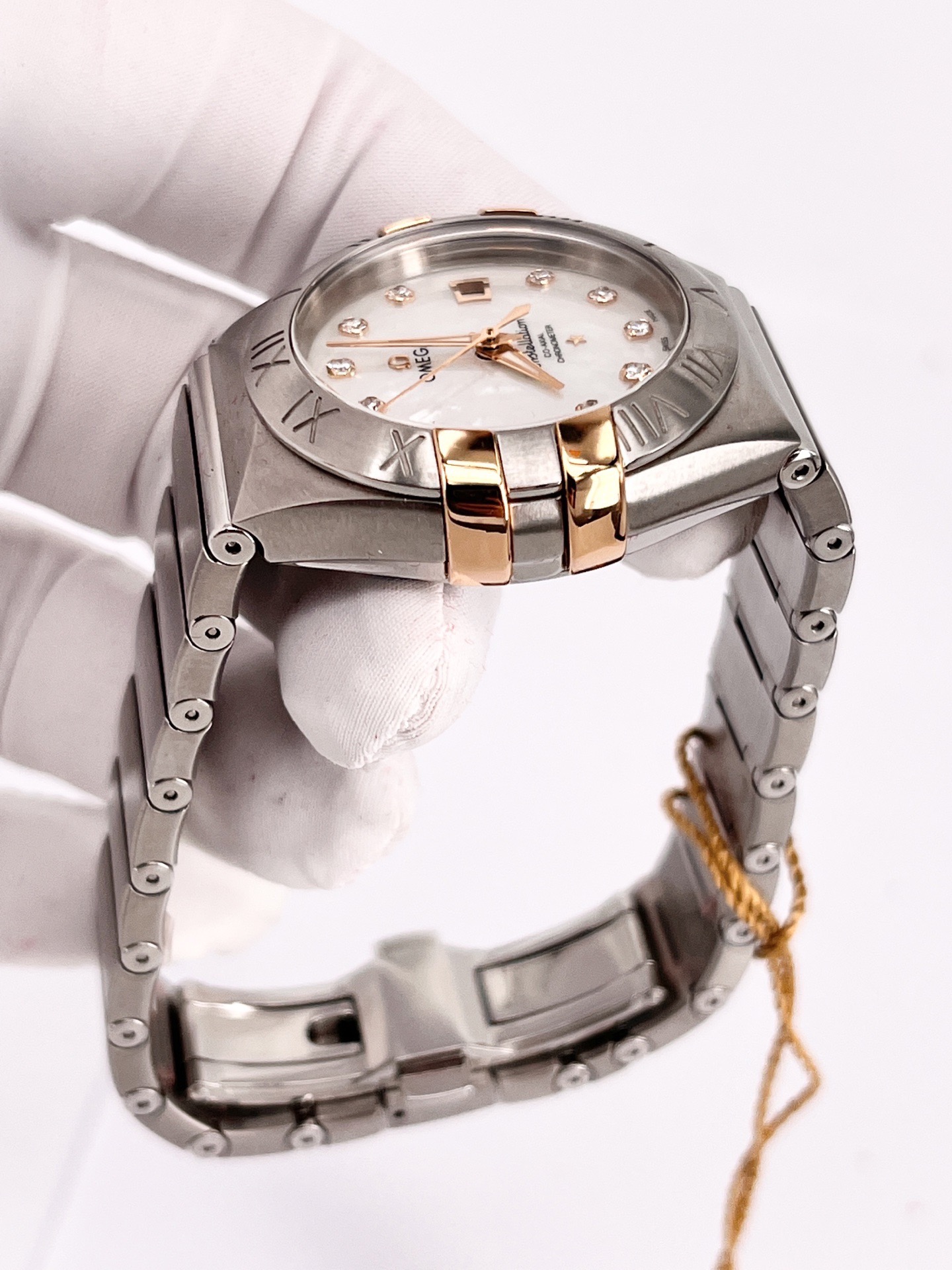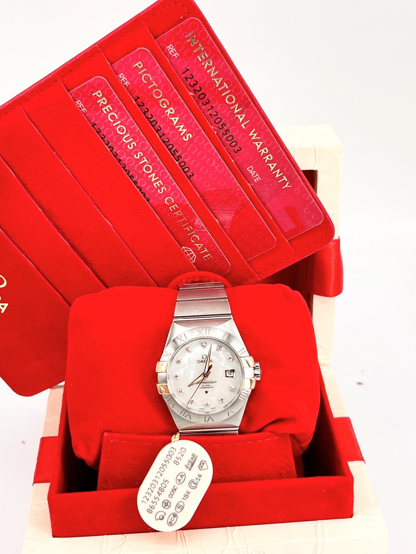 欧米茄星座系列123.20.31.20.55.003,全套空白卡未使用,自动机械腕表,全套附件如图,31mm 表径,白色珍珠贝母表盘,折叠扣,100m 防水,不锈钢材质/18k黄金,钻石刻度,日期显示。公价 59000,现好价