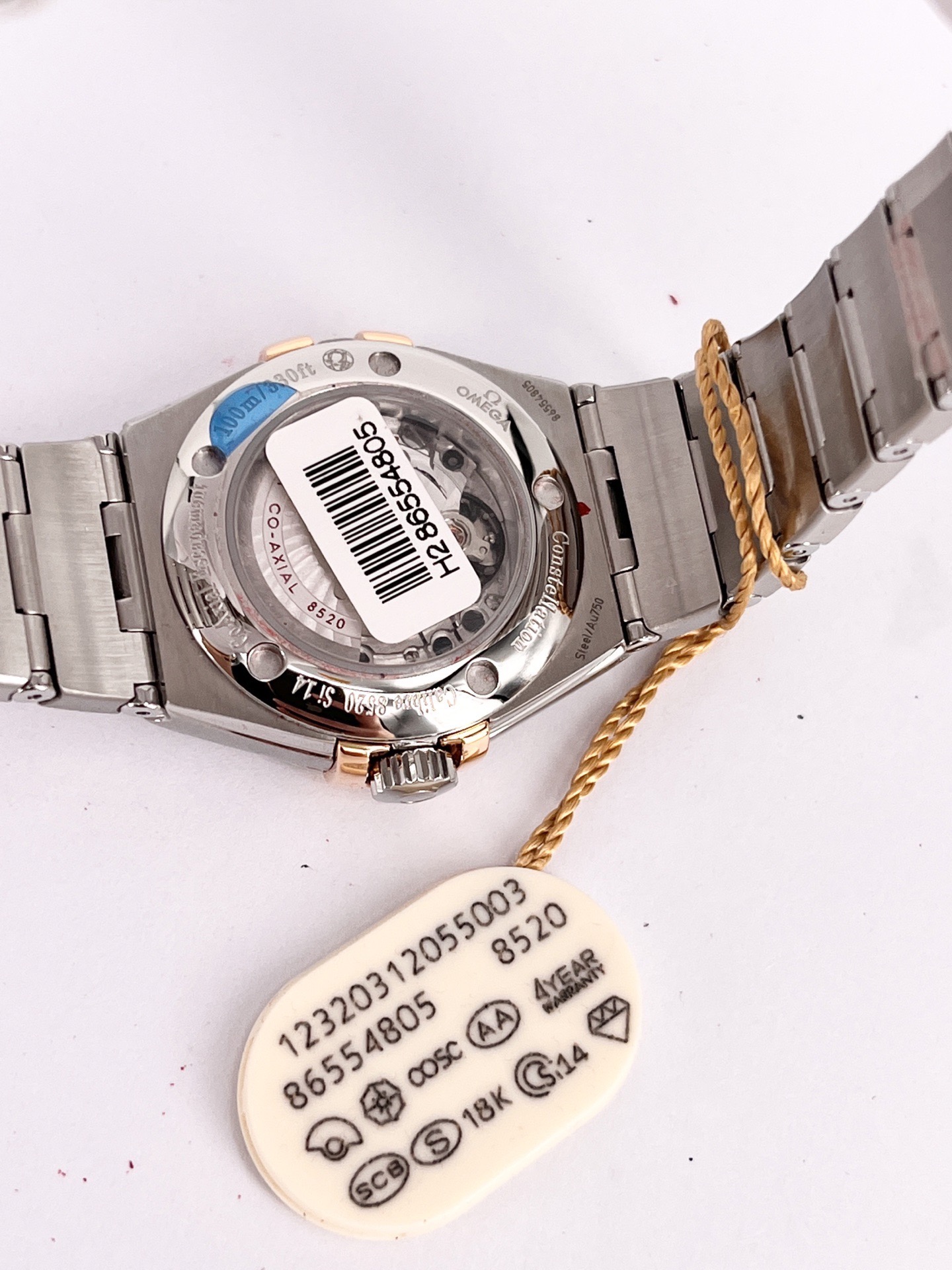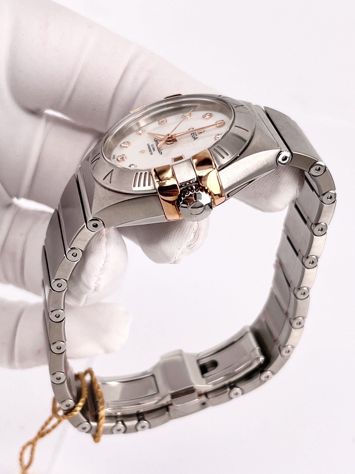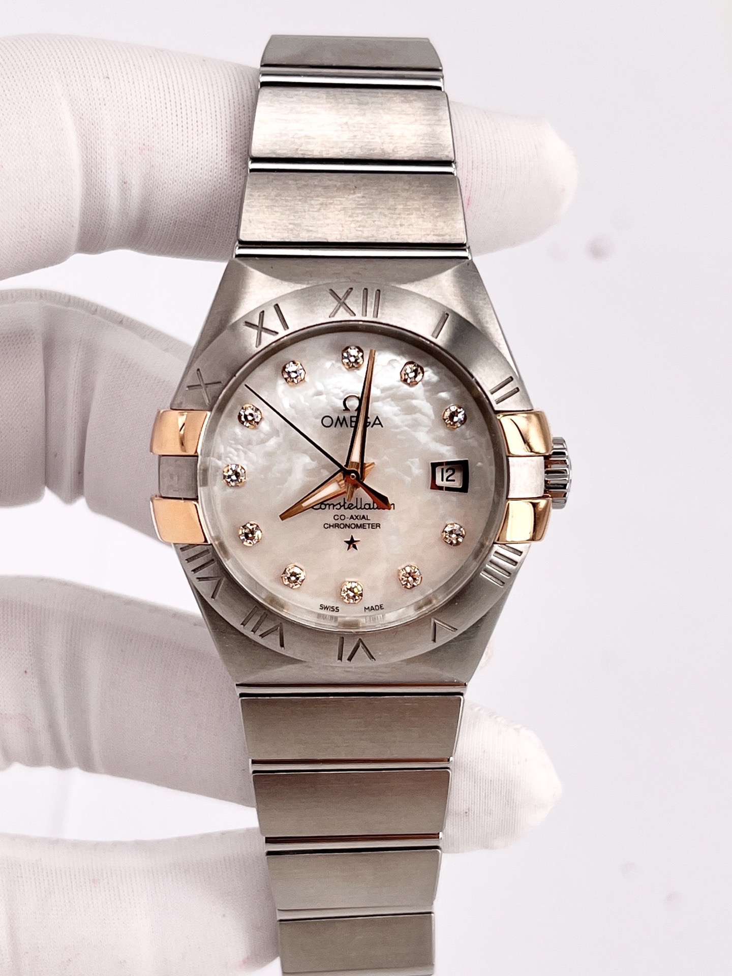 欧米茄星座系列123.20.31.20.55.003,全套空白卡未使用,自动机械腕表,全套附件如图,31mm 表径,白色珍珠贝母表盘,折叠扣,100m 防水,不锈钢材质/18k黄金,钻石刻度,日期显示。公价 59000,现好价