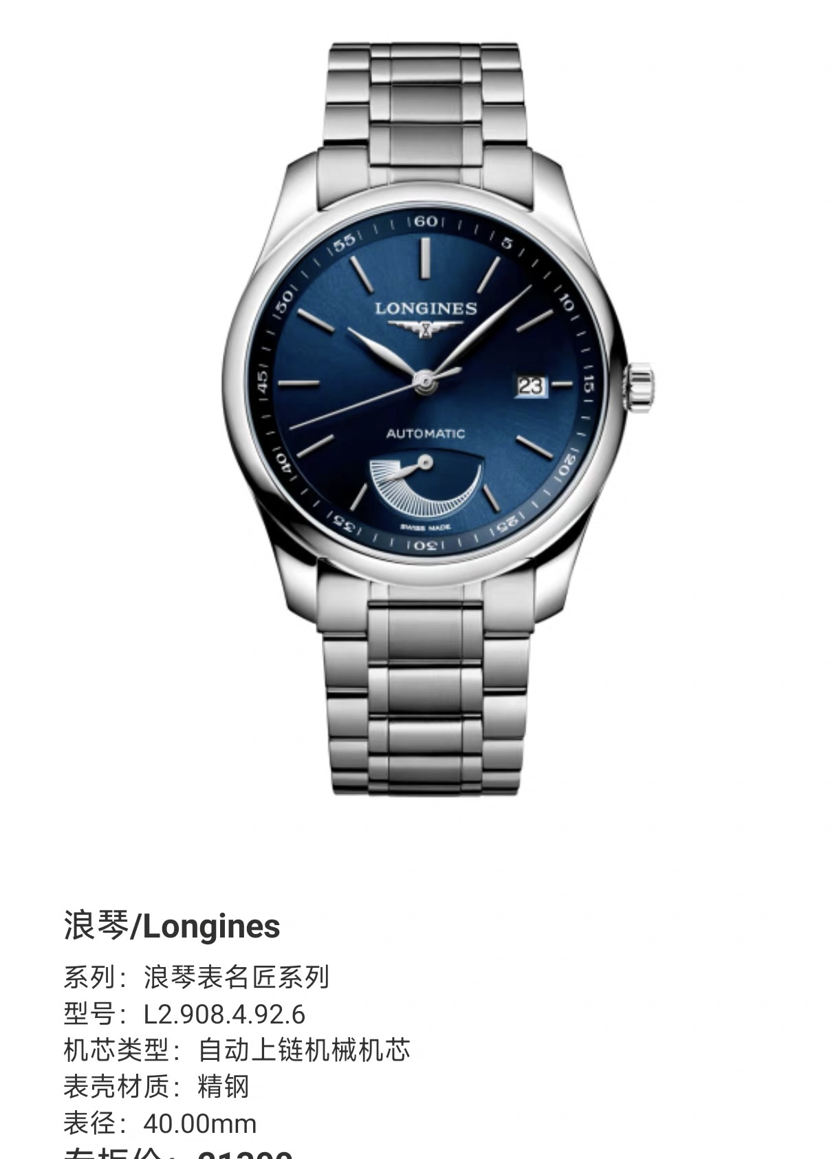 40mm表径,精钢材质表壳,日期显示,动力储备