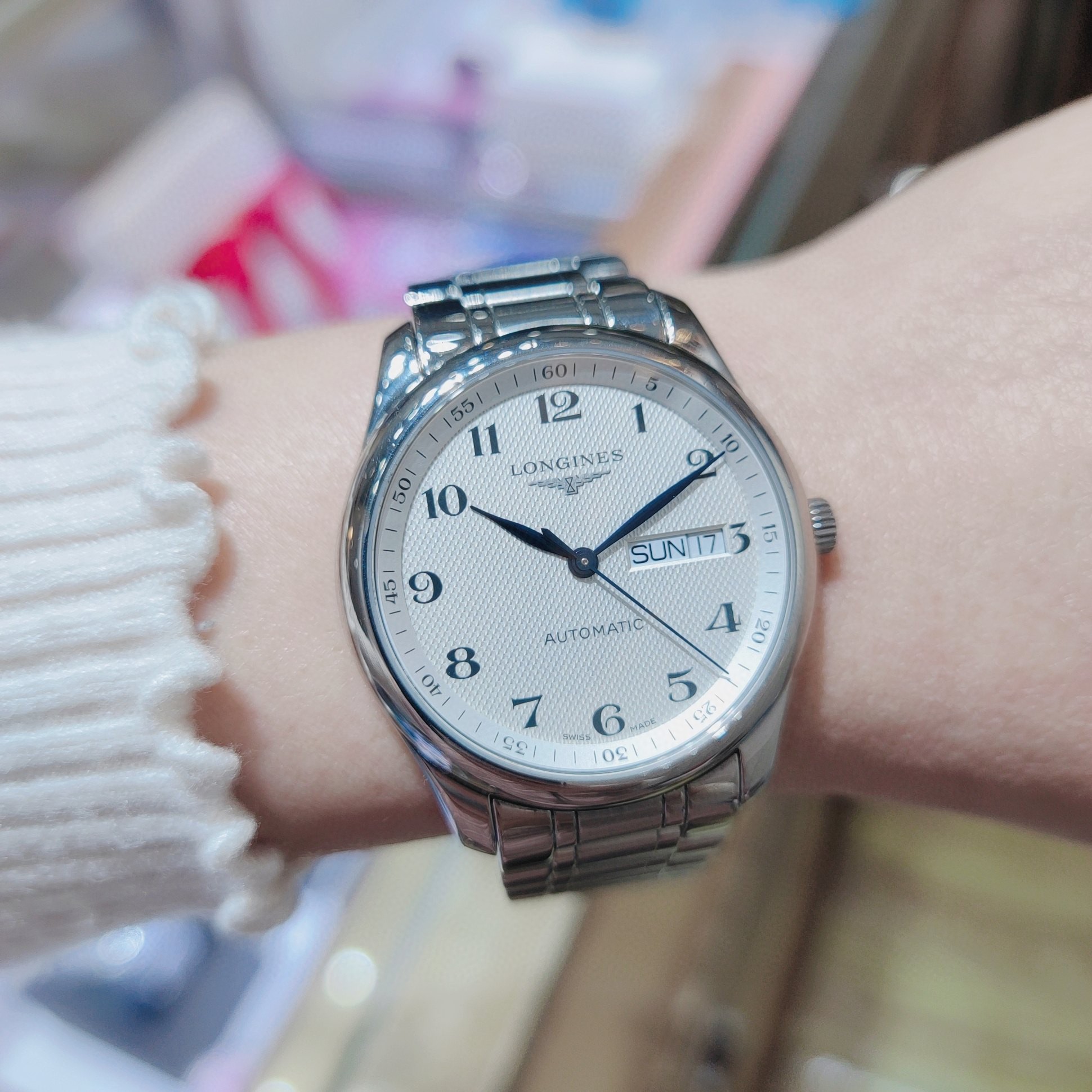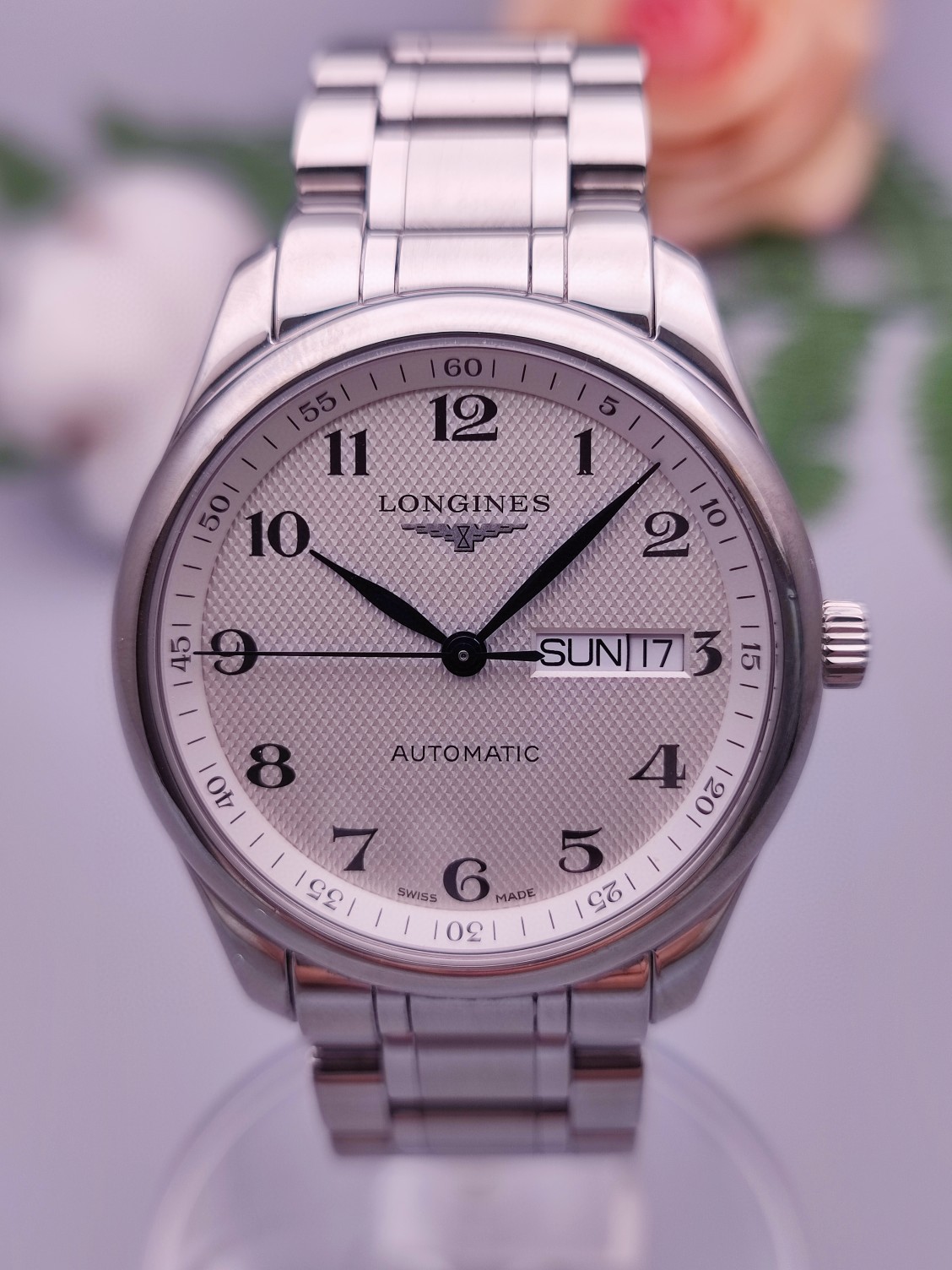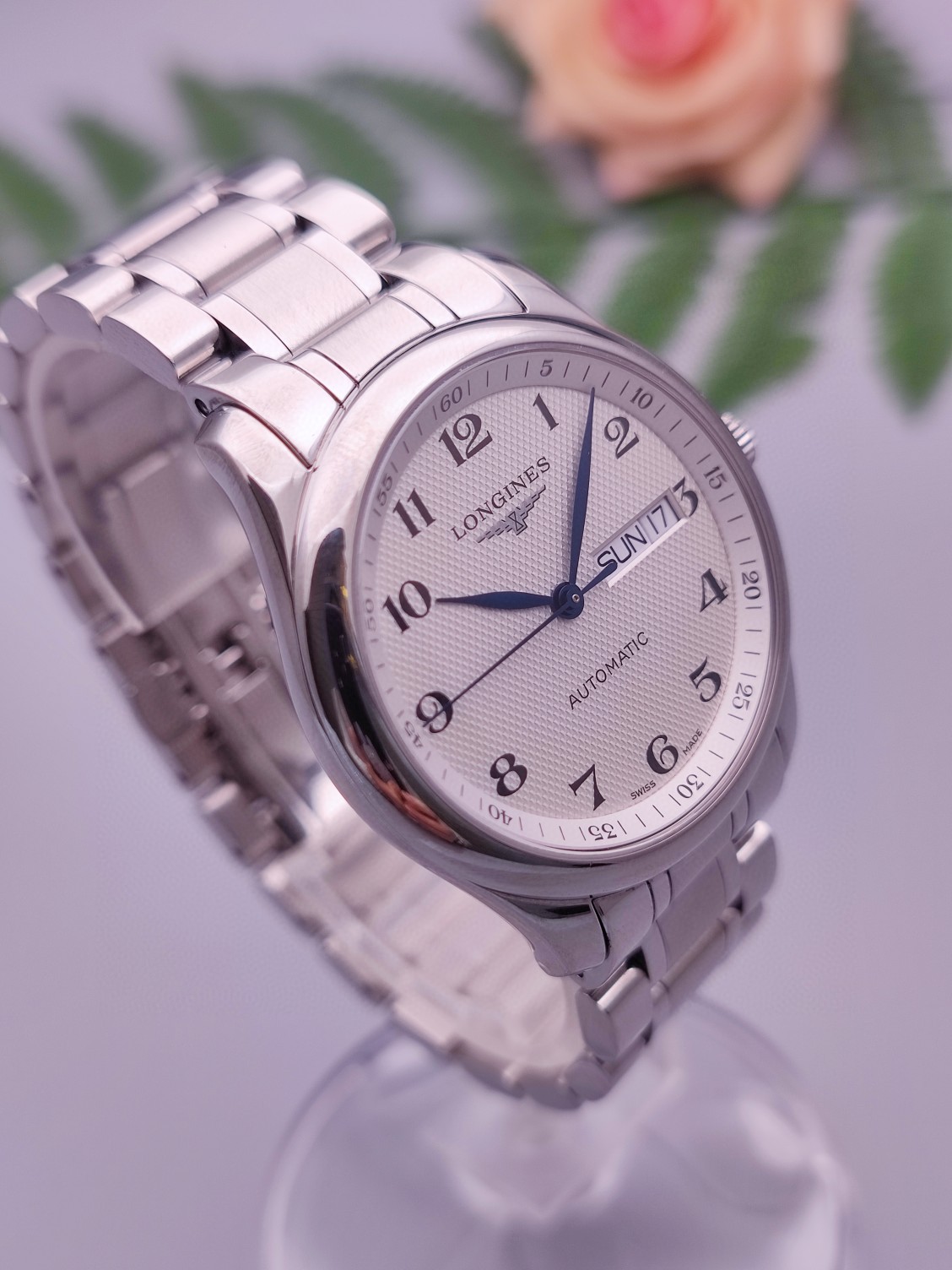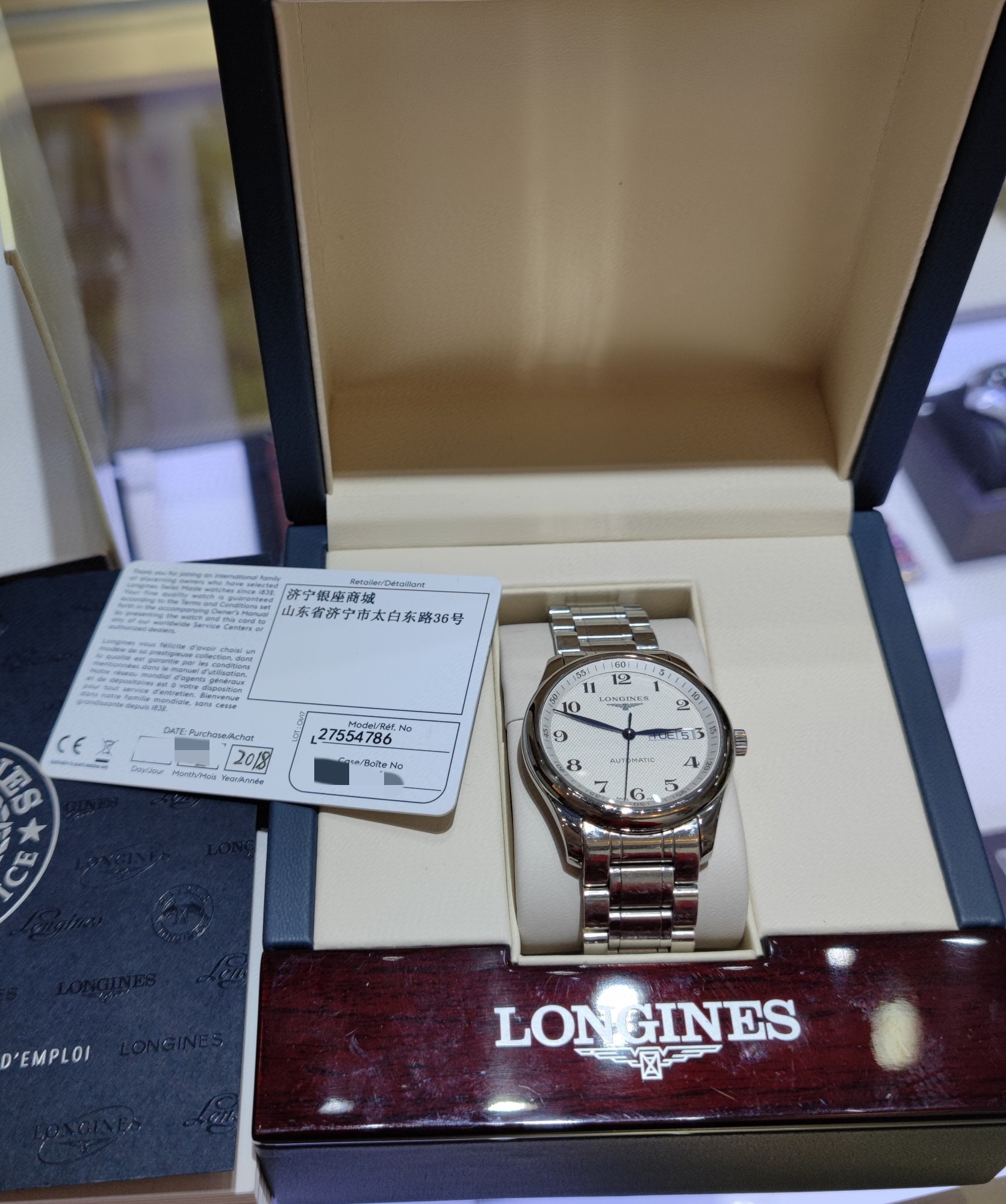 浪琴名匠系列机械男L2.755.4.78.6,经典麦粒饰纹白面,幽蓝指针、双历显示,全套齐全,18年2月购入,表径38.5mm,原装皮带,成色98近新,针面镜完美,走时精准,热门款,专柜价17100。