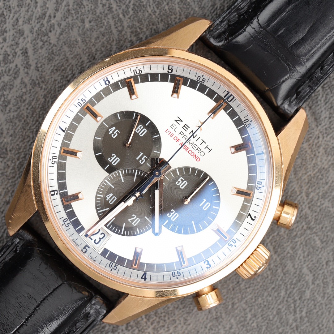 真力时 EL PRIMERO -18.2040.4052/21.C496 (JSY1104),18K玫瑰金,男士自动机械腕表,表径:42mm,店铺保修一年,专柜参考价:158000元!