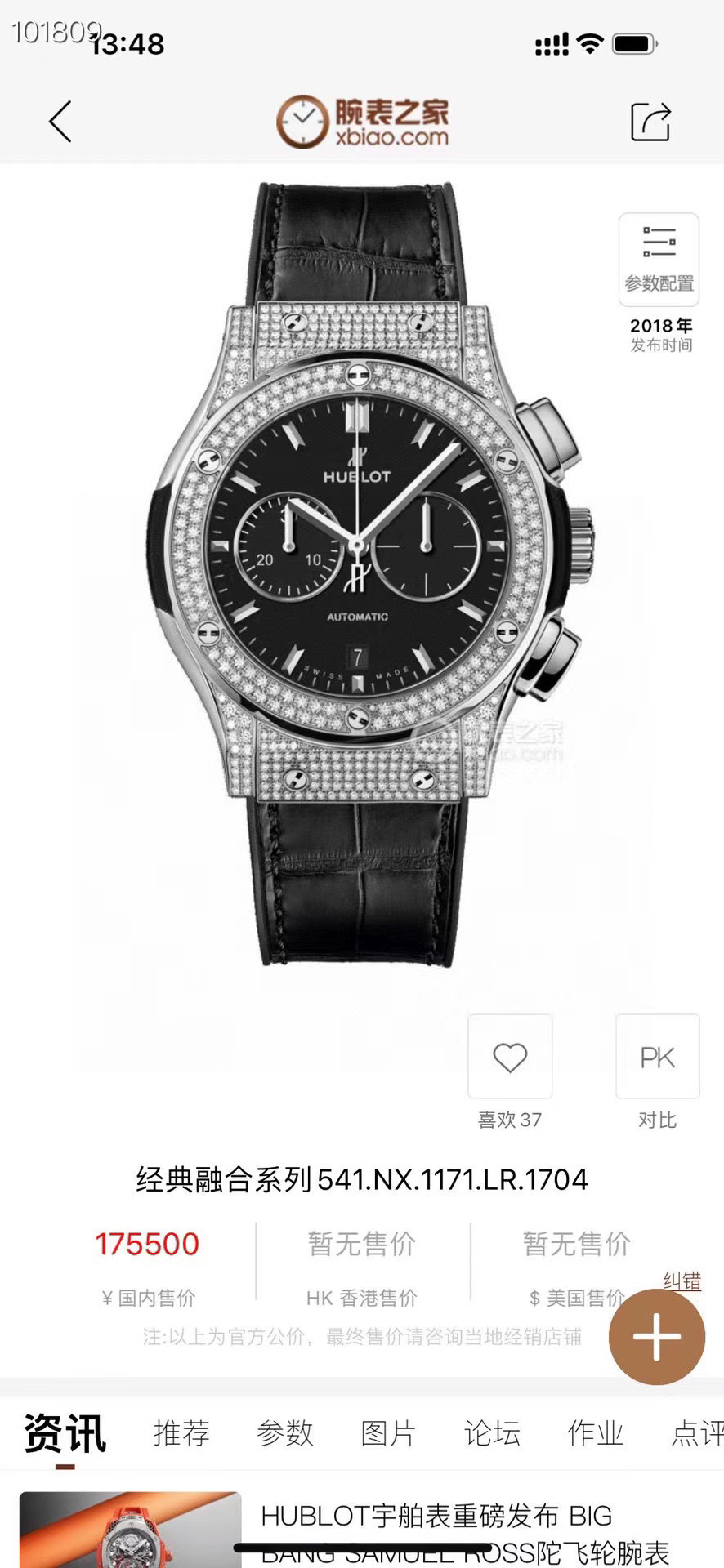【宇舶经典融合541.NX.1171.RX完美升级为541.NX.1171.LR.1704黑盘】自动机械42毫米 男士腕表 材质:钛金属后镶钻 原钻参考价:175500