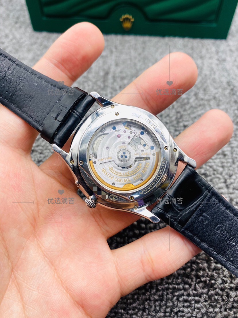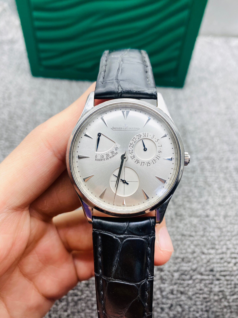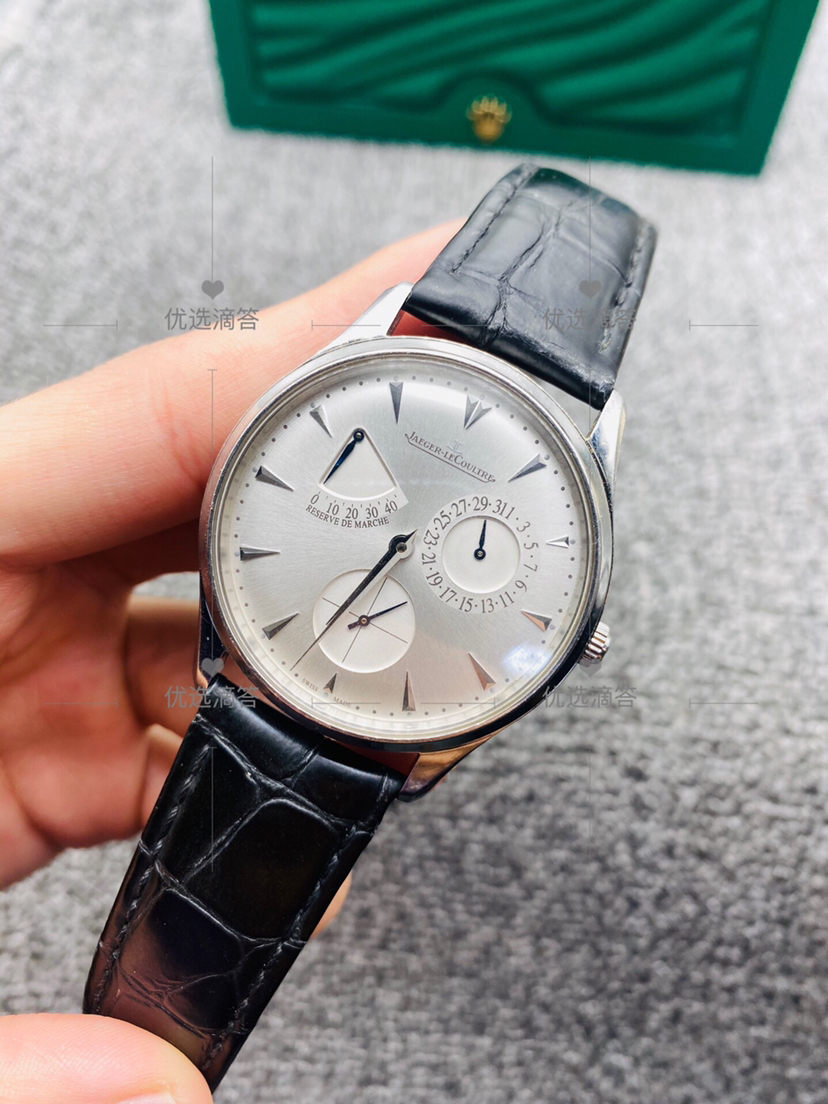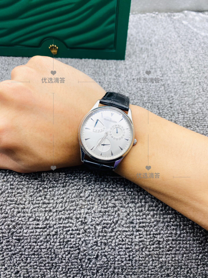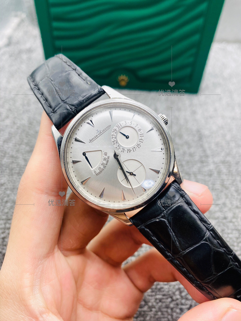 积家大师系列Q1378420,俗称“小丑”,39mm表径自动机械,放射状拉丝银色表盘 镀铑时标 太妃形指针 背透 折叠扣,小秒盘 动储 日期显示 附件:极品全套 专柜价:76000