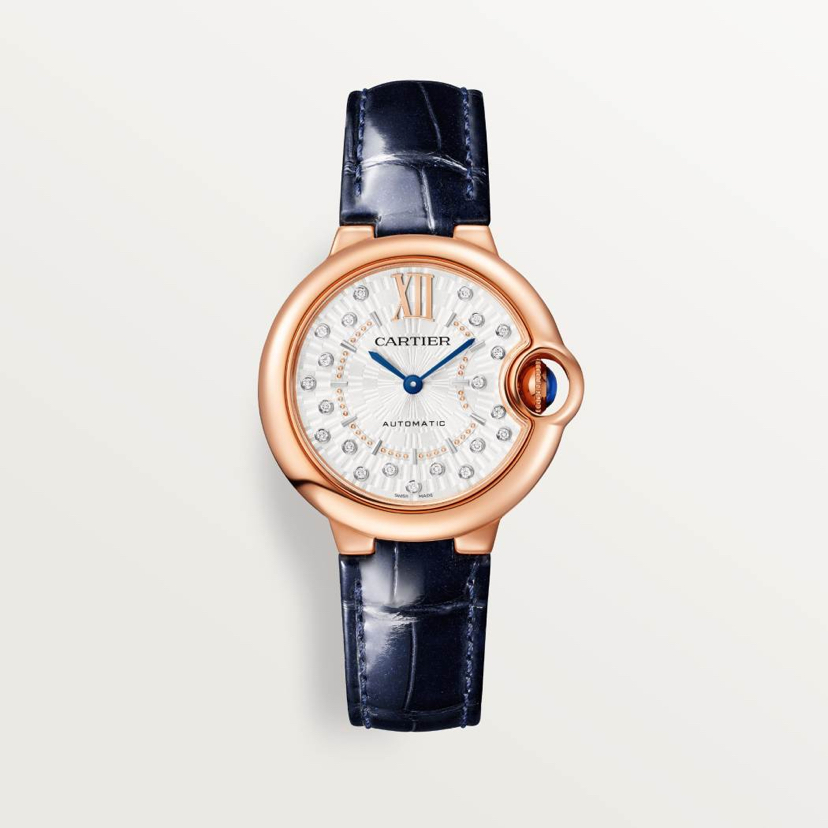 Ballon Bleu de Cartier卡地亚蓝气球腕表,33毫米表款,自动上链机械机芯。750/1000玫瑰金表壳,750/1000玫瑰金凹槽式表冠,镶嵌1颗凸圆形蓝宝石。哑光镀银转印阳光射线纹饰表盘,镶嵌21颗明亮式切割圆钻,总重0.10克拉。剑形蓝钢指针。合成蓝宝石水晶镜面。蓝色鳄鱼皮表带,750/1000玫瑰金针扣式表扣。厚度:9.96毫米。生活防水深度3巴(约30米)。