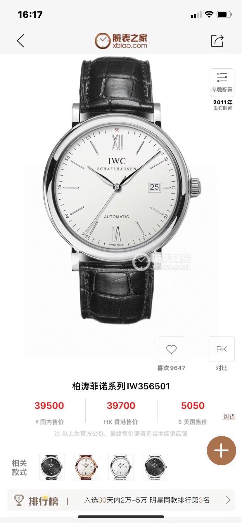 IWC万国 柏涛菲诺系列 型号:IW356501 精钢材质 自动机械男表 表径40mm 红60 白面 针扣 附件:未使用近期卡 专柜售价39500