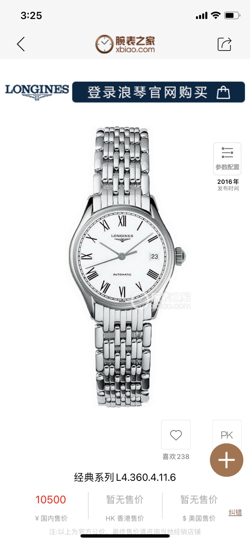 浪琴律雅系列 型号L4.360.4.11.6 腕表特征 自动机械女士 表径25mm 表壳精钢材质 背透机芯 功能日期显示 专柜价10500 附件 极品单表———顾客需知———