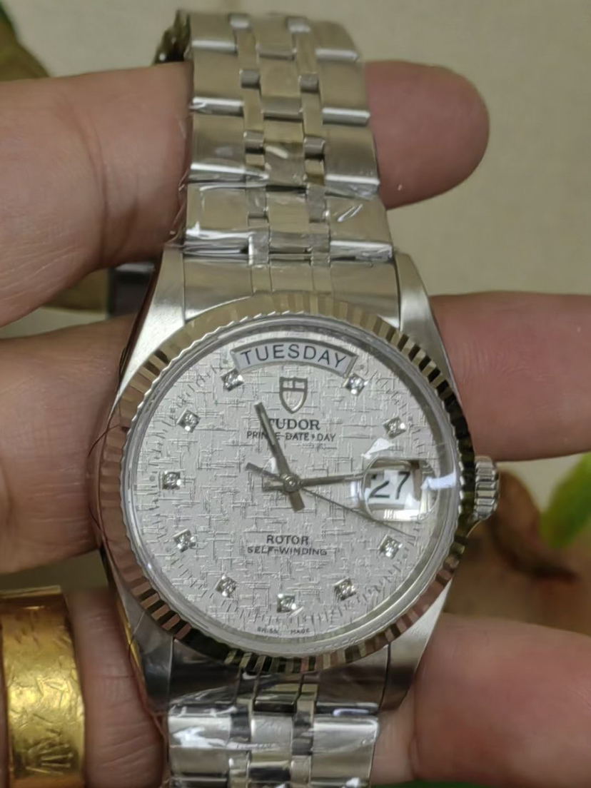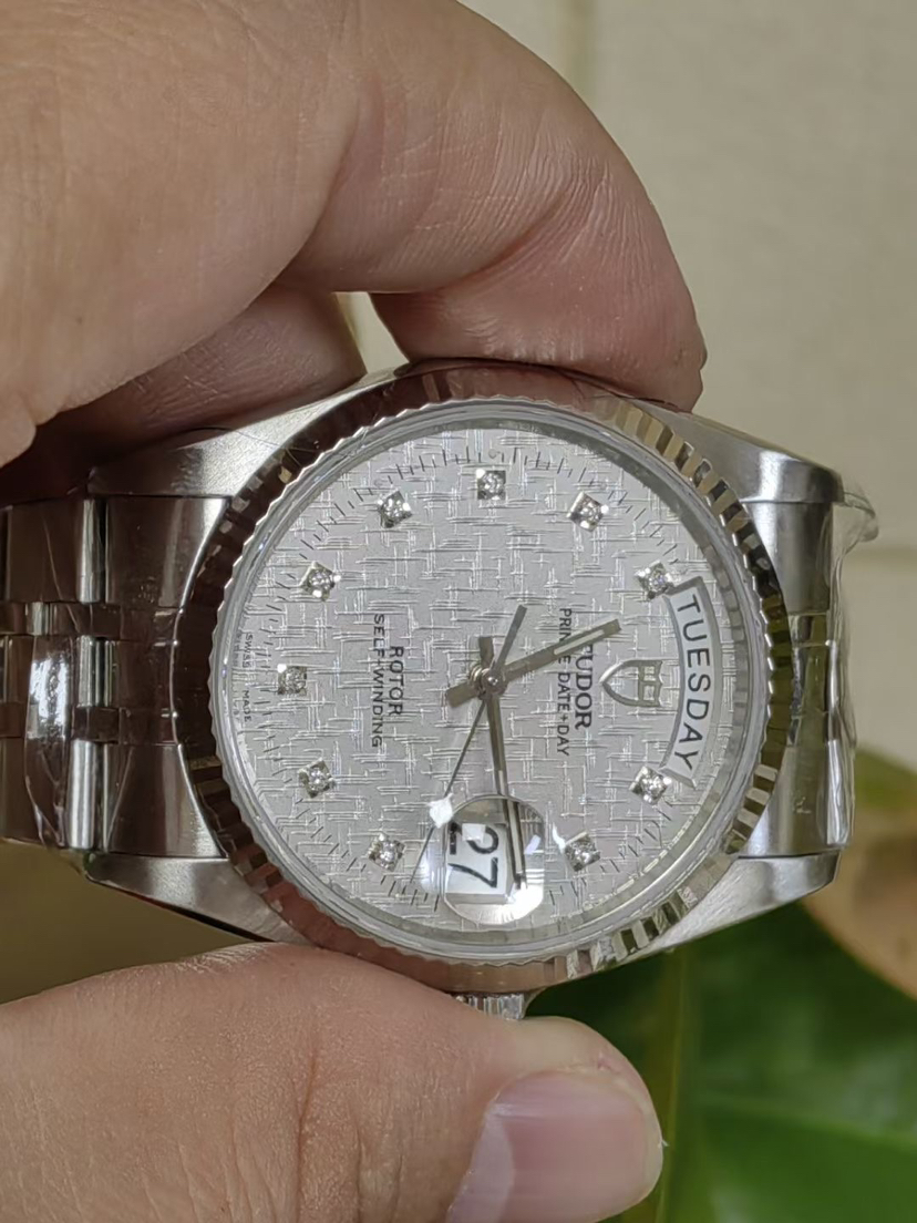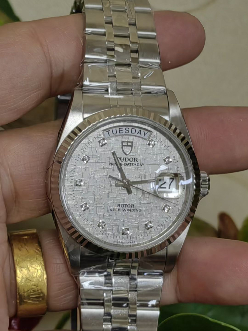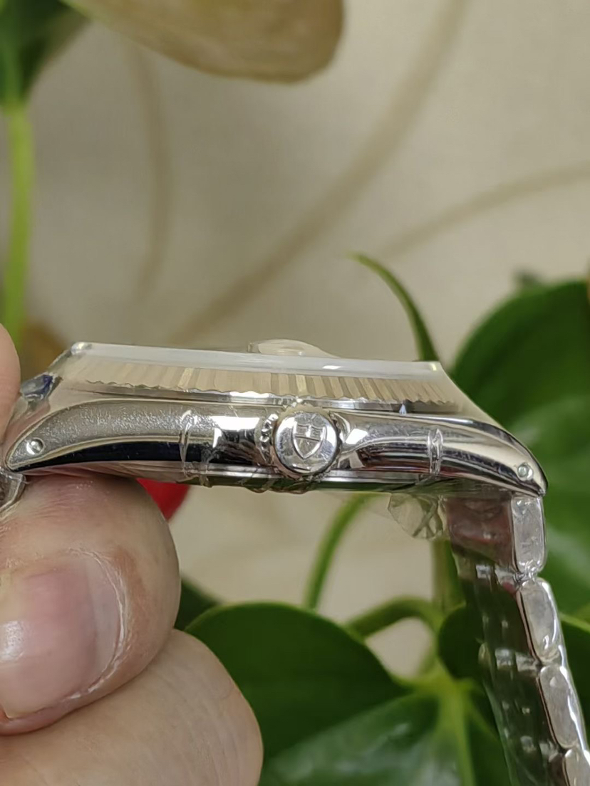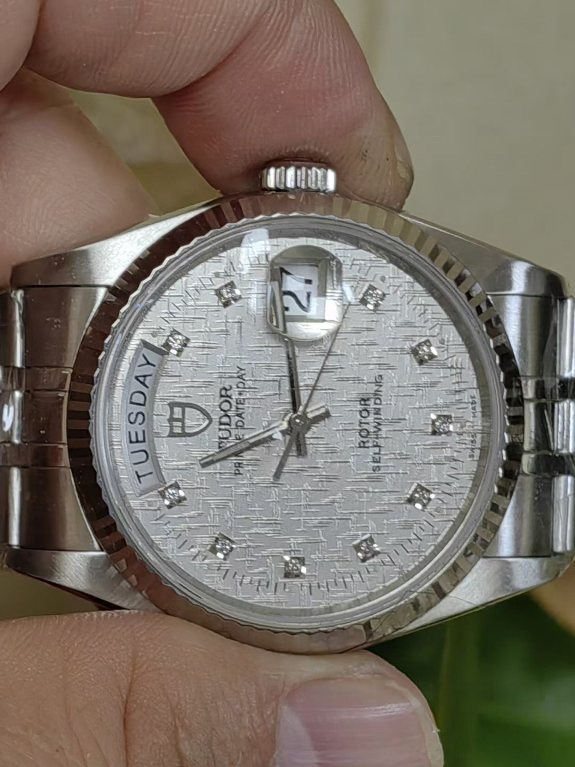春节期间套现放漏,原装正品二手帝舵76214王子系列男表,18K铂金牙圈,36表径星期日历显示,钻石刻度银布纹盘,锁底锁把100 米防水,腕周185表带16节,走时精准,单表新完美,专柜价31500元,假一罚三,第一手货源(保养好精翻好经过高温消毒,大家放心戴)
