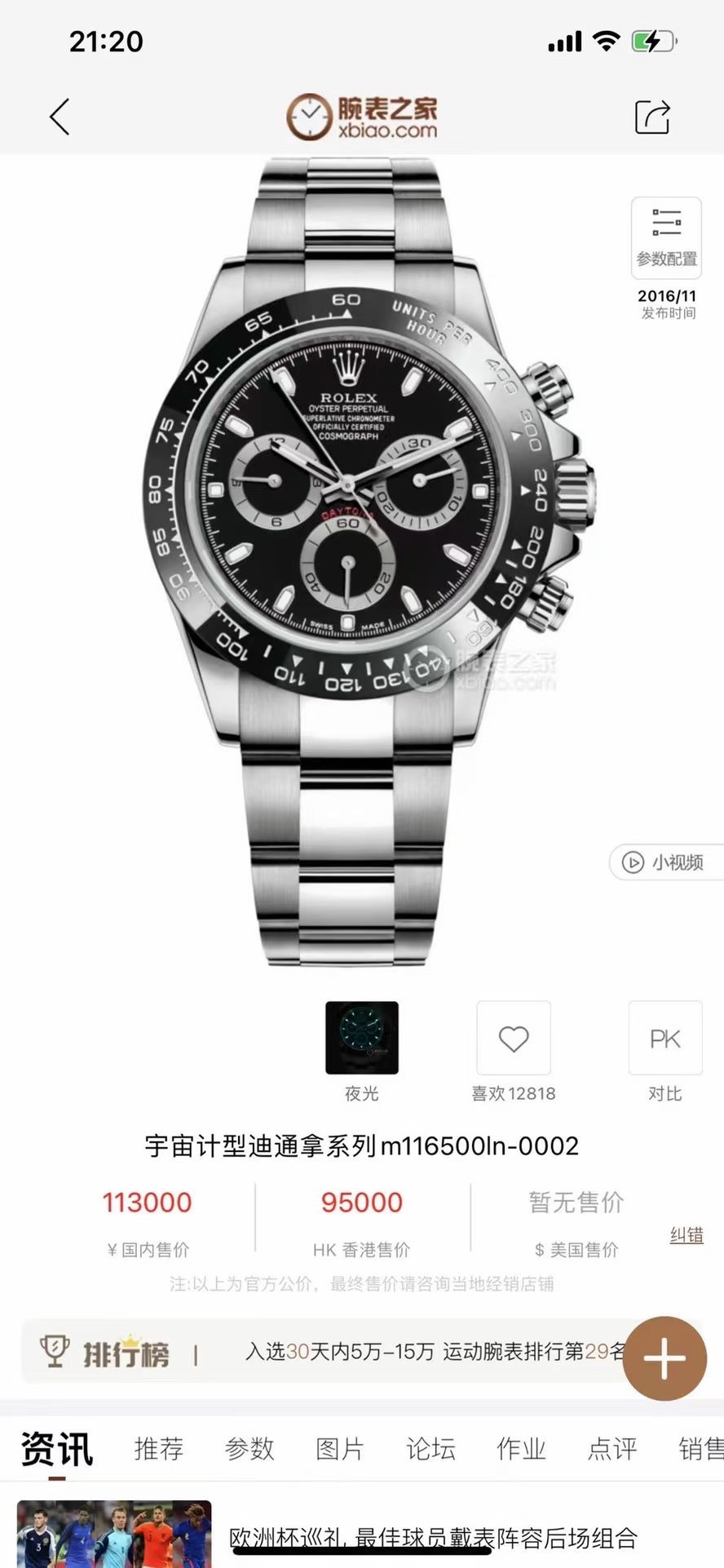 万表特征:自动机械男士 表径:40毫米 生活防水