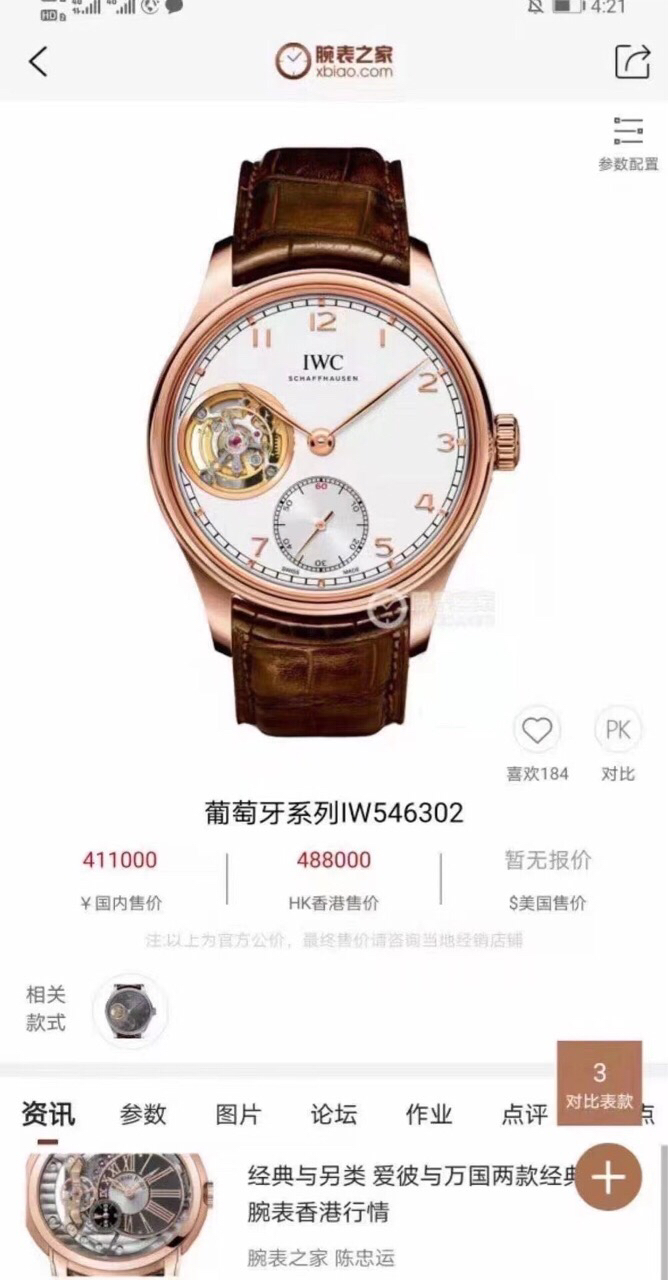 万国18k玫瑰金IW546302陀飞轮,公价488000元,表径43mm,设计经典奢华,手动几下陀飞轮,上手大气!